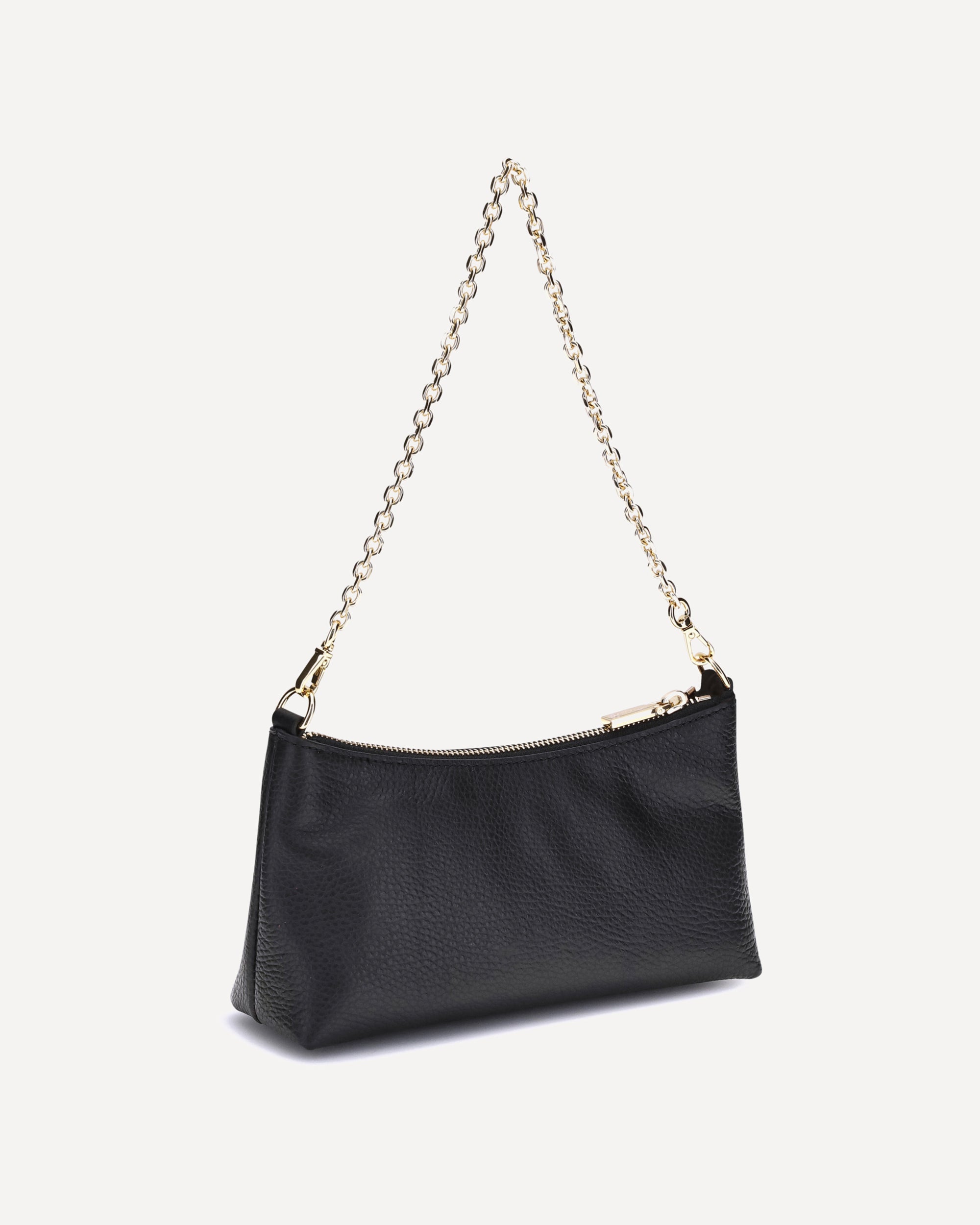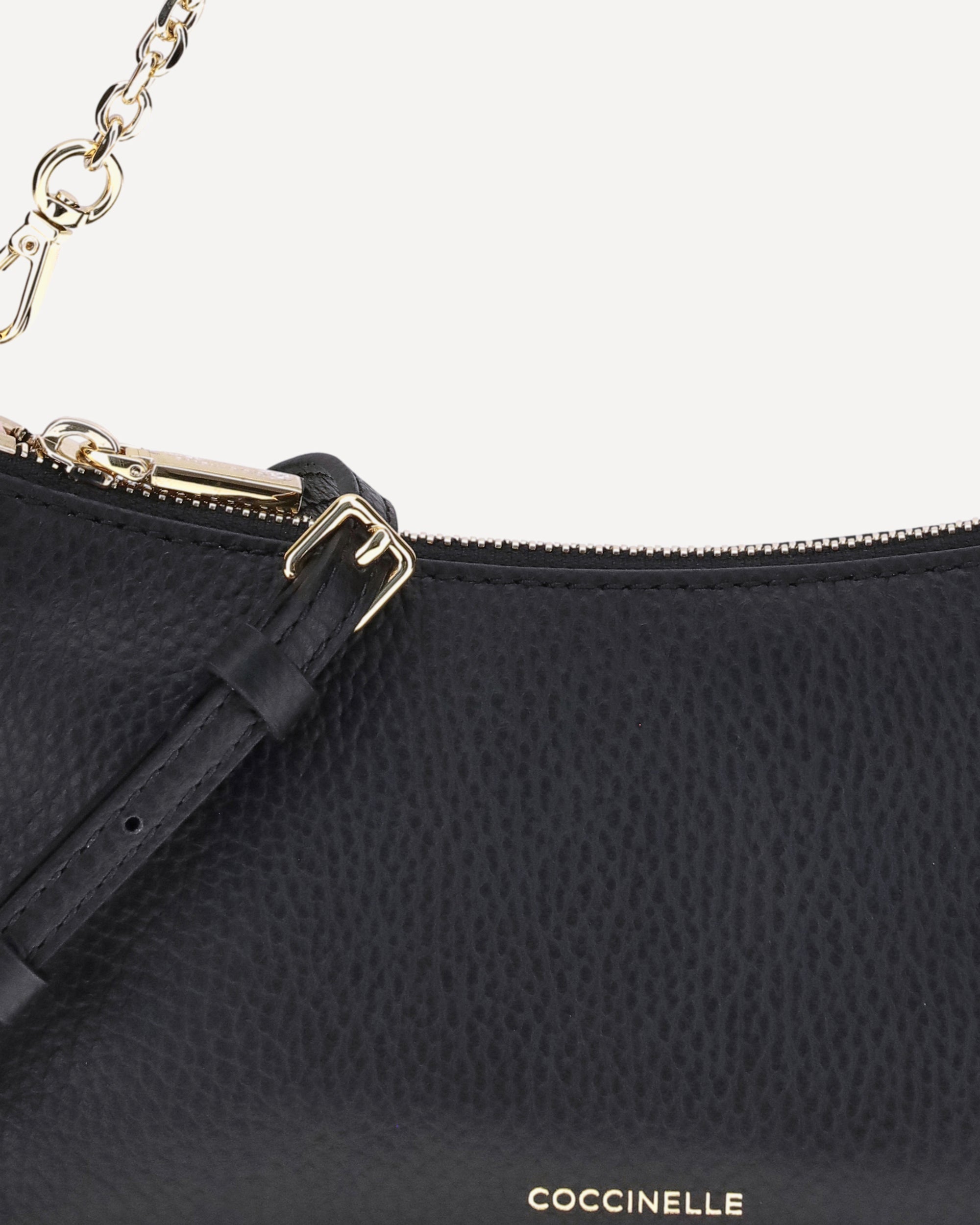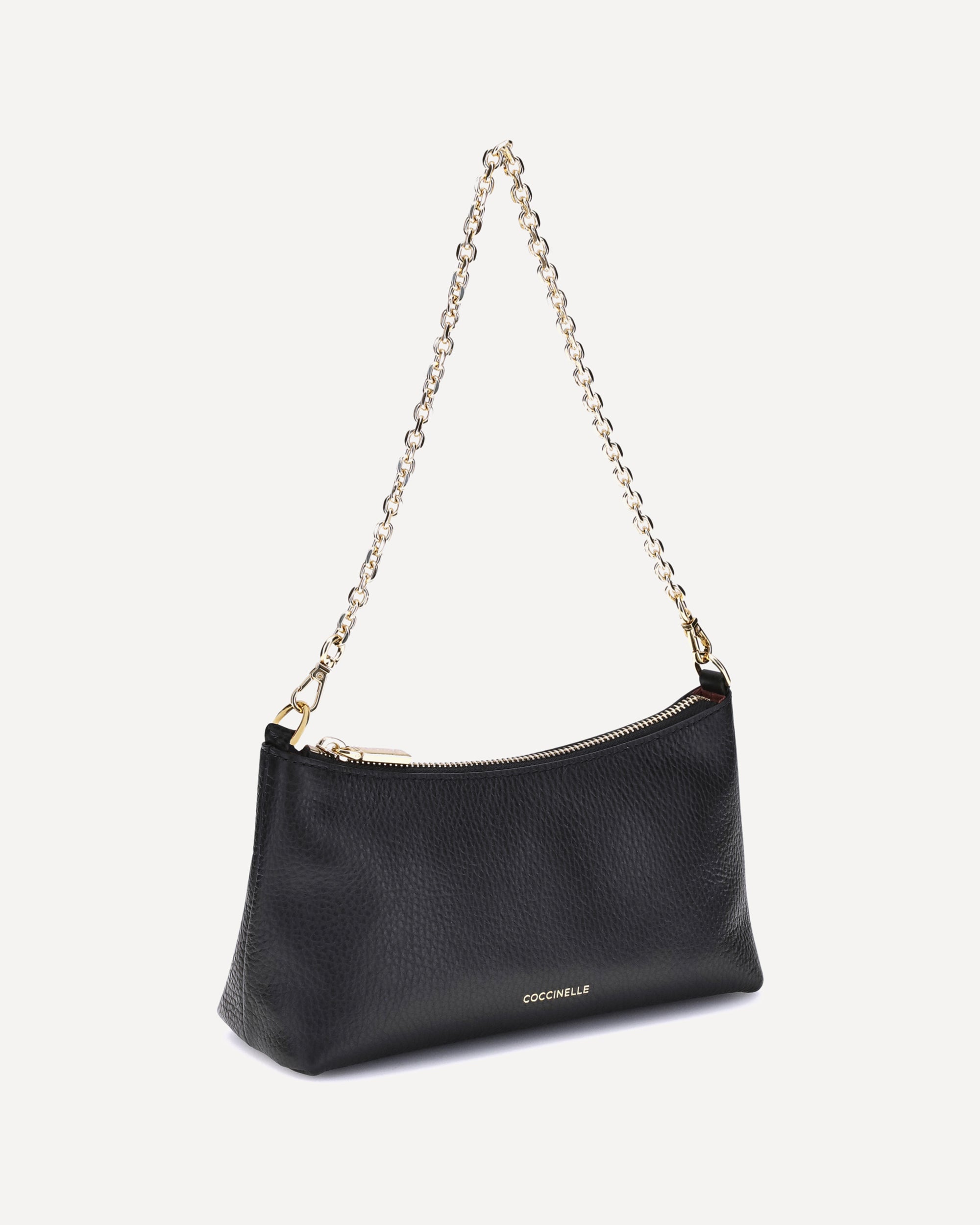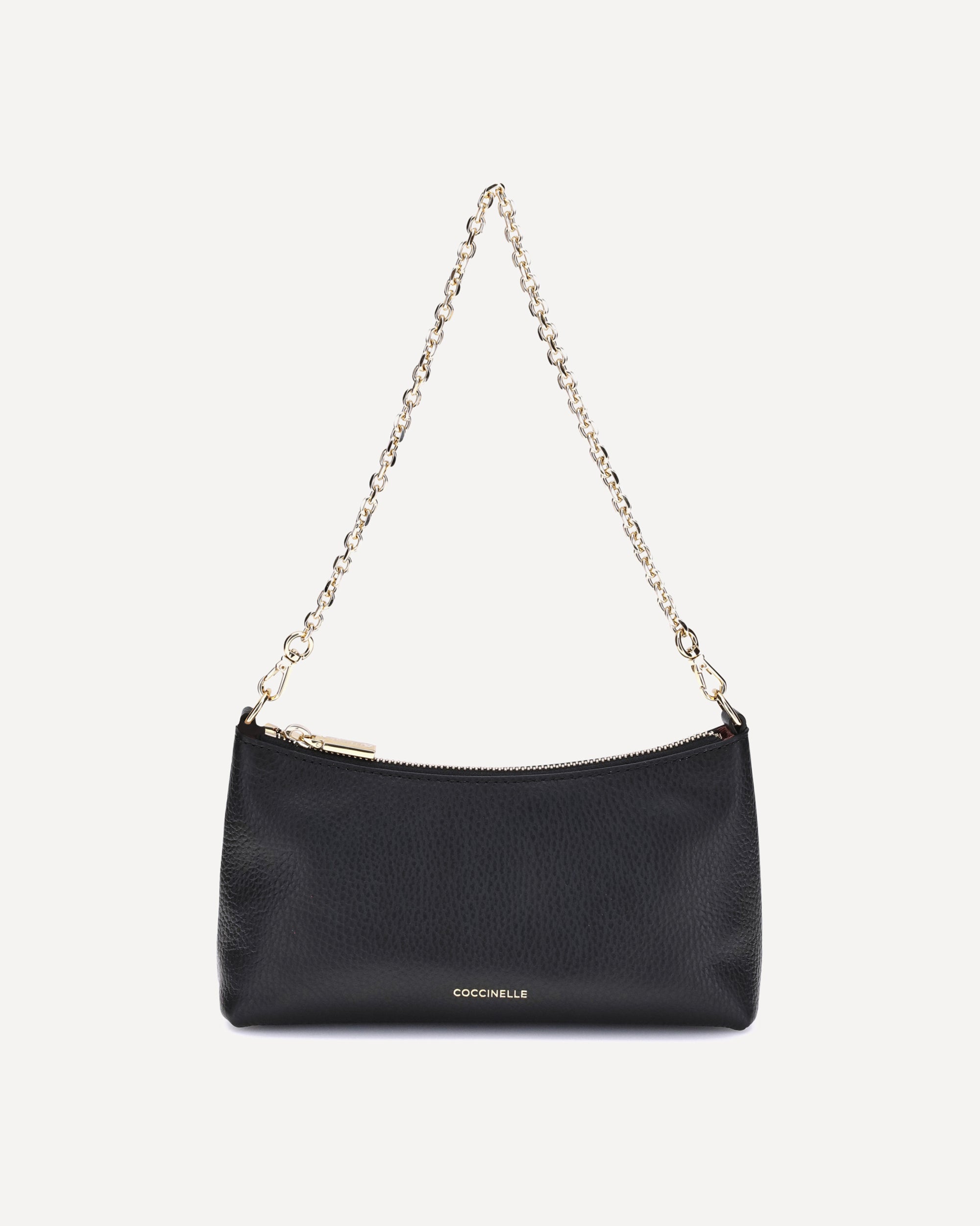 Coccinelle's Aura Clutch Bag is a compact and sophisticated accessory made of leather with natural grain that enhances its elegance. Featuring dual wearability, it can be worn on the shoulder thanks to the removable chain strap or crossbody with the leather shoulder strap, which is also removable and adjustable. The zippered closure ensures practicality, while the fabric interior and gold-stamped logo complete the design with a discreet yet refined touch of style.