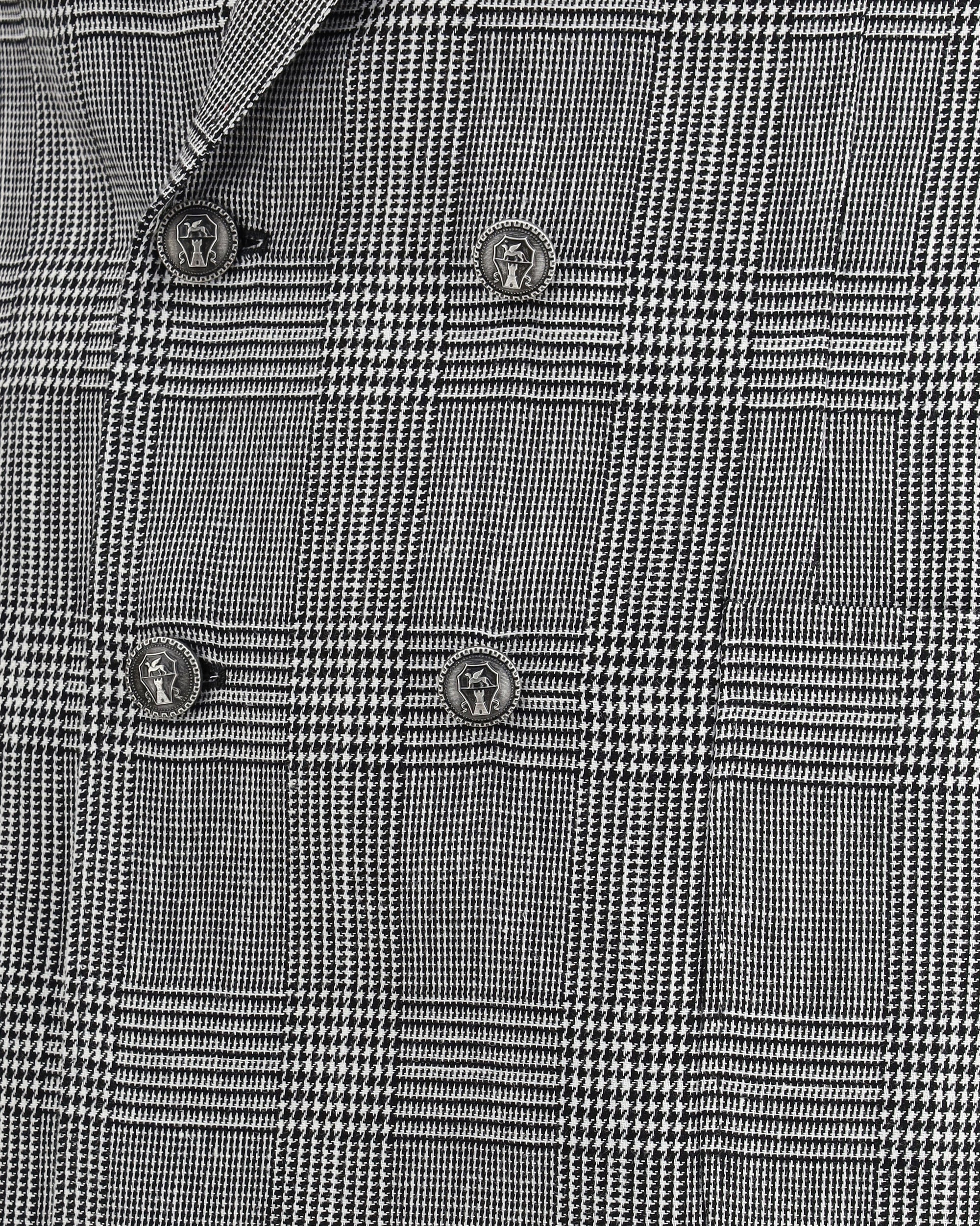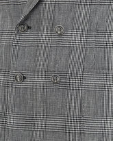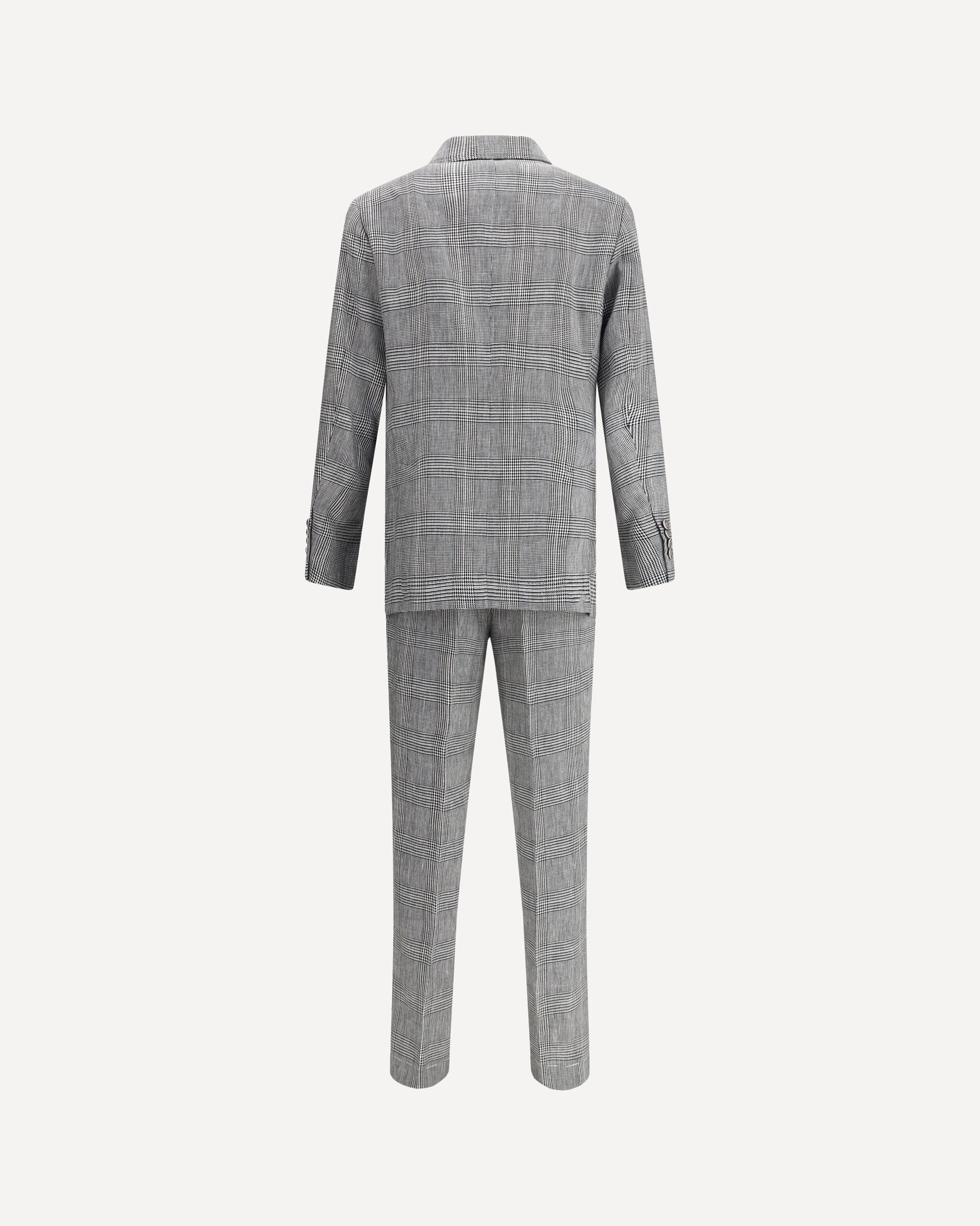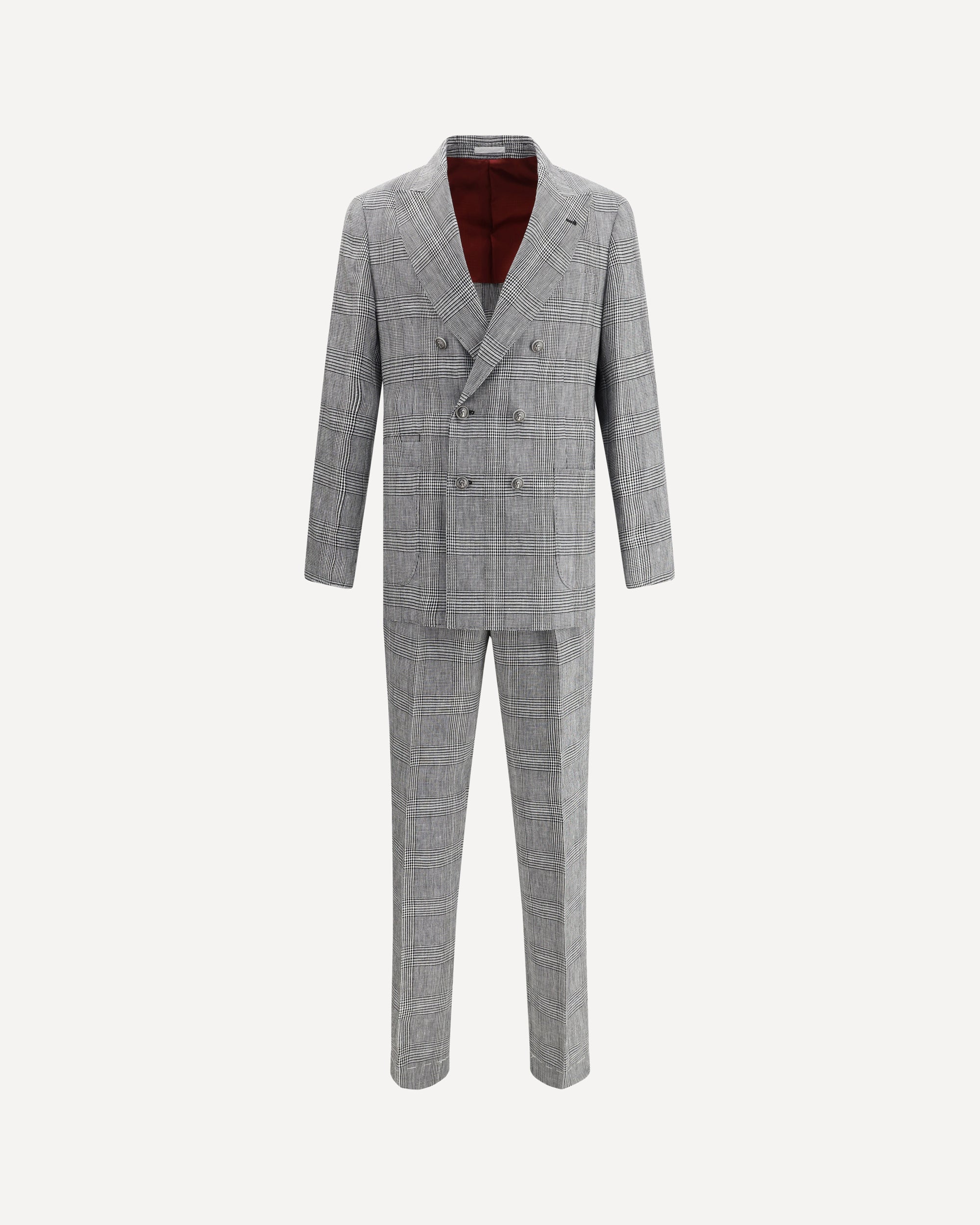Brunello Cucinelli's Cotton Linen Suit, consisting of a blazer and pants, is an elegant and sophisticated piece. The blazer jacket features a double-breasted front closure with embossed buttons, which add a distinctive touch. Three welt patch pockets on the front and a slit breast pocket complete the design, while the peaked lapels lend a refined silhouette. The classically cut pants have a front zipper and button closure, two side slash pockets and two welt pockets on the back, with belt loops at the waistband. The all-over check pattern gives a modern and versatile look, making this suit ideal for formal occasions or classy events, but also for a sophisticated daytime look.