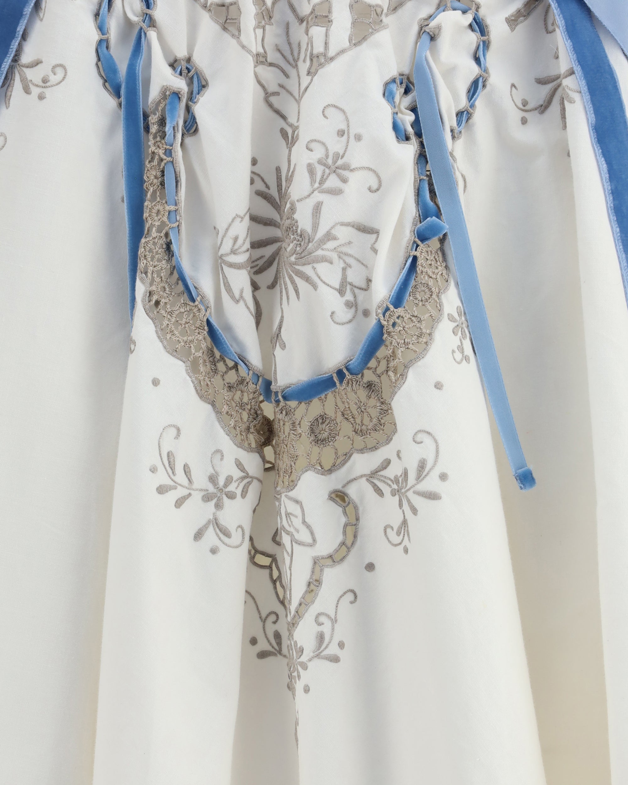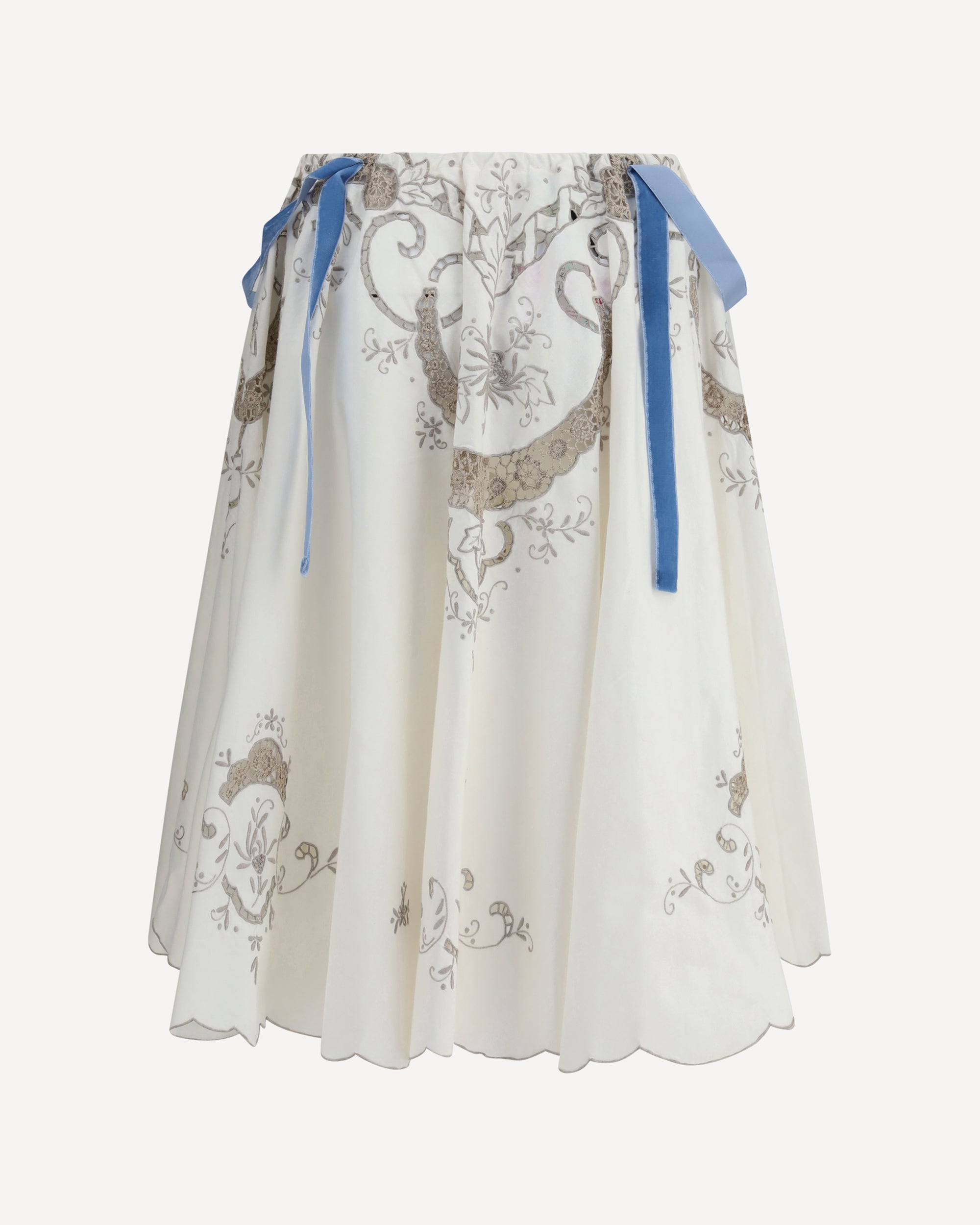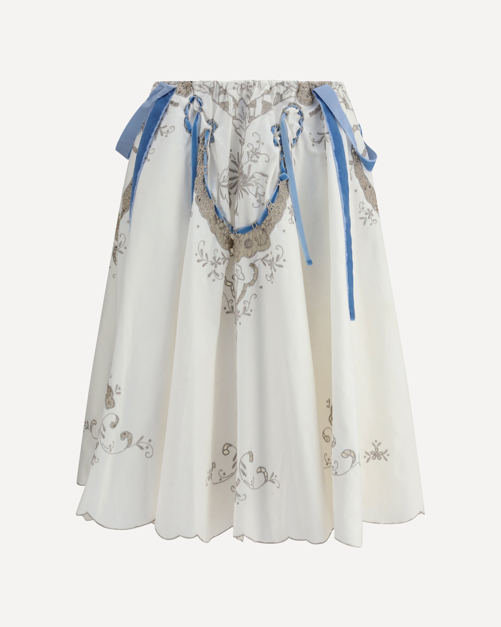 Ella's Cotton Midi Skirt is a refined and feminine piece with an elasticized waistband for comfort and a perfect fit. Delicate floral embellishments and velvet ribbons add a romantic touch, while the wavy hem and flared shape create a light, flowing silhouette. A must-have for those seeking an elegant and versatile look.