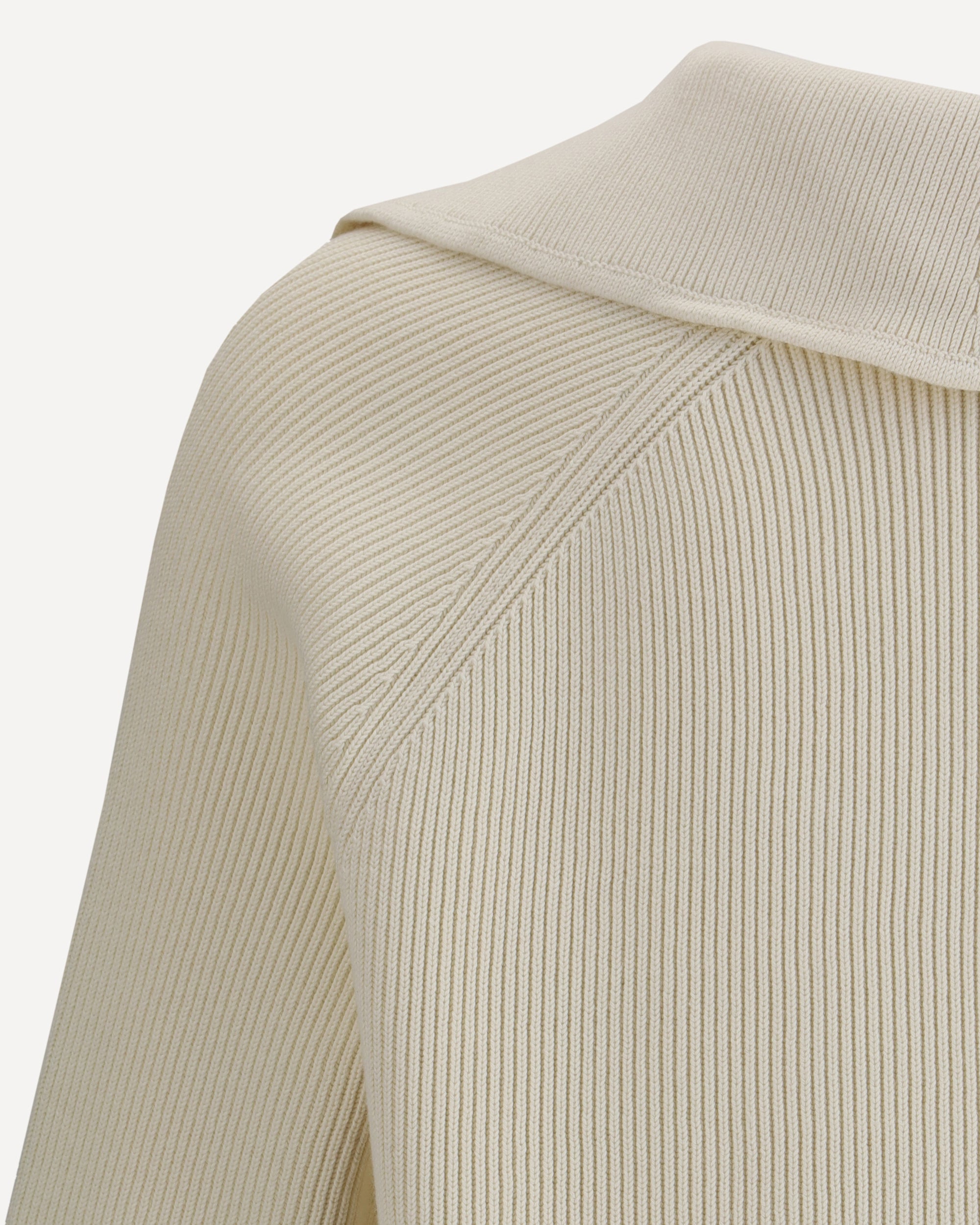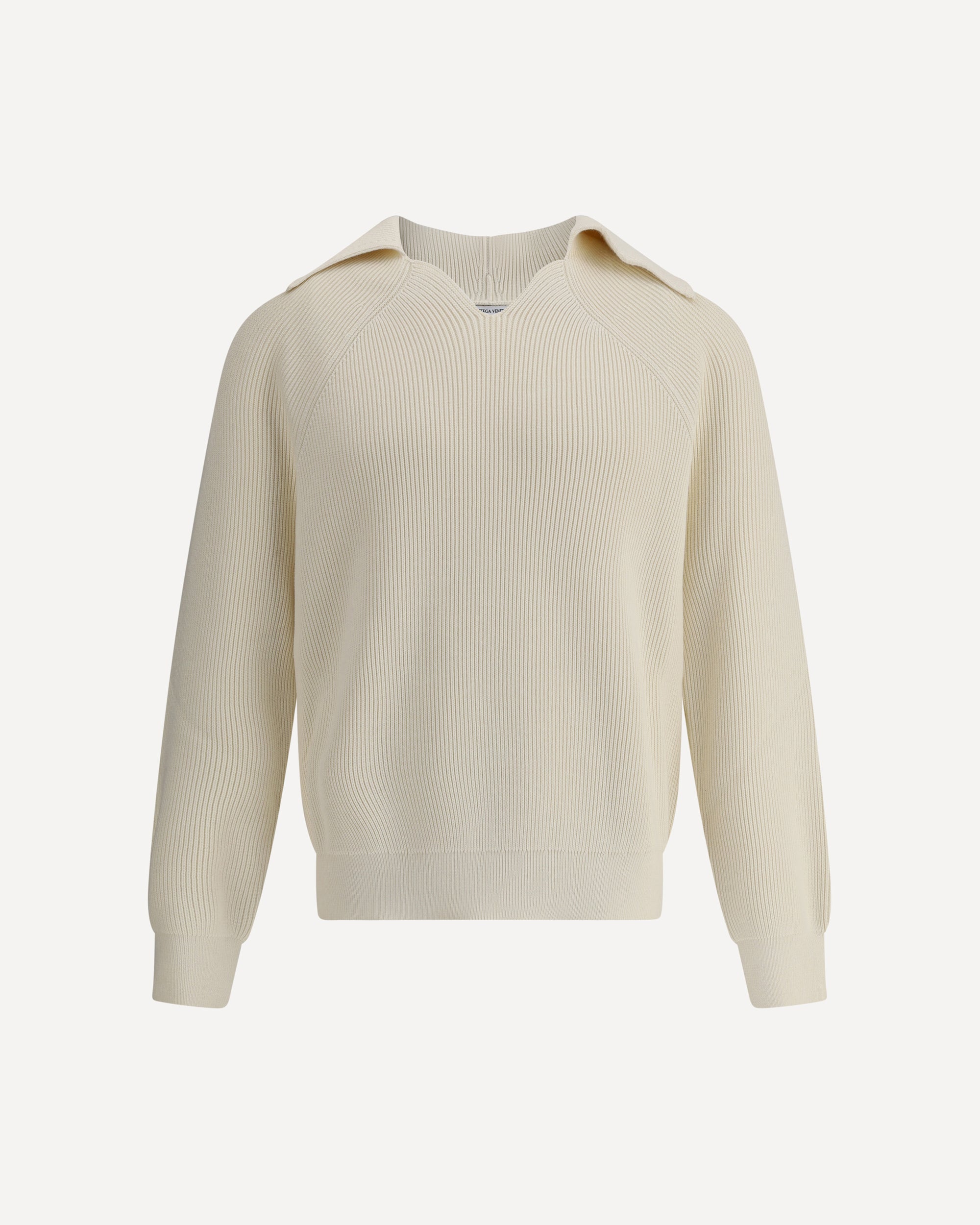 Bottega Veneta's cotton Sweater combines elegance and comfort with a sophisticated design. Made of pure cotton, it features a classic collar and a V-neck on the front, giving it a refined and timeless touch. The ribbed design wraps around the entire garment, enhancing its structure and giving depth to the fabric. Raglan sleeves ensure a comfortable and harmonious fit, while ribbed cuffs and hem ensure a perfect fit and definition.