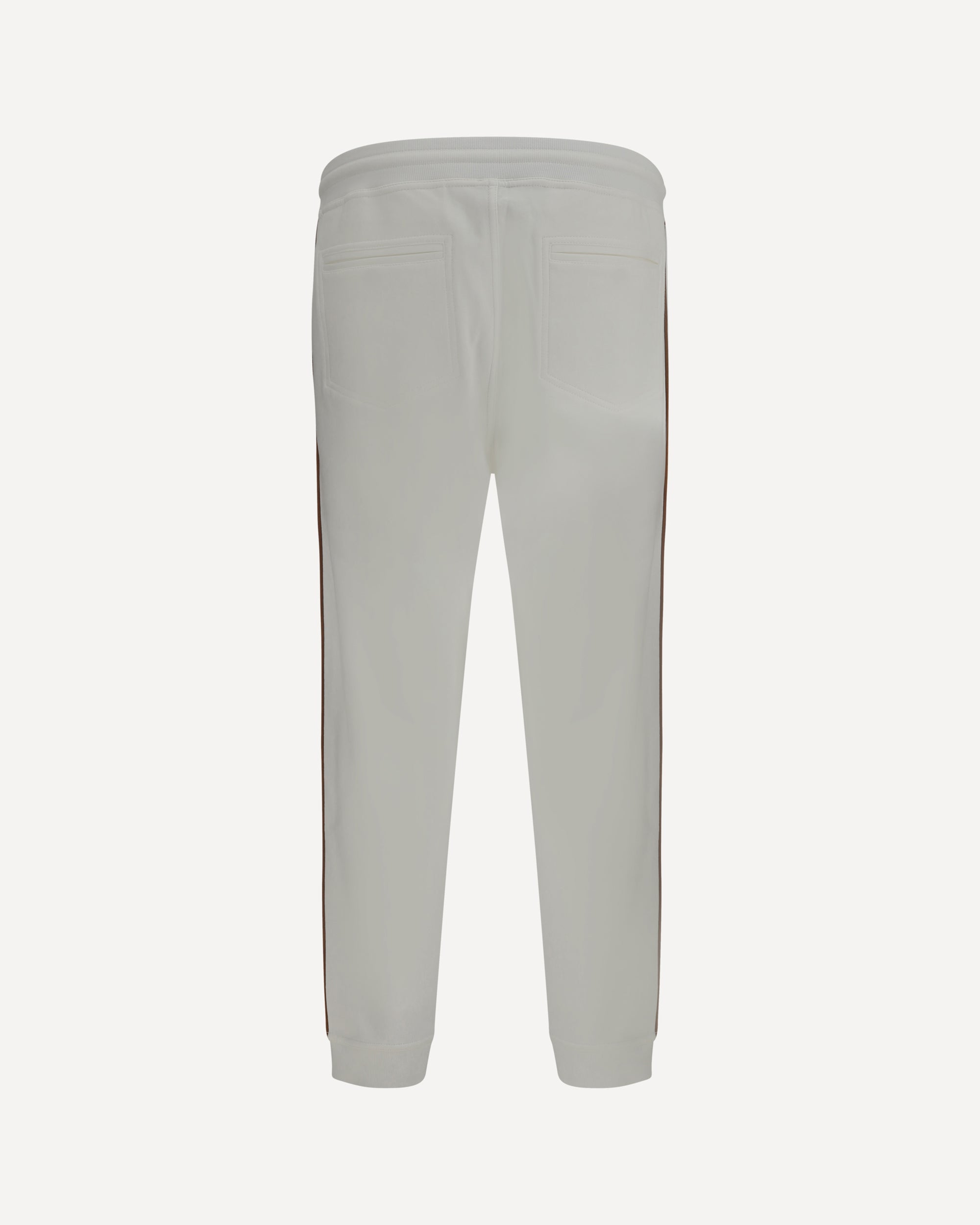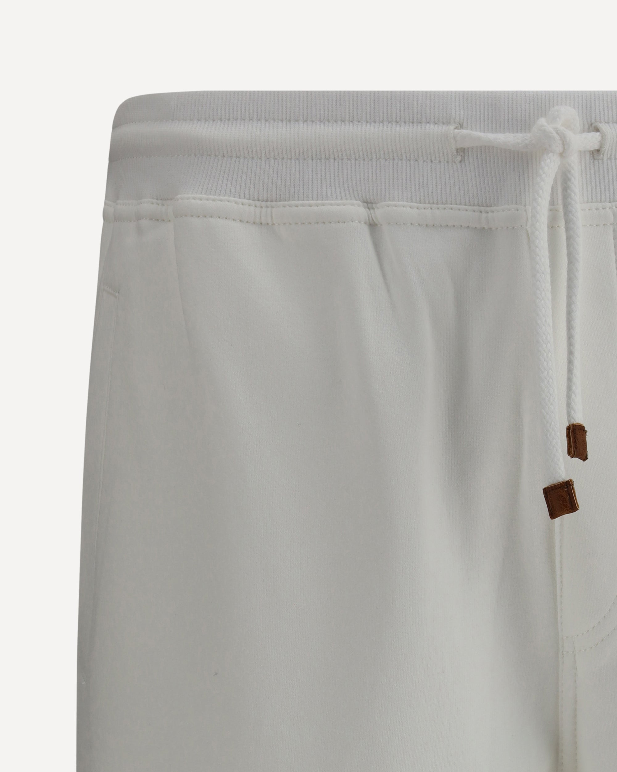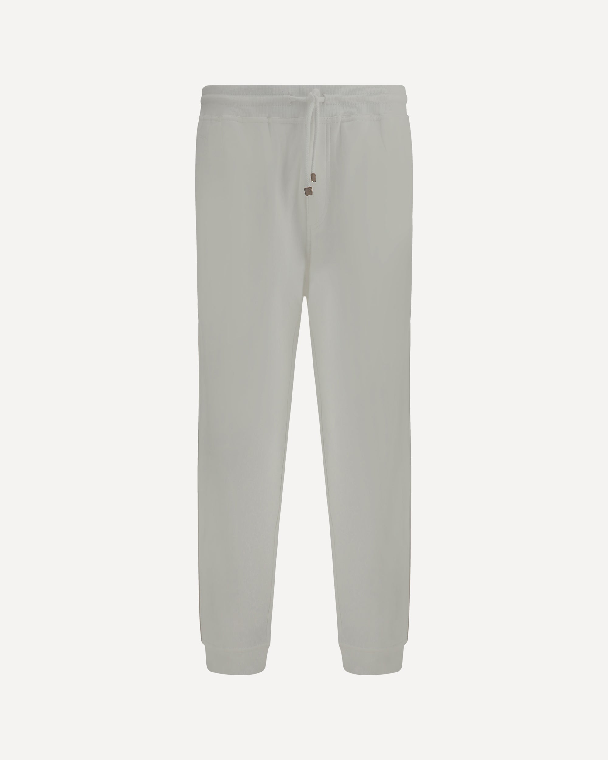 Cotton sweatpants by Brunello Cucinelli, made from a soft, comfortable material that combines the quality of cotton with a refined design. The elasticated waistband is adjustable via drawstring for a personalized and comfortable fit. The two side welt pockets offer practicality, while the two back slit pockets add an extra functional and stylish touch. Contrasting details on the side panel lend dynamism and a modern style accent, making these pants ideal for a casual yet sophisticated look.