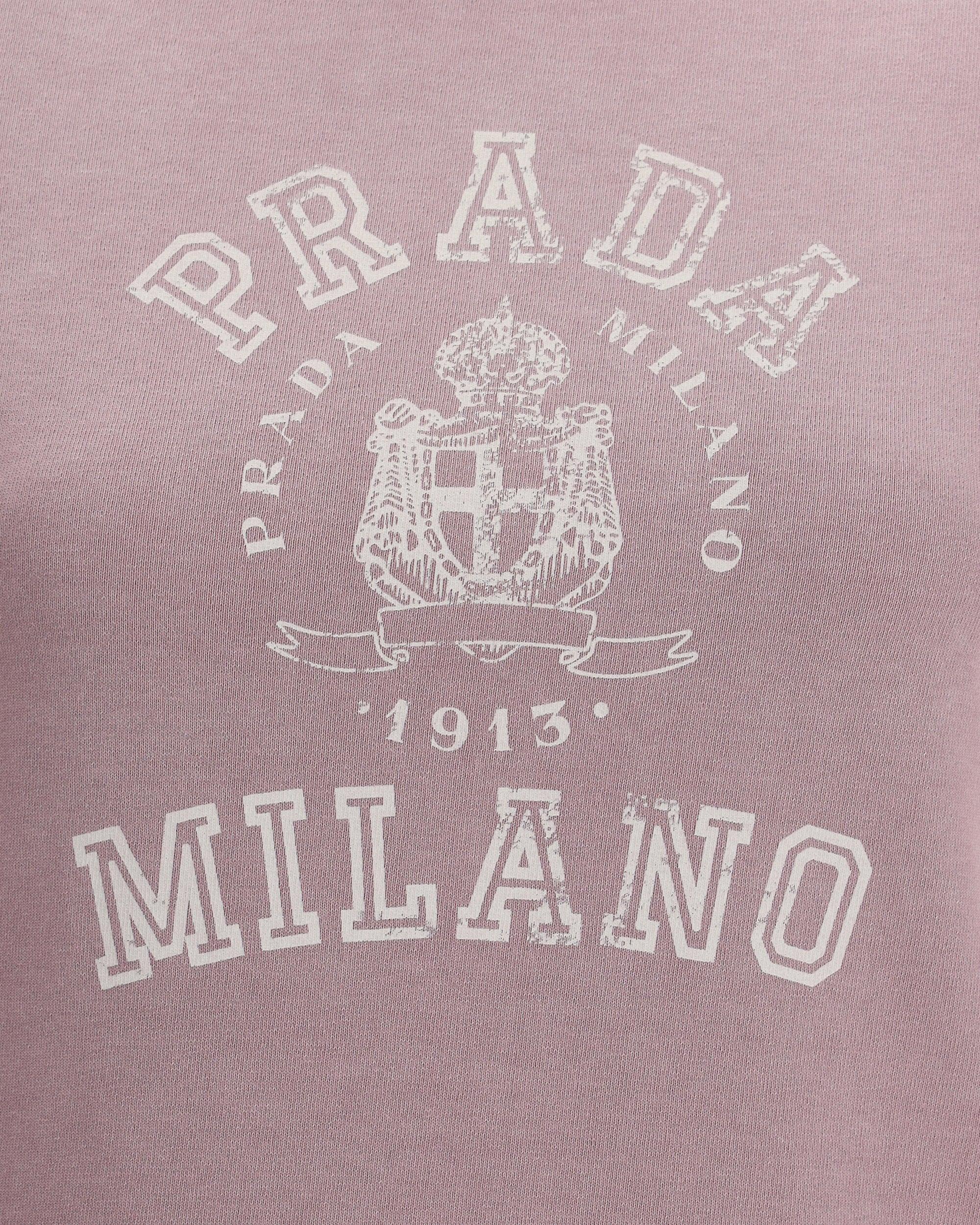 Prada's cotton T-shirt is a simple yet distinctive style. It features a ribbed crew neck and hem for a snug and comfortable fit. The brand's iconic logo printed in contrast on the front adds a recognizable touch of luxury. The worn vintage effect design gives the T-shirt a worn-in and unique look, perfect for a casual look but with a touch of character.