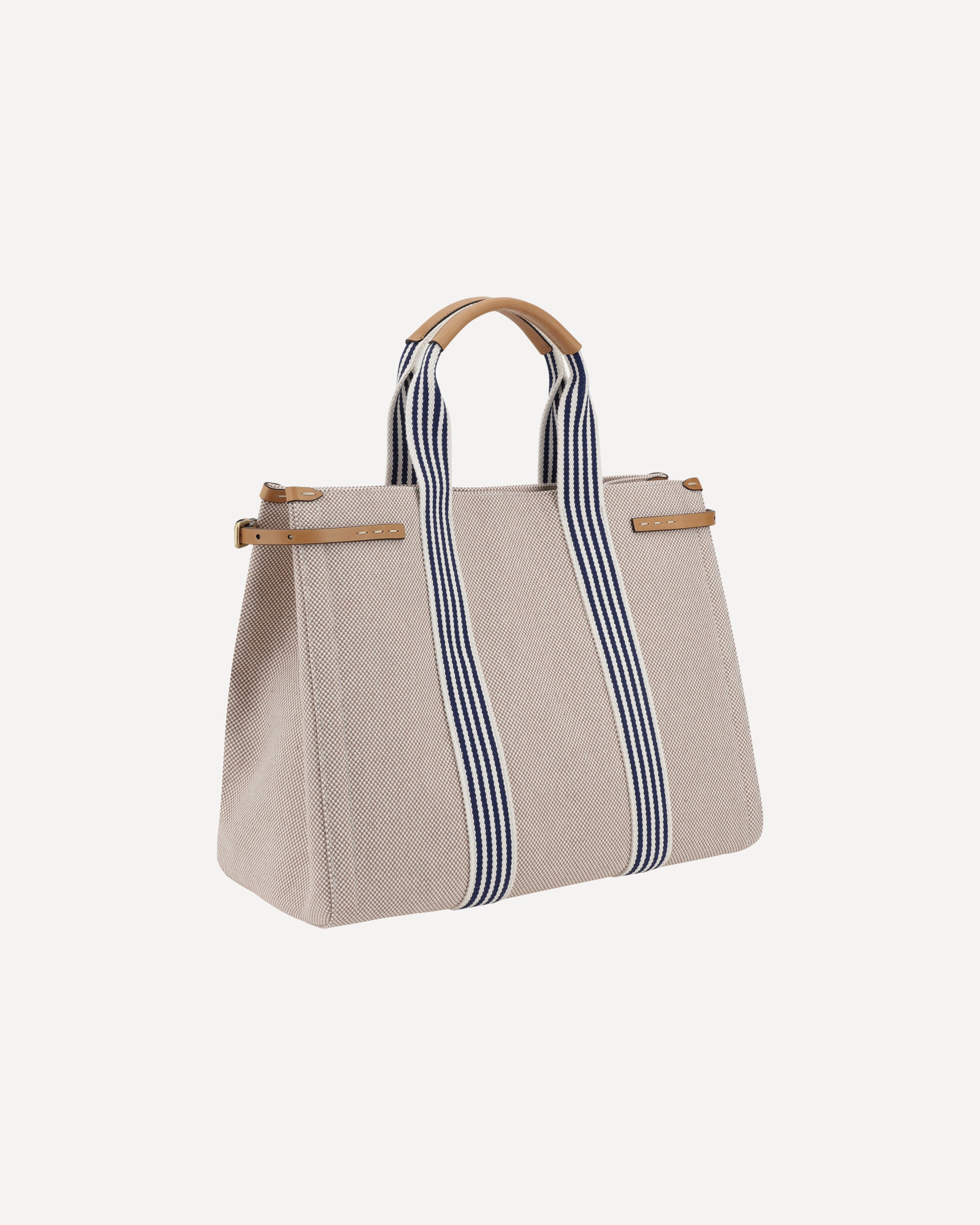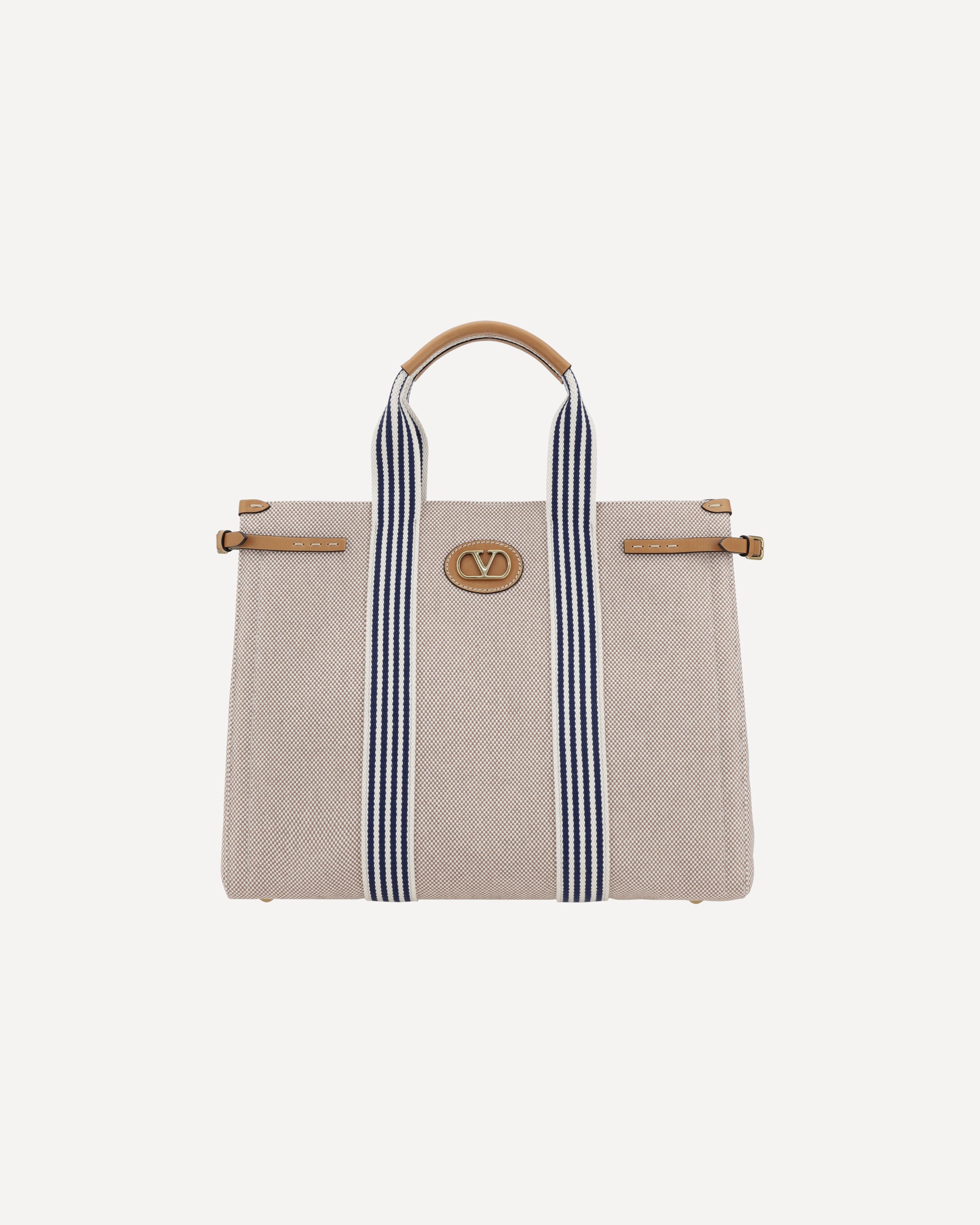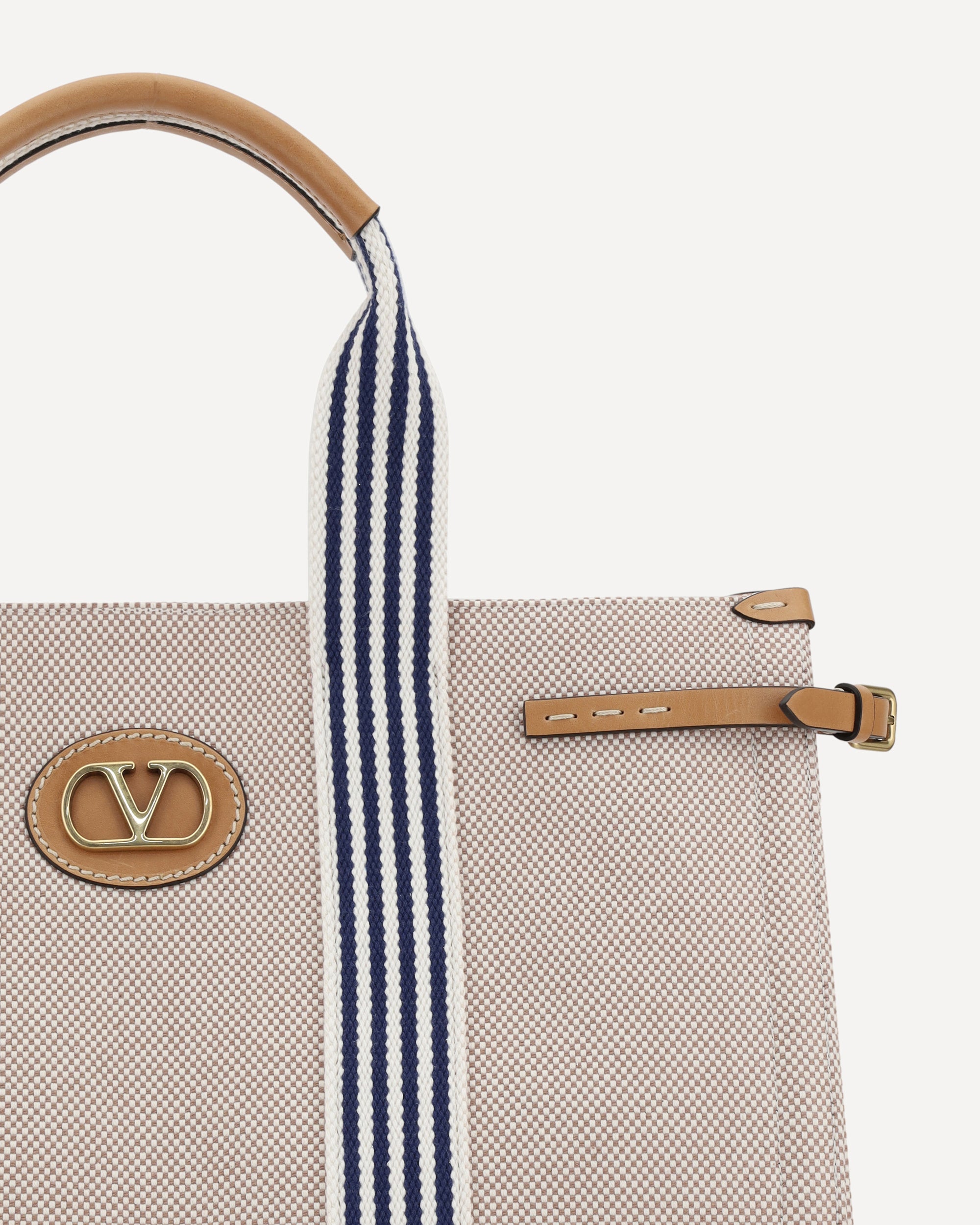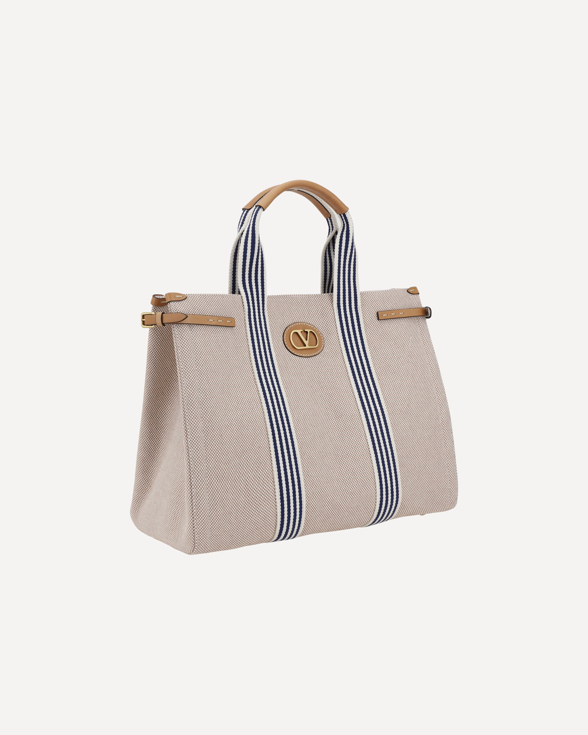 The Valentino Garavani cotton Tote Bag is a refined and functional design. The two top handles, extended over the panels, allow for convenient carrying, while adjustable straps with leather buckles on the side panels offer additional personalization. At the base, metal feet protect the bag and enhance its stability. The iconic applied logo plaque on the front adds a distinctive touch of elegance. The interior, with a single compartment, offers ample space to organize items with practicality.