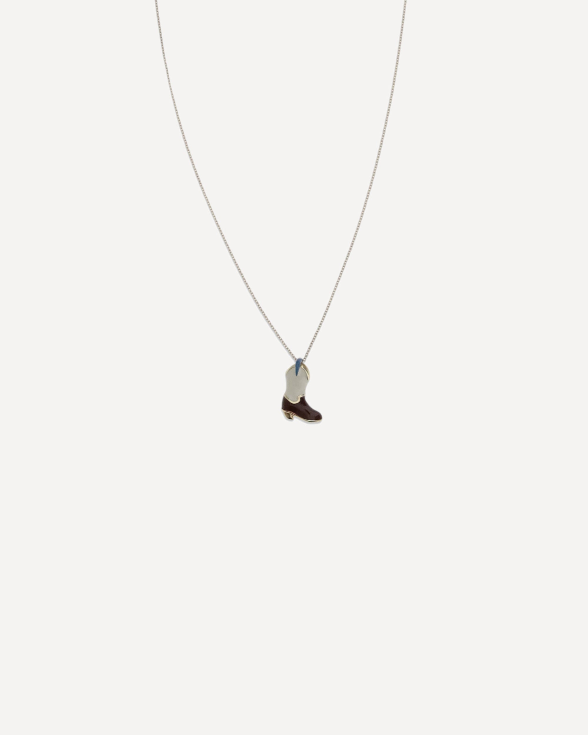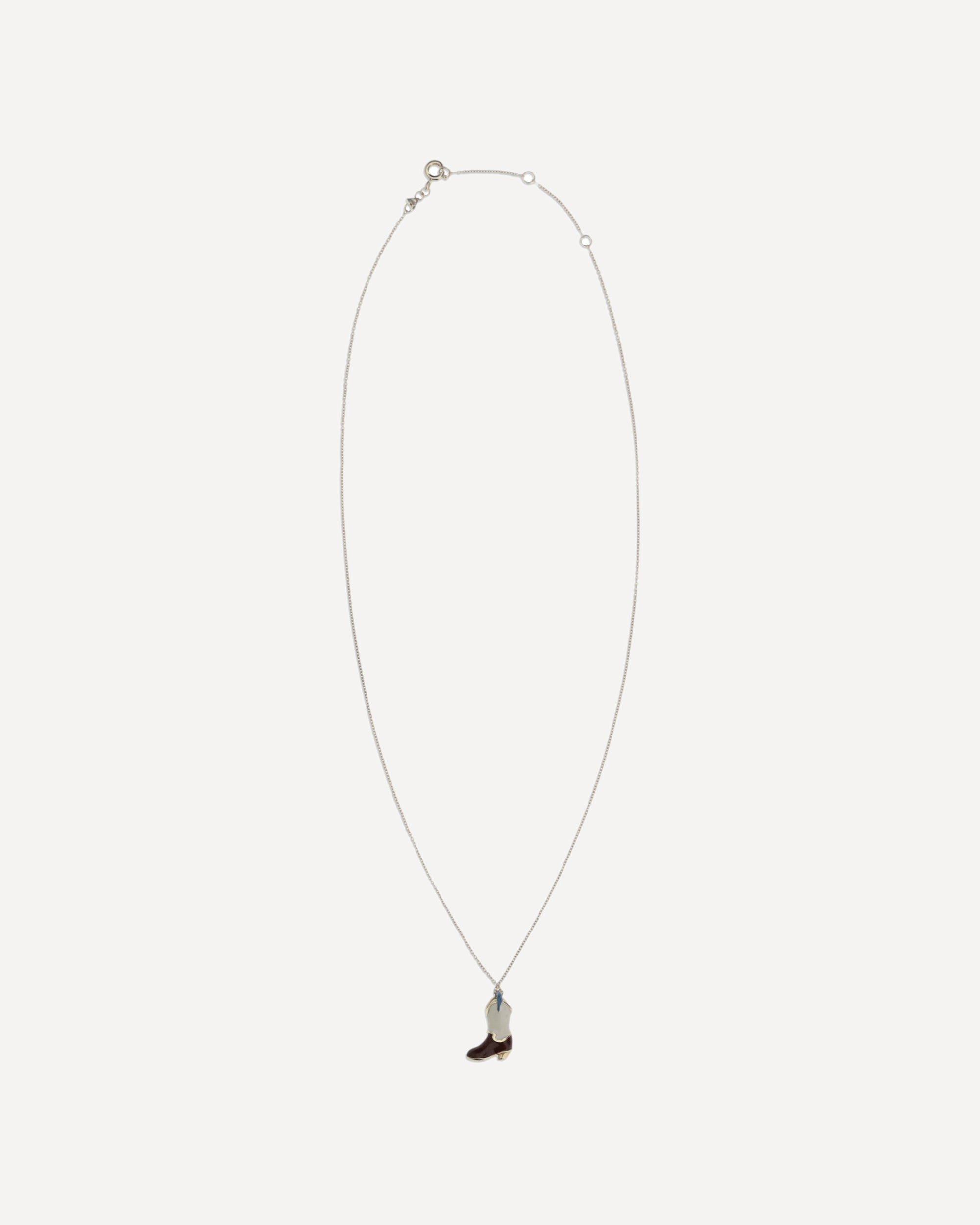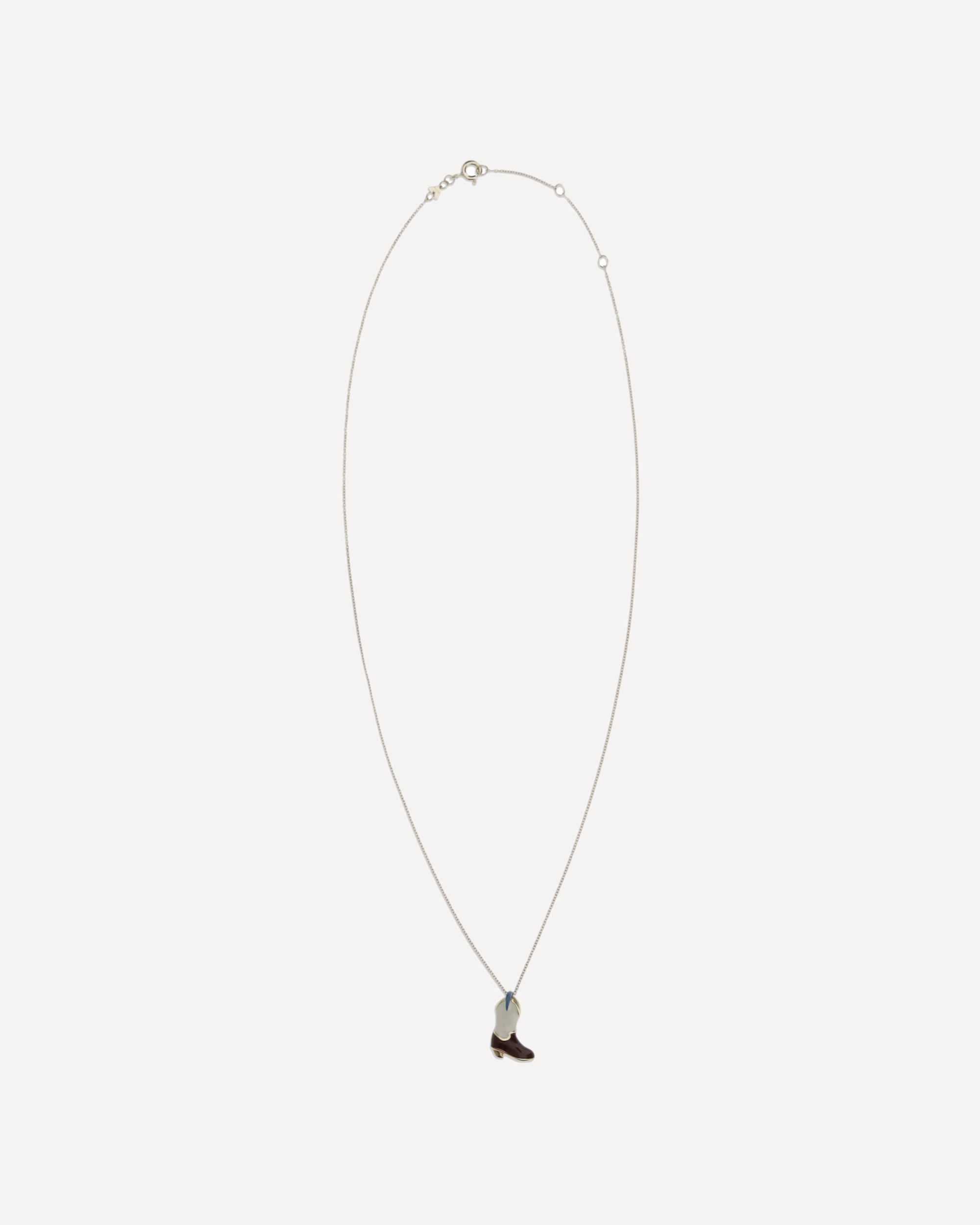 Cowboy Boot Necklace by Alita is a piece of jewelry with a playful and original character, perfect for those who want to add a touch of personality to their collection. Made of 9-karat yellow gold and hand-enameled, it features a rolò chain with a ring clasp, on which a pendant in the shape of a western boot stands out, small but rich in detail. An accessory that is both ironic and refined, designed for those who like to stand out lightly.
