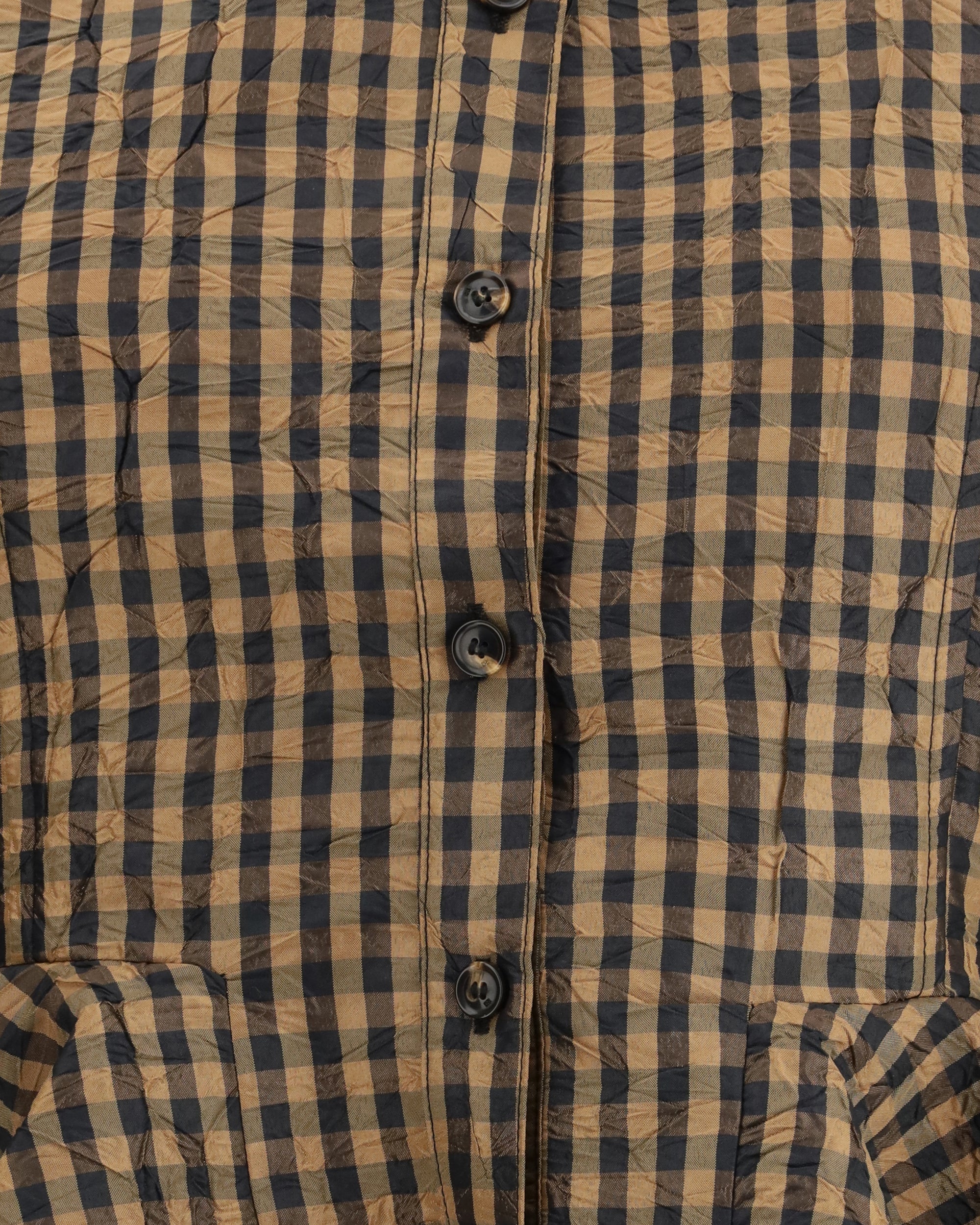 The Blouse in crinkled checked taffeta plays with volume through a graphic, modern elegance. A classic collar and button-front closure keep the line clean, while the silhouette opens into a refined peplum effect: the lower section flares like a sculpted mini skirt, with soft, tiered folds that add movement and subtly define the waist.