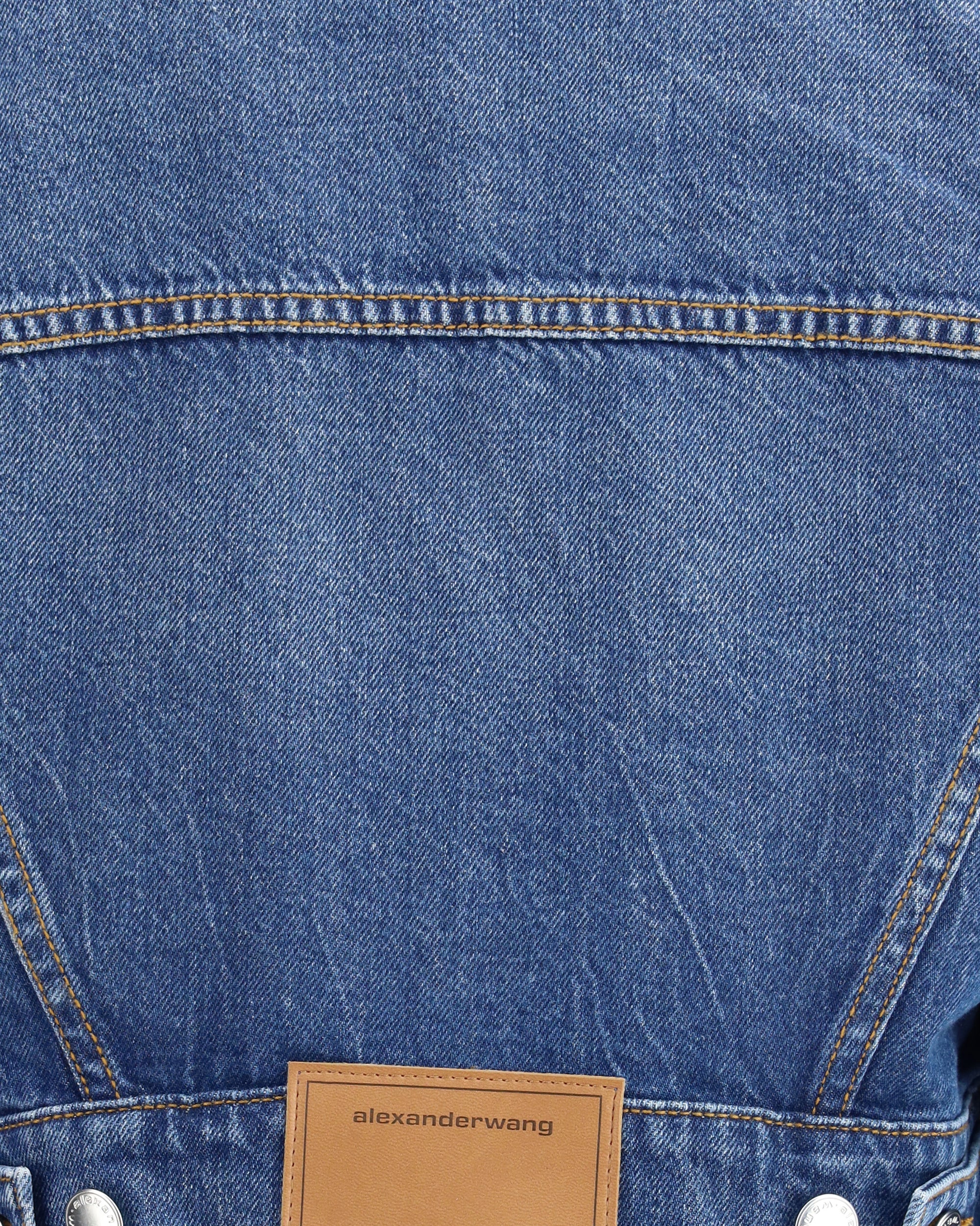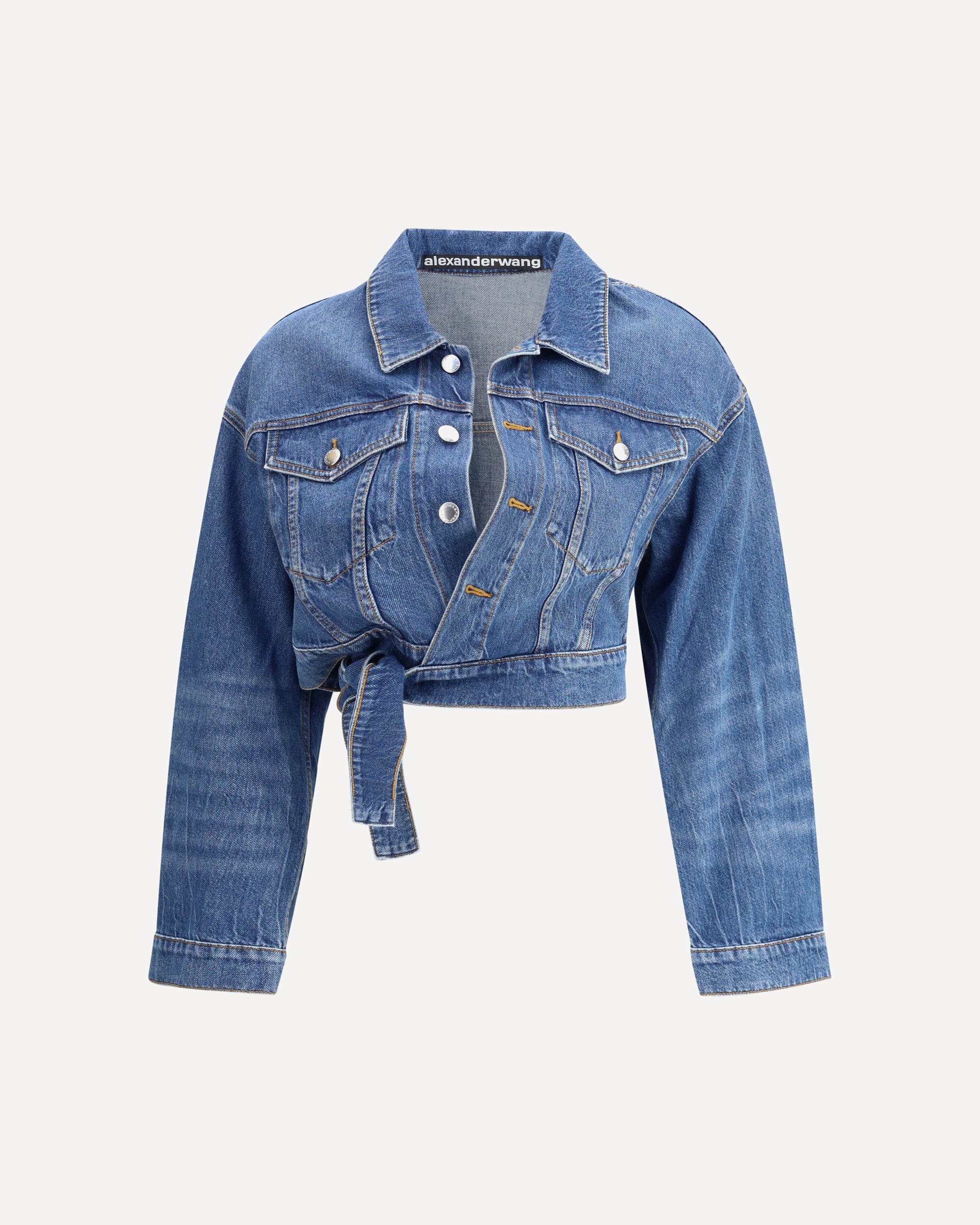 The Cropped Denim Jacket by Alexander Wang is a piece that blends contemporary style and versatility. The classic collar and front button closure give it a structured look, but the possibility of wearing it as a kimono with a tie sash offers a second style option, softer and more fluid. The two patch pockets on the front with flap add a practical and stylish detail. The cropped cut and denim material make this jacket perfect for those looking for a trendy piece, versatile and suitable for multiple occasions. A must-have for a modern and casual-chic look.