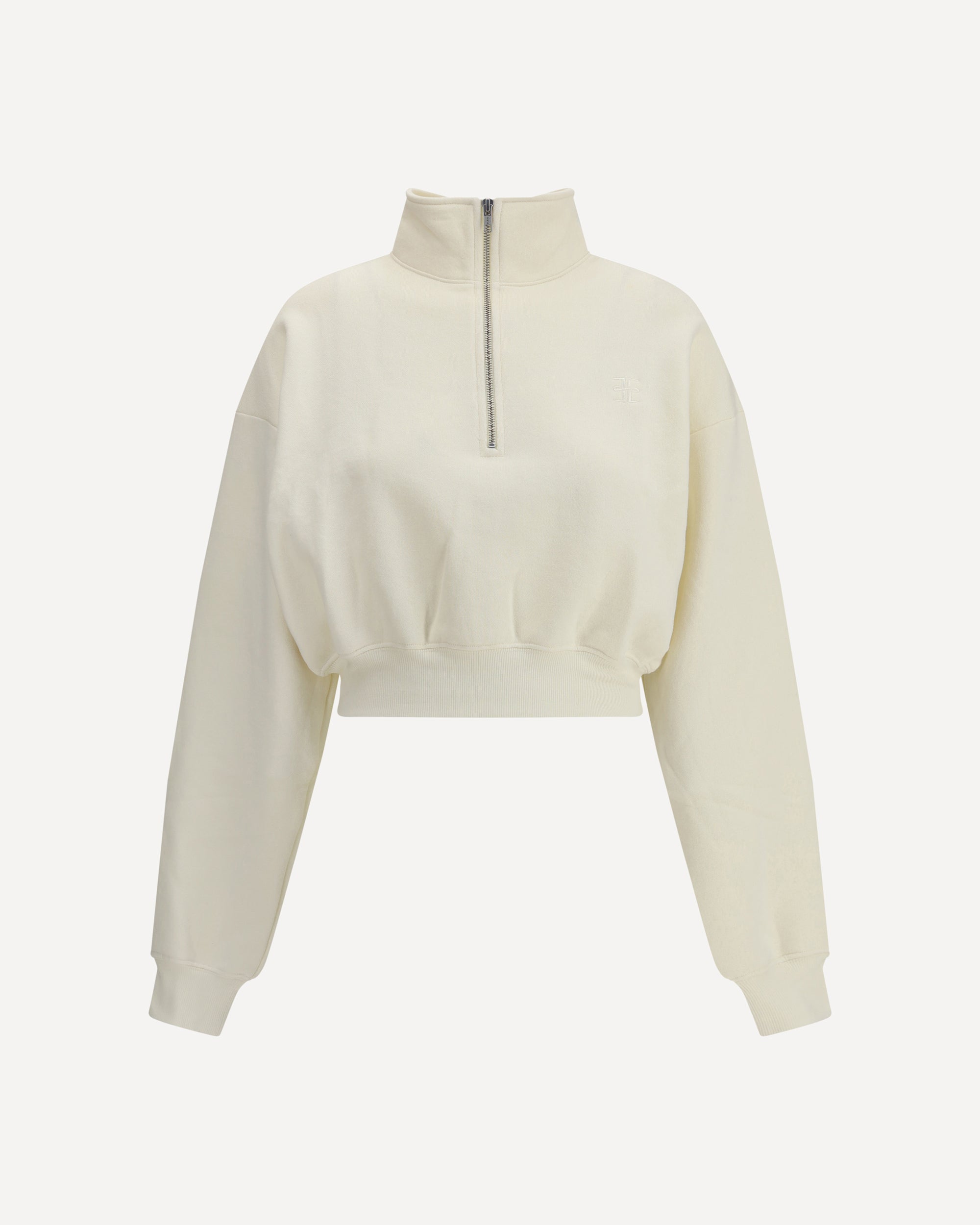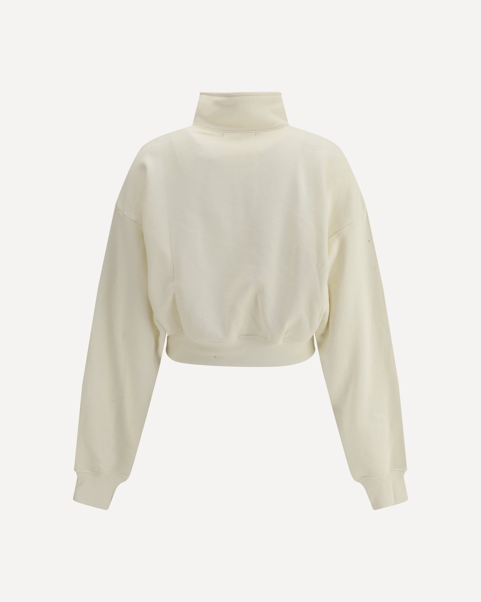 Éterne's Cropped Sweatshirt is a modern and versatile garment, perfect for a sporty yet stylish look. The front half-bust zipper closure allows for convenient adjustment and a dynamic touch to the design. The high neck offers comfort and protection, while the ribbed hem and cuffs ensure a defined and comfortable fit. The cropped cut adds a trendy element, making it ideal to pair with high-waisted pants or skirts.