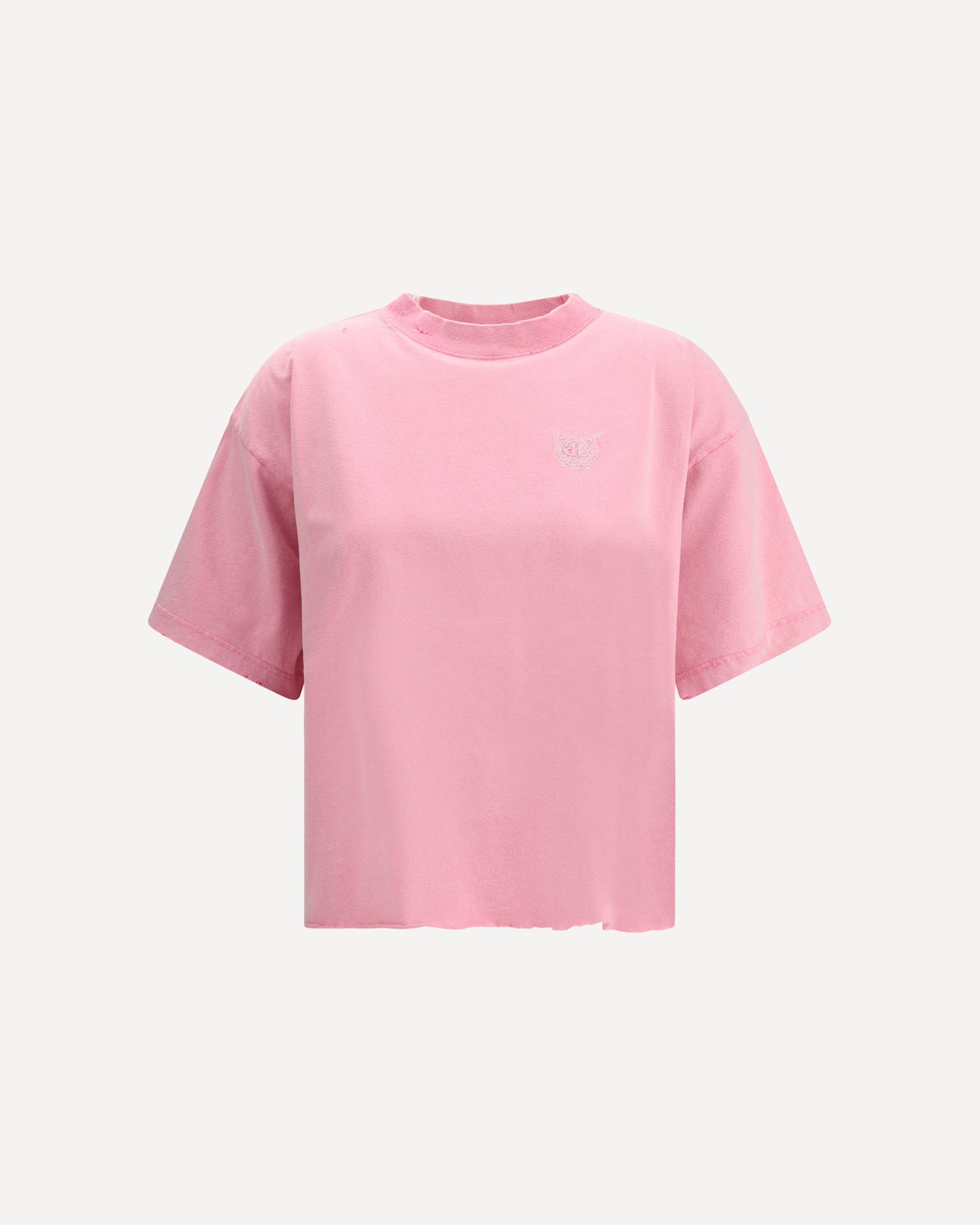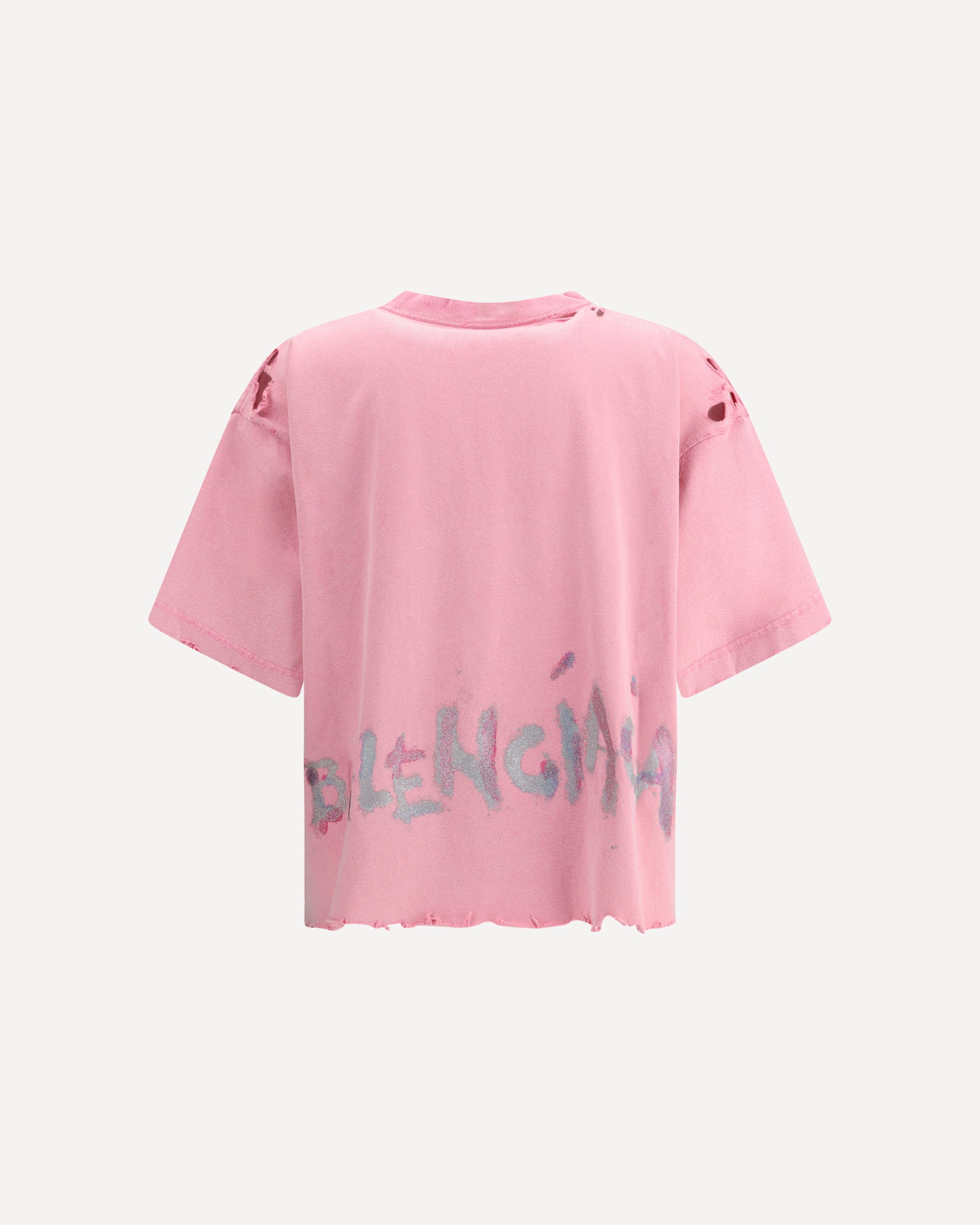 Balenciaga's cotton T-Shirt is a bold, modern piece that combines comfort and contemporary style. The cropped design with ribbed crew neck offers a chic and dynamic fit. The iconic embroidered logo on the front adds a recognizable touch, while the glitter monogram print on the back panel gives a bright and original effect. The destroyed treatment gives the T-shirt a worn-in look, adding a distinctive, urban character to the look.