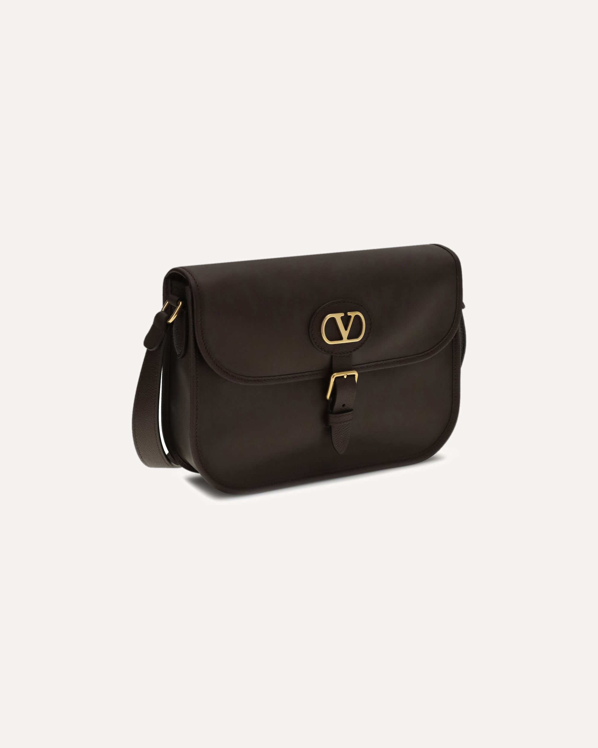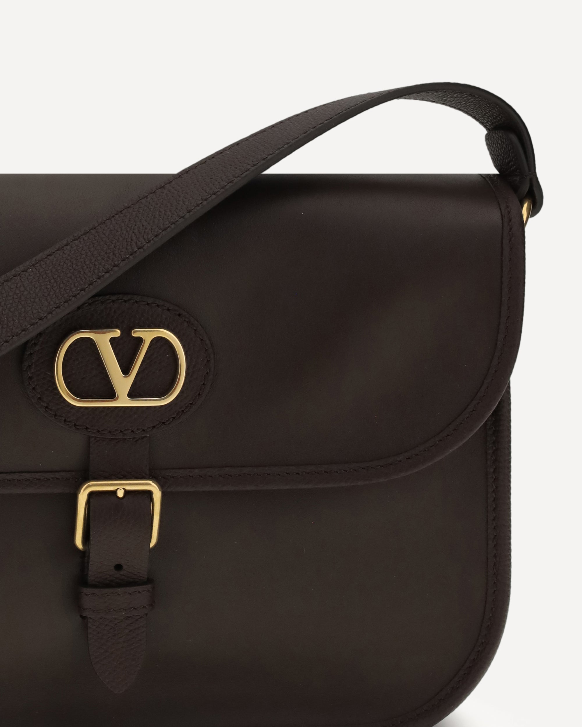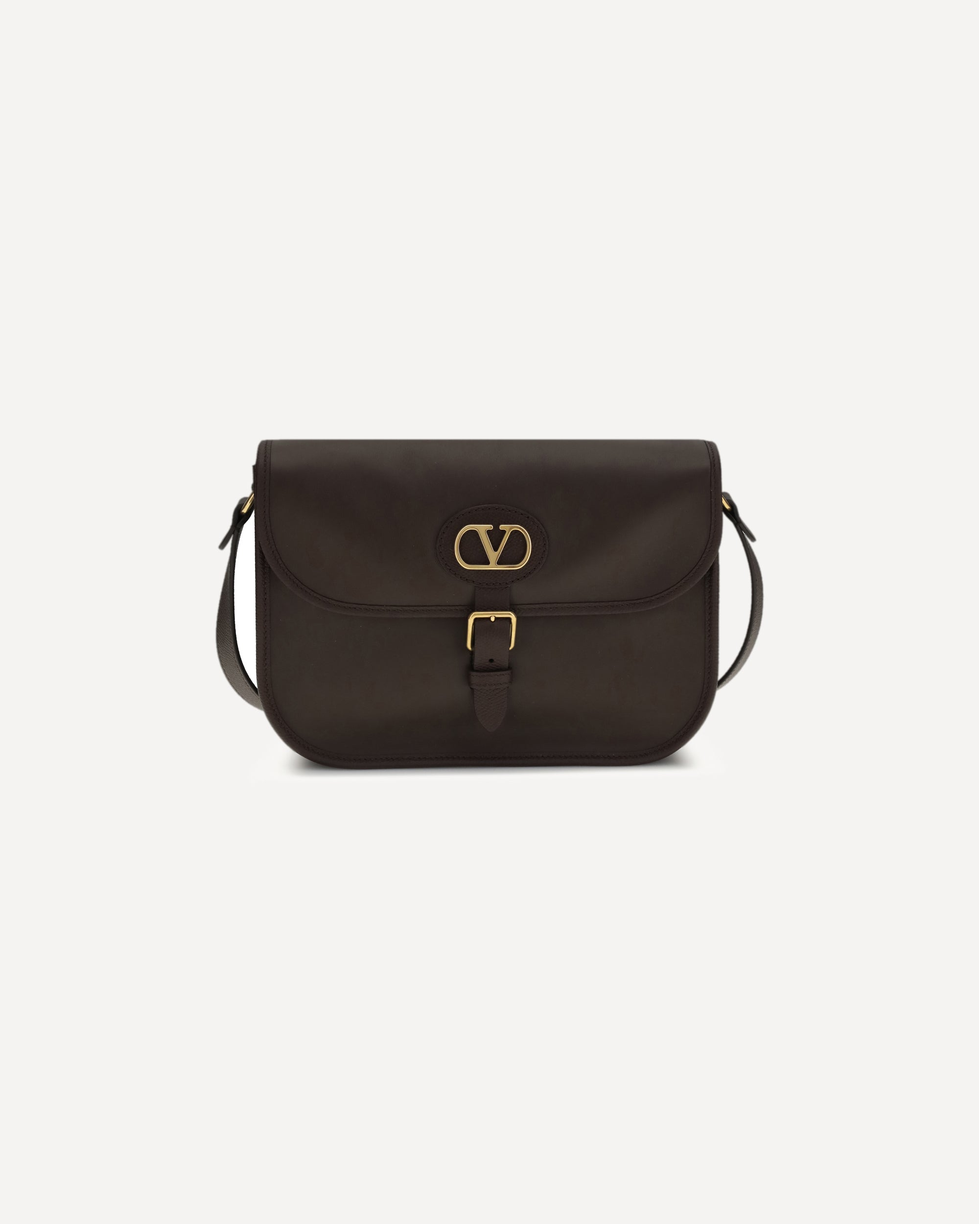 The Antibes Shoulder Bag by Valentino Garavani is crafted from calfskin and embellished with metallic VLogo detail on the flap. The adjustable tonal leather shoulder strap and magnetic button and strap closure provide practicality and security. The suede interior offers a zippered pocket and two dedicated card slots, combining elegance and functionality.