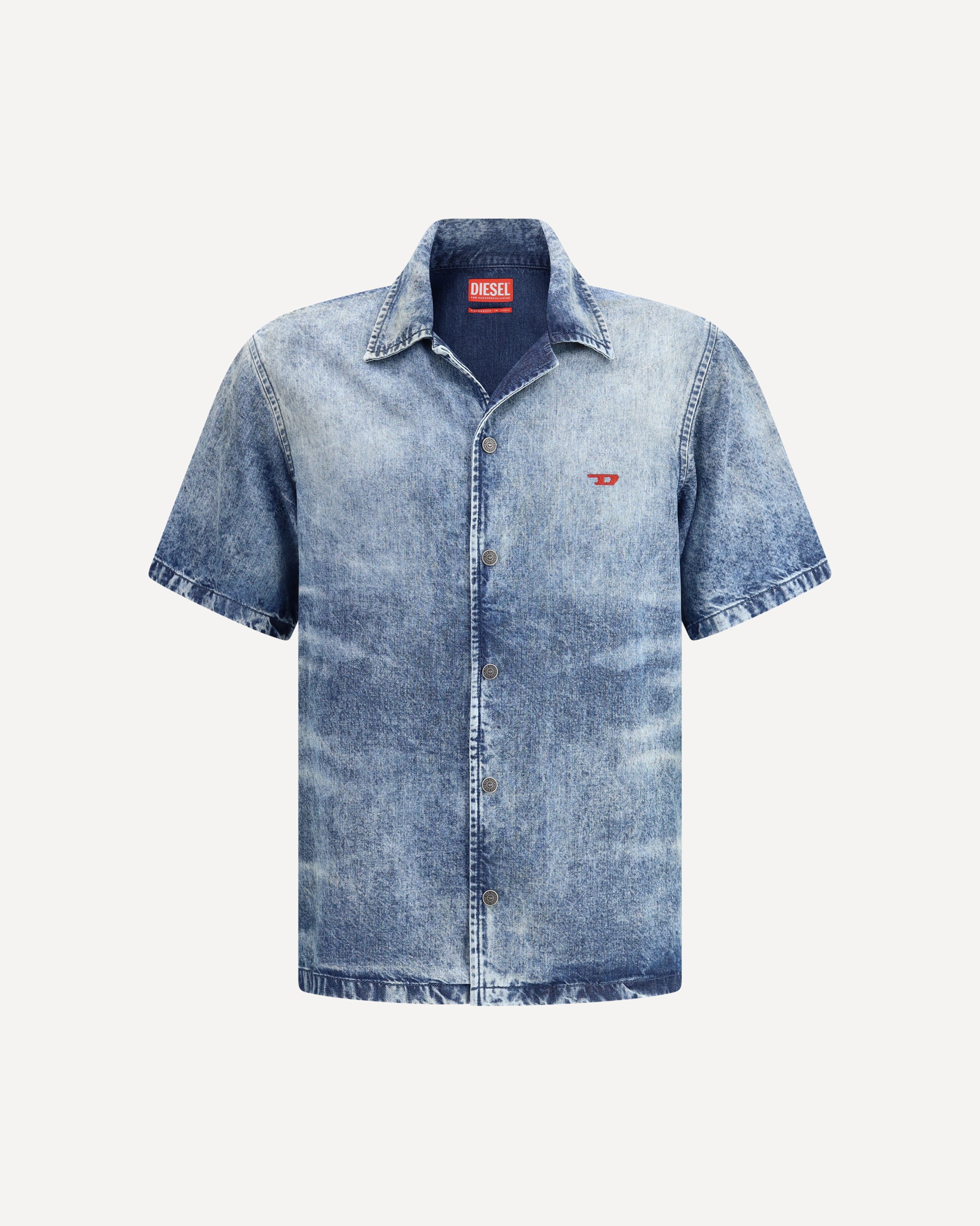 Diesel's D-Nabil-FSG cotton Shirt is a contemporary and versatile style piece. Featuring short sleeves and a Cuban-style collar, it offers a cool, casual look. The snap-button front closure adds a touch of practicality, while the iconic Oval D logo on the front highlights its authenticity. The distressed Tencel denim design gives the shirt a worn-in look and a soft effect, combining comfort and style.