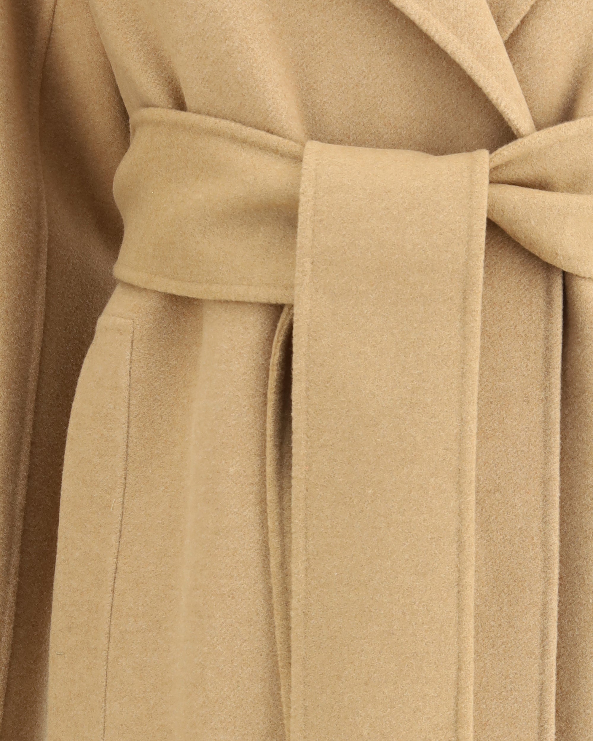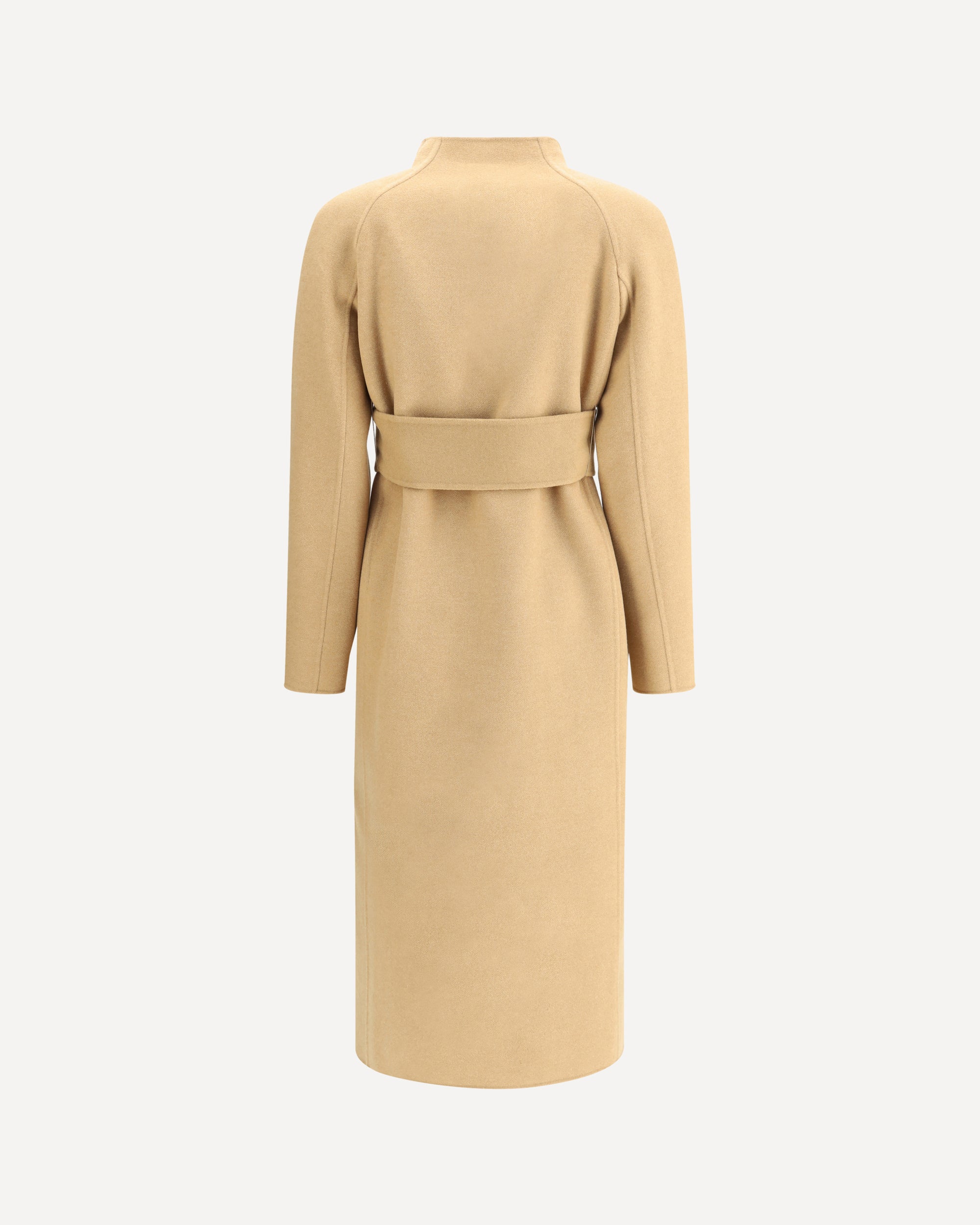 The Deena Coat by Khaite is a wrap-around design with raglan sleeves, made from fine double-face wool. Featuring bold lines and refined epaulettes, it stands out for its balance of structure and softness. The wide, scarf-like sash belt allows you to emphasize the silhouette or wear it open for casual elegance.