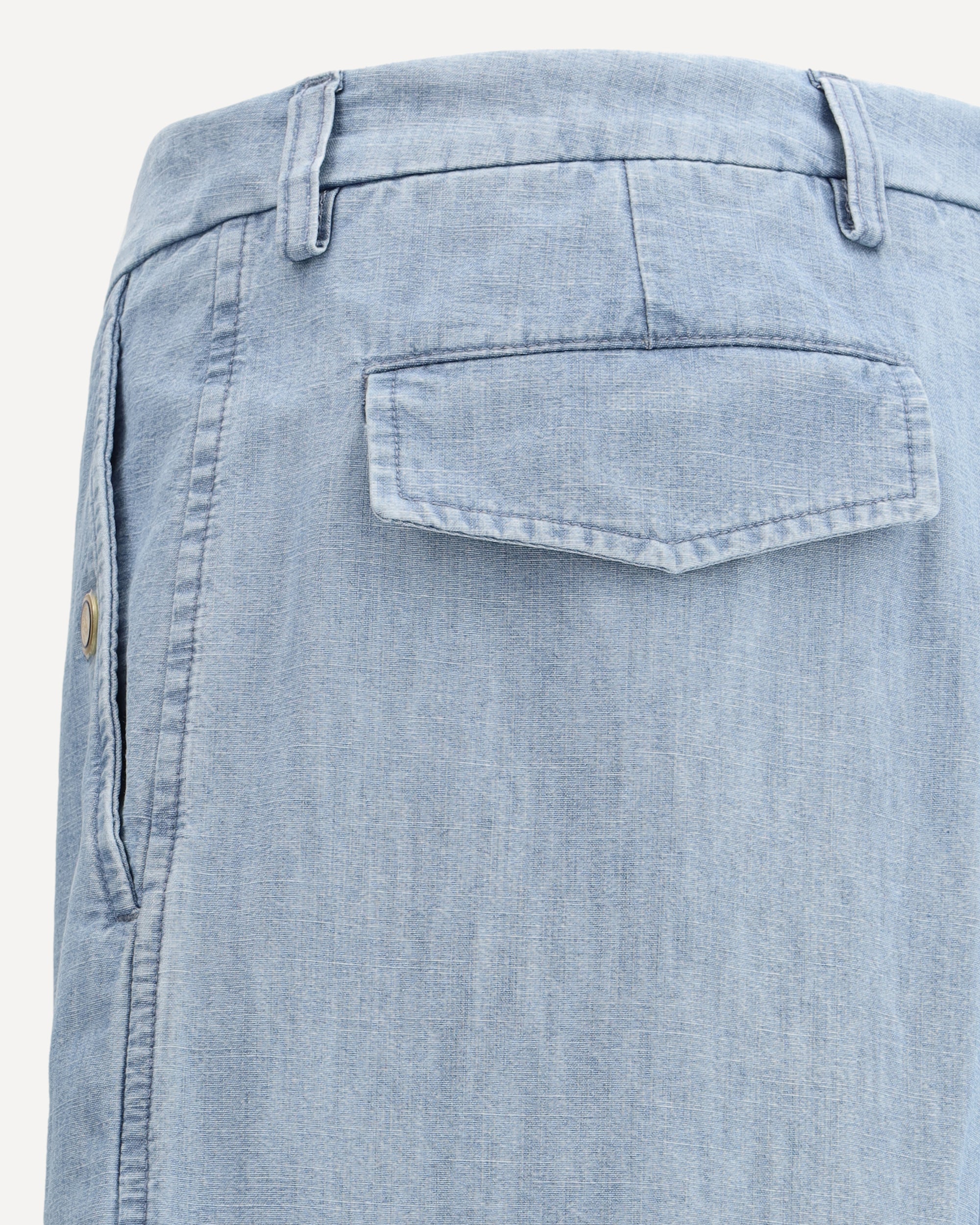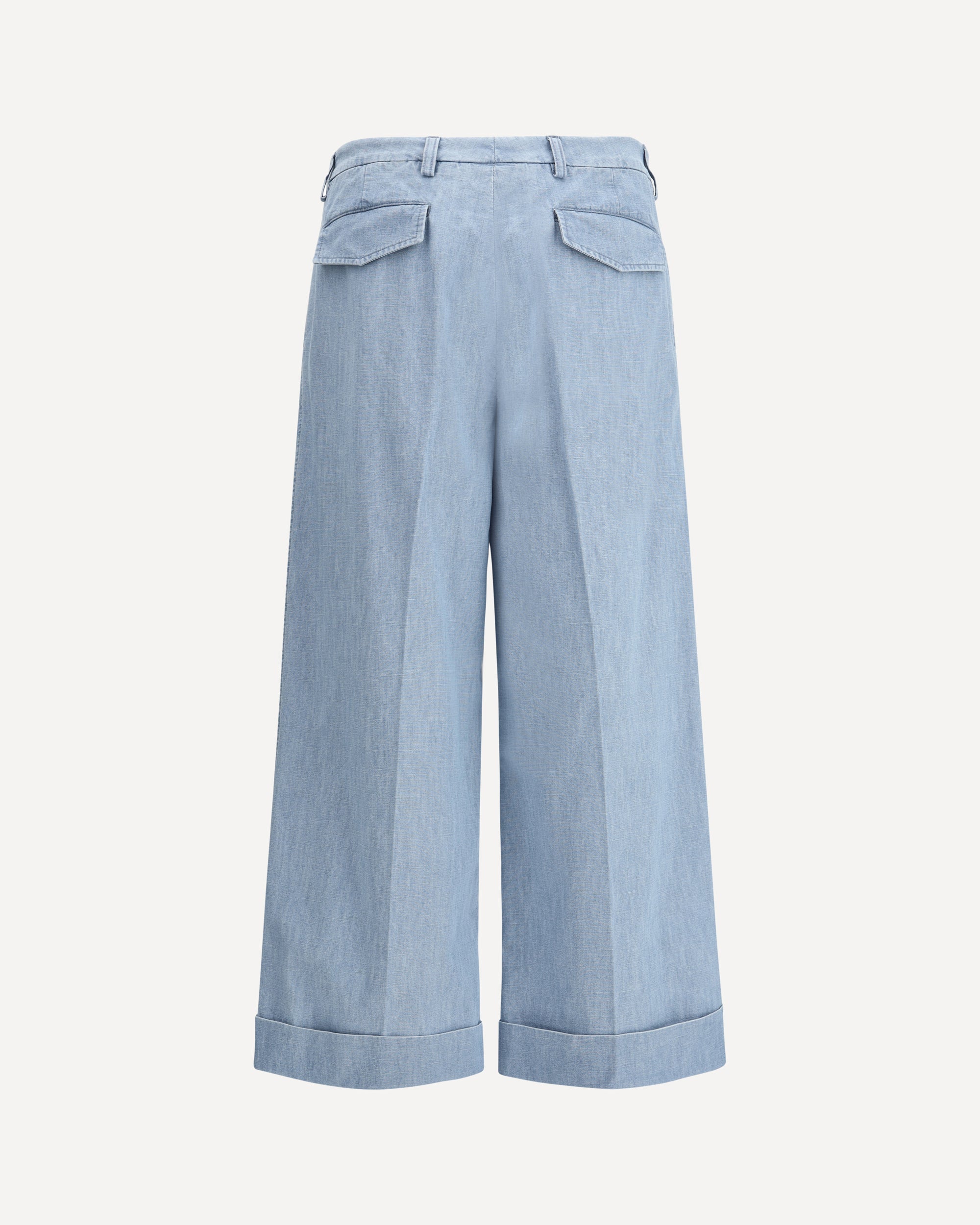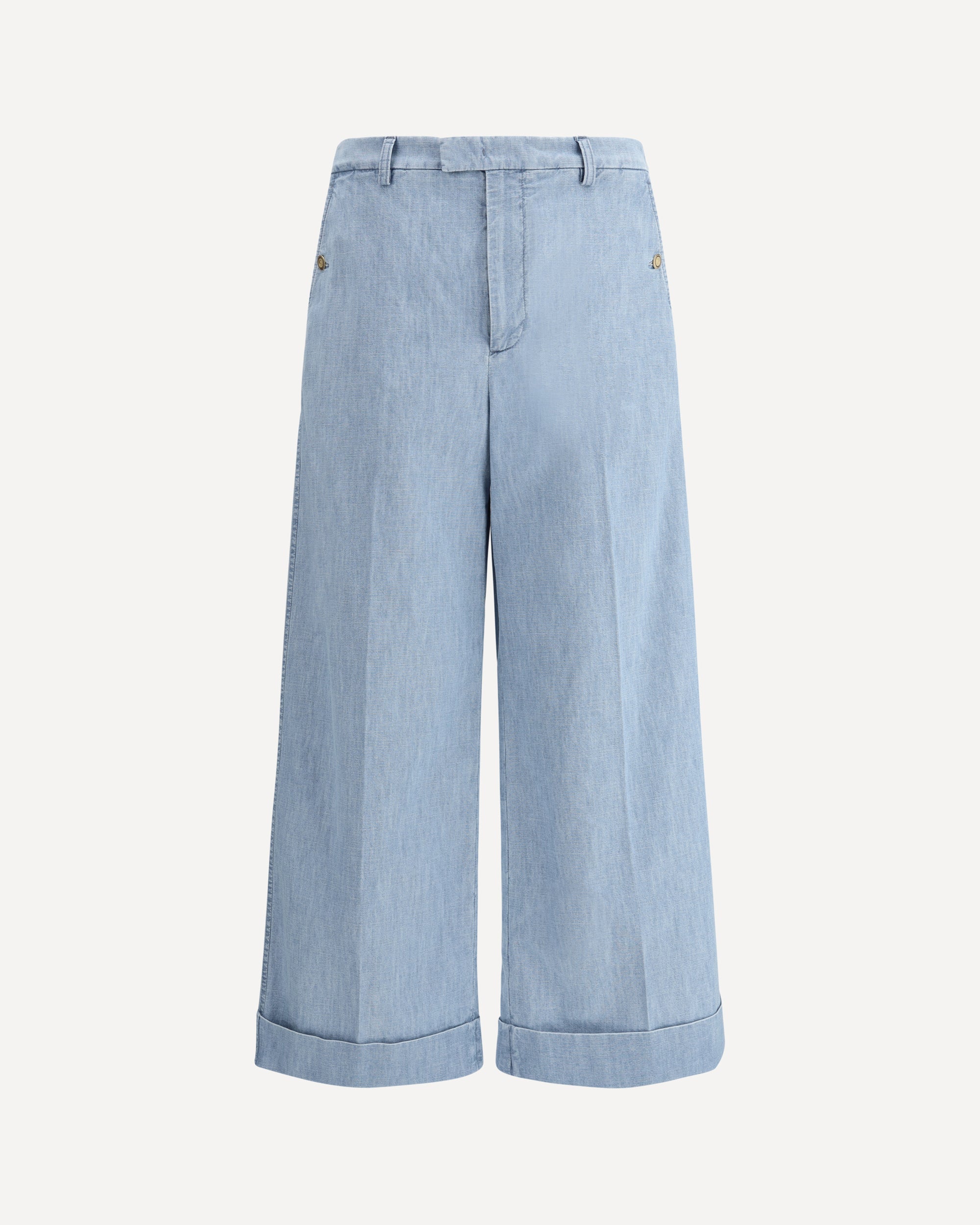 Valentino's Denim Pants feature a front zipper and hook-and-eye closure for a stylish and practical look. They feature two side welt pockets and two back welt pockets with flaps, offering a mix of style and functionality. Belt loops on the waistband allow for an adjustable fit, while the high waist and wide leg give the garment a sophisticated, modern silhouette. Turn-up hems add an extra touch of sophistication.