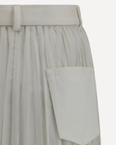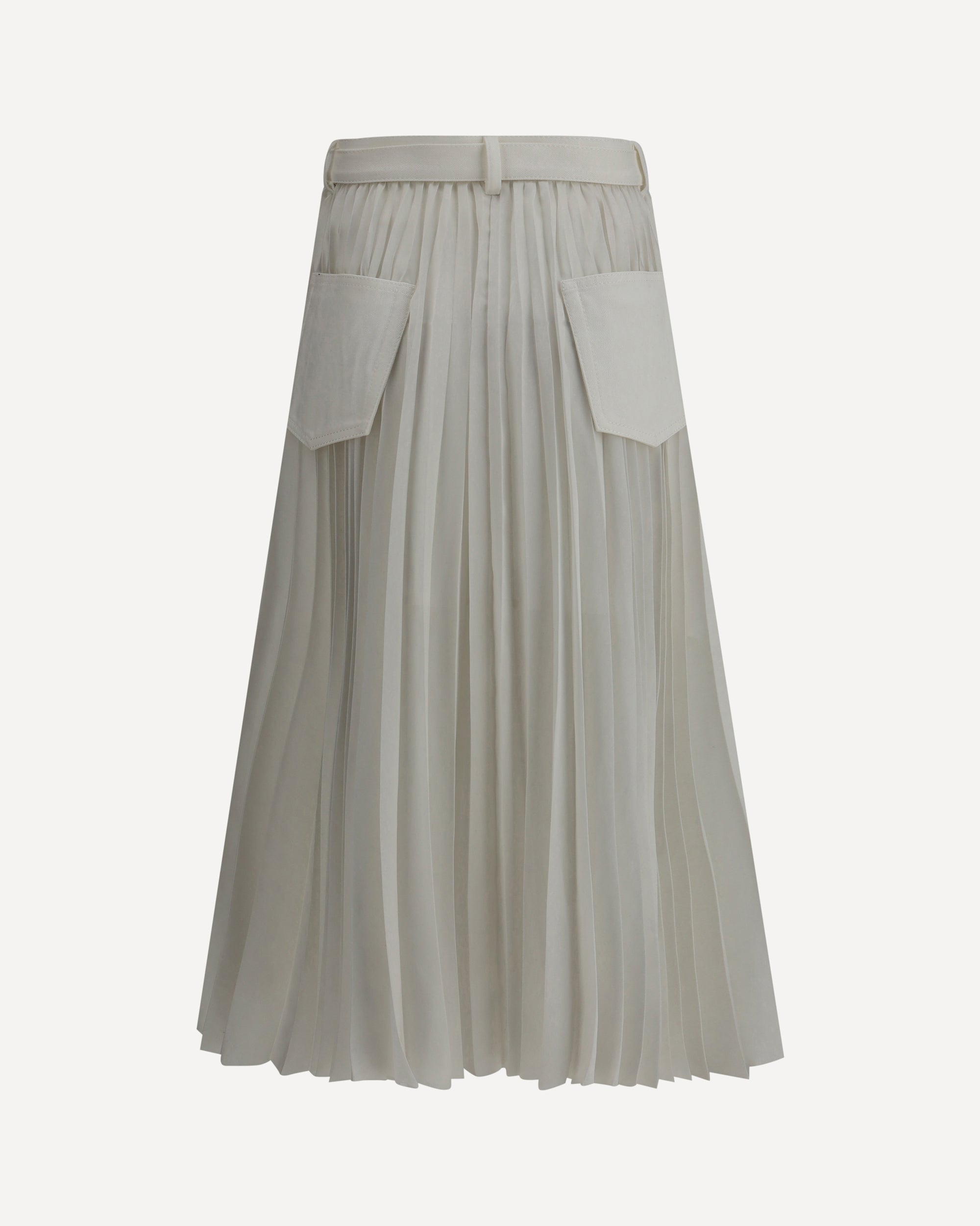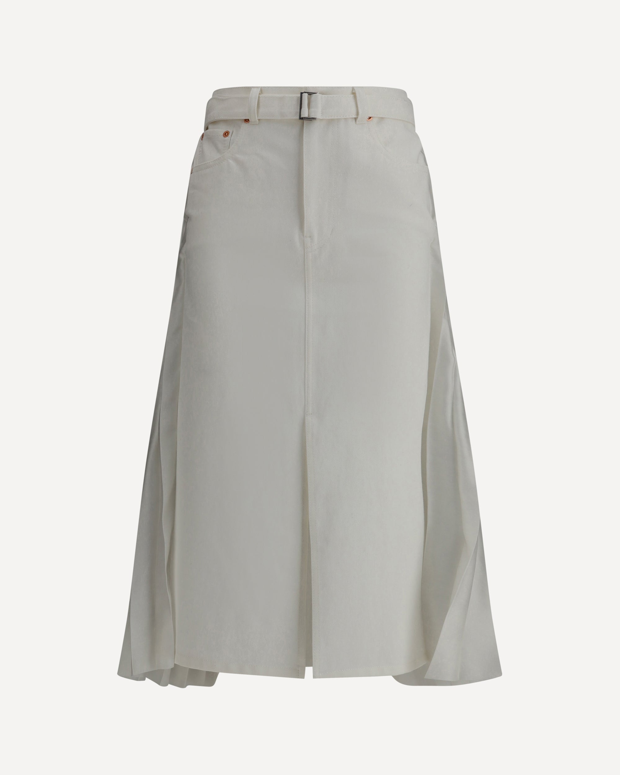 Sacai's midi Skirt is a unique piece that blends classic and modern elements into a versatile and innovative design. The five-pocket pattern adds a touch of practicality and style, while the denim front panel lends contrasting fabrics with a bold character. The pleated treo on the bottom gives movement and lightness to the look. The front zipper and button closure, along with the adjustable belt, allows for a perfect, customized fit. A garment that combines elegance and comfort, ideal for those seeking a contemporary and functional design.