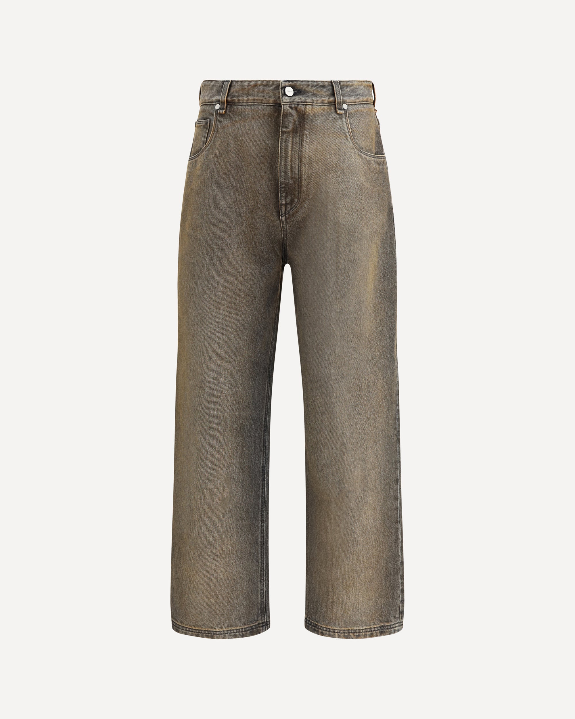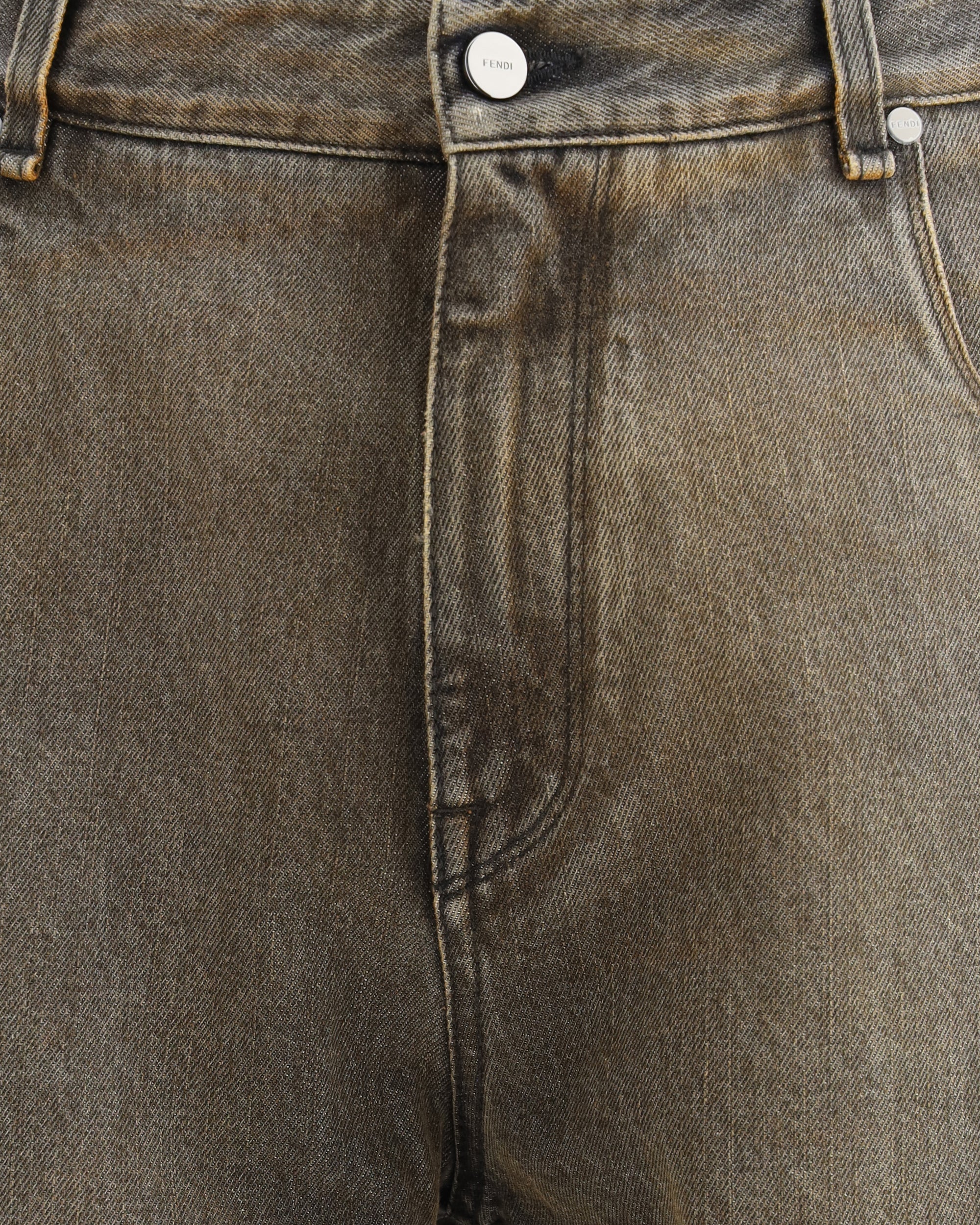 The Marble Over Dye denim pants by Fendi combine contemporary design with refined details. Featuring a straight leg, front button closure with logo-engraved metal button, front pockets, and a rear leather patch with logo, they create a versatile, distinctive piece for modern and elegant outfits.