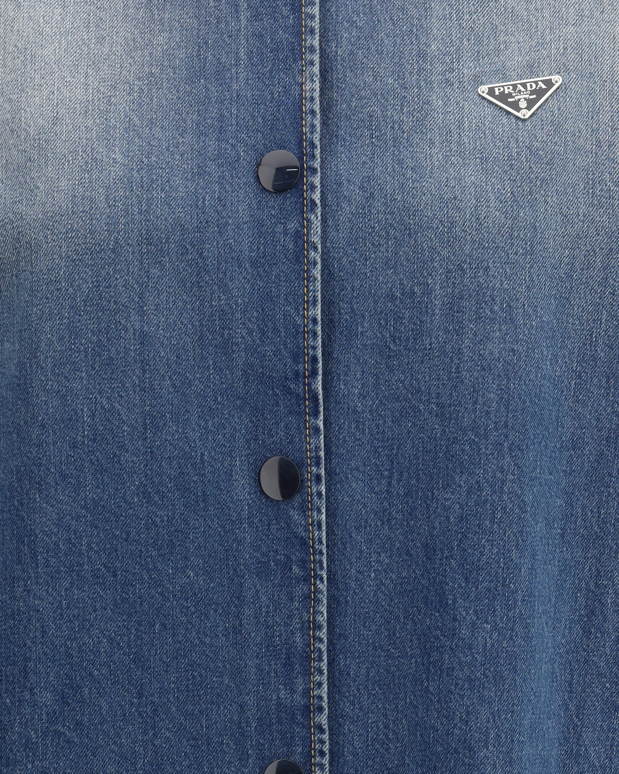 Prada's oversized denim Shirt Jacket combines denim appeal with a modern, relaxed fit. Featuring a classic collar and front snap closure, it is distinguished by the triangular plaque on the front, an iconic detail that elegantly signs the garment. Perfect for a casual yet sophisticated style.
