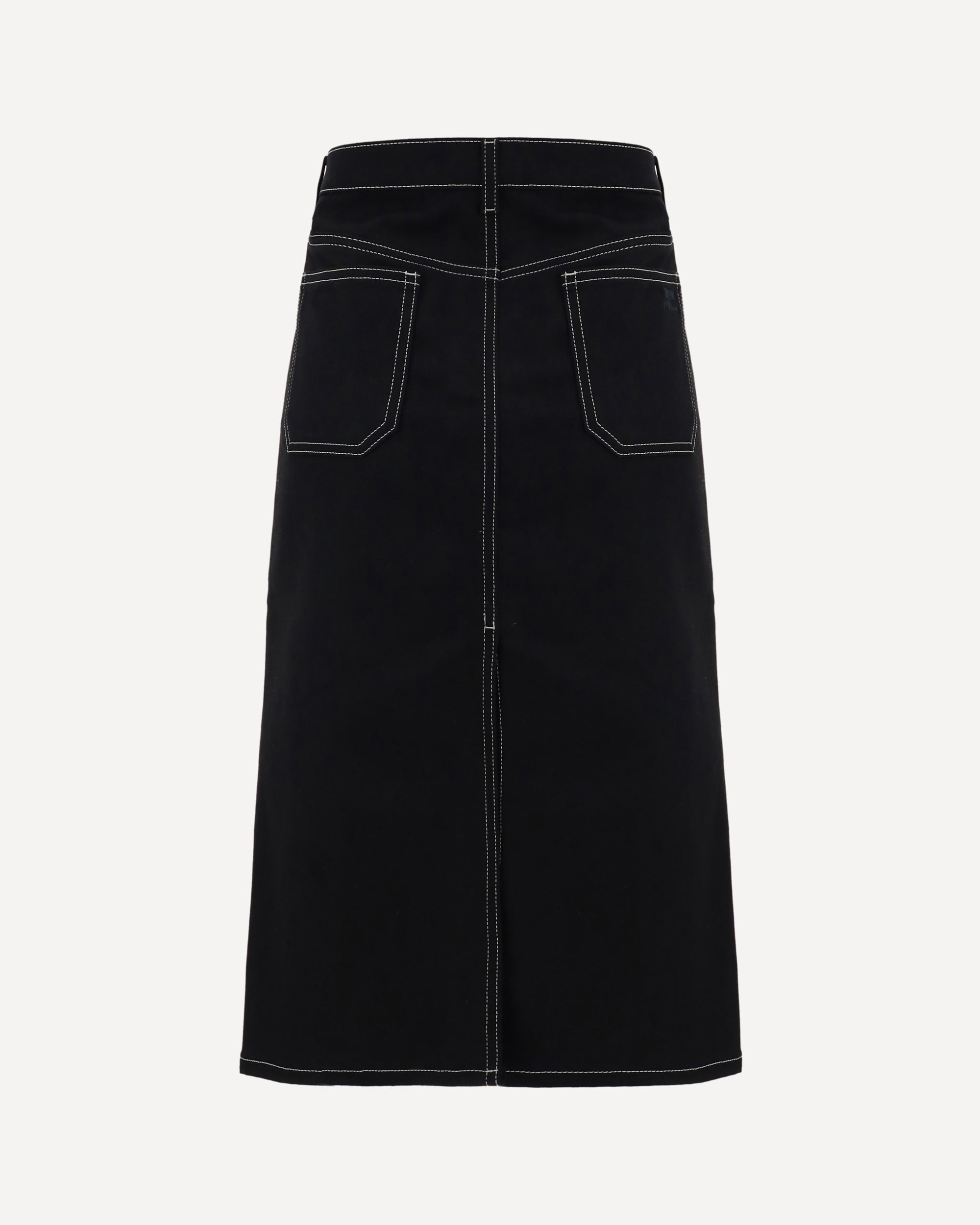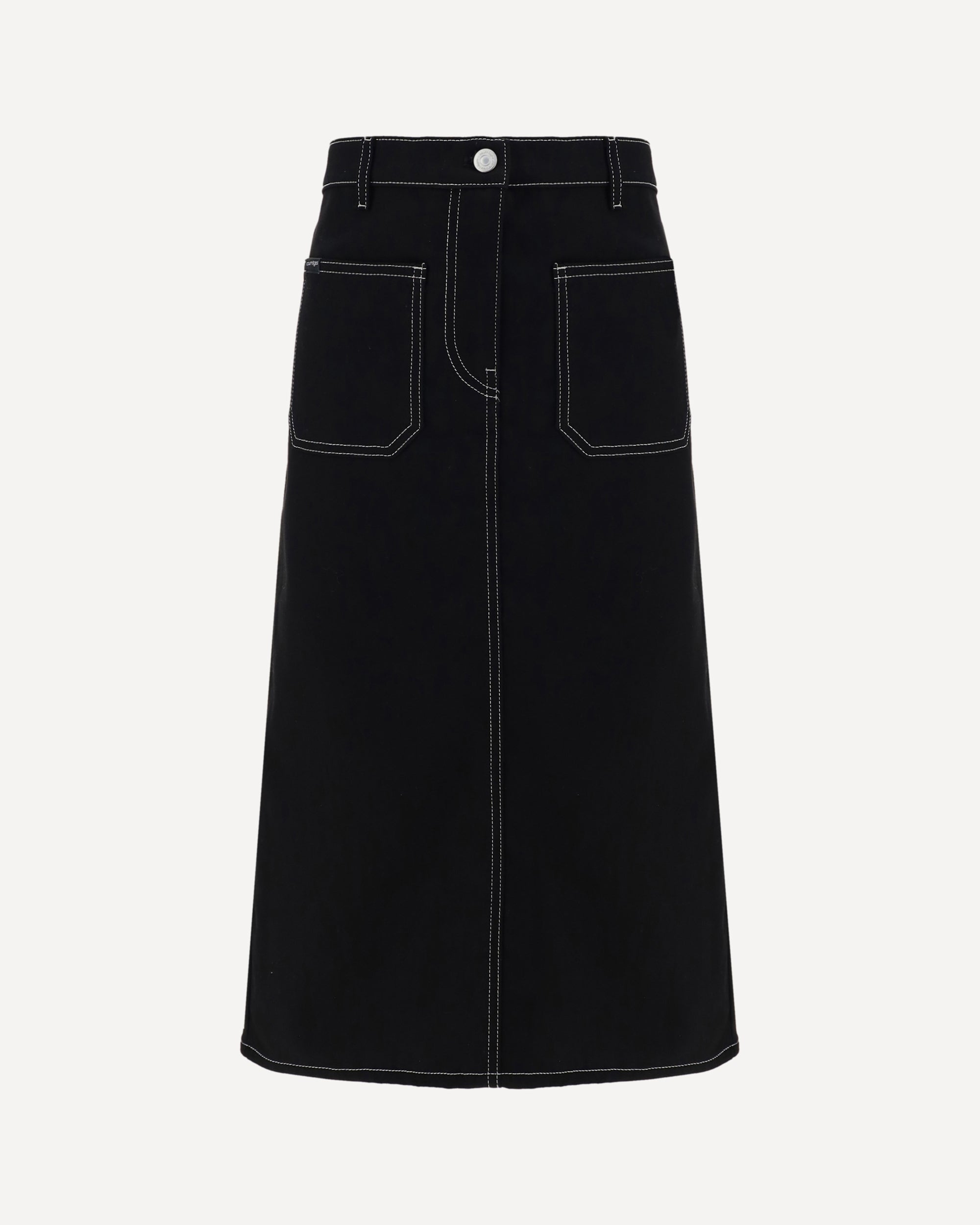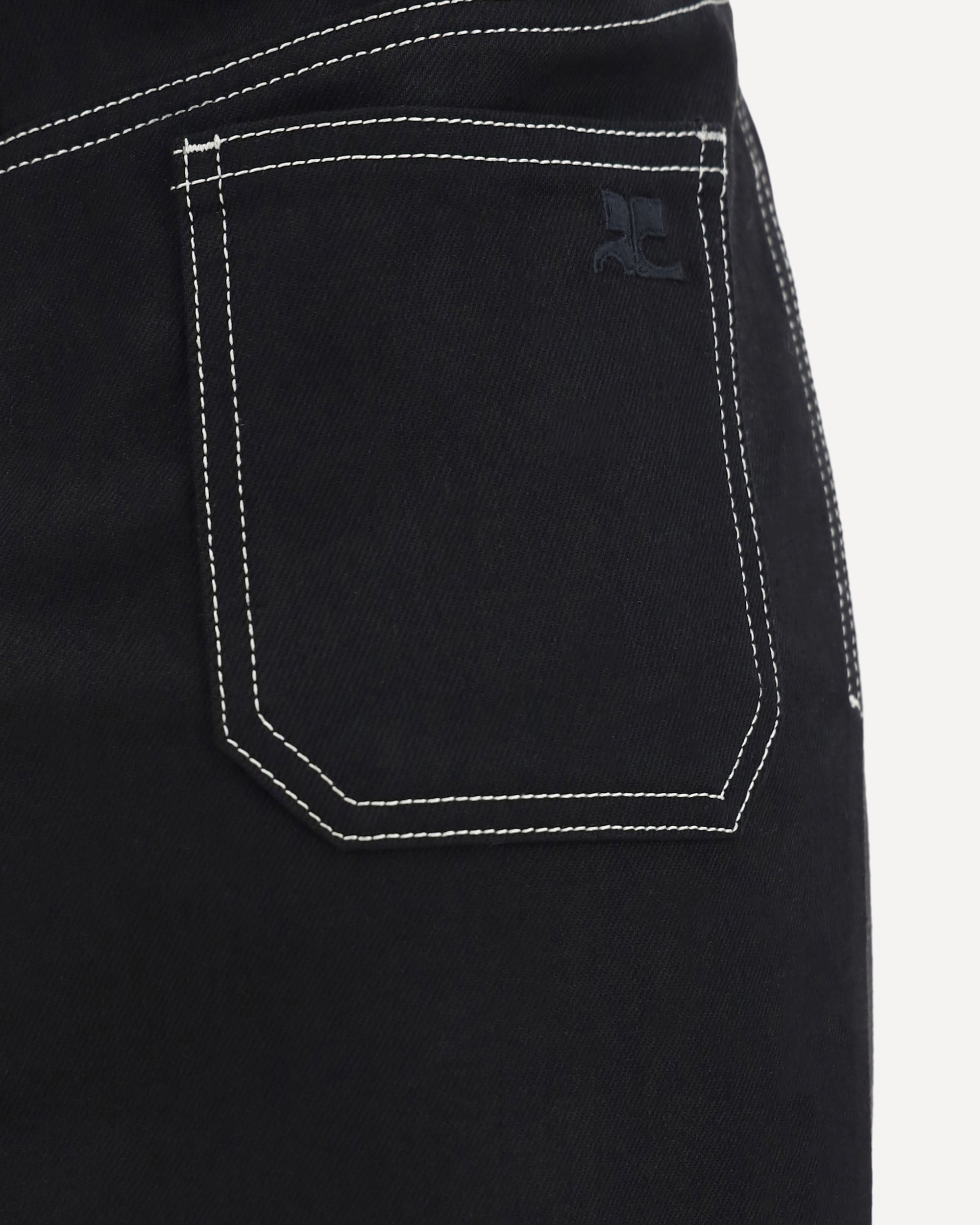Cotton Denim Skirt by Courrèges, front button and zipper closure, two patch welt pockets on front panel, two patch slit pockets on back panel, back panel slit, waistband loops, contrast stitching, monochrome pattern, regular fit.
