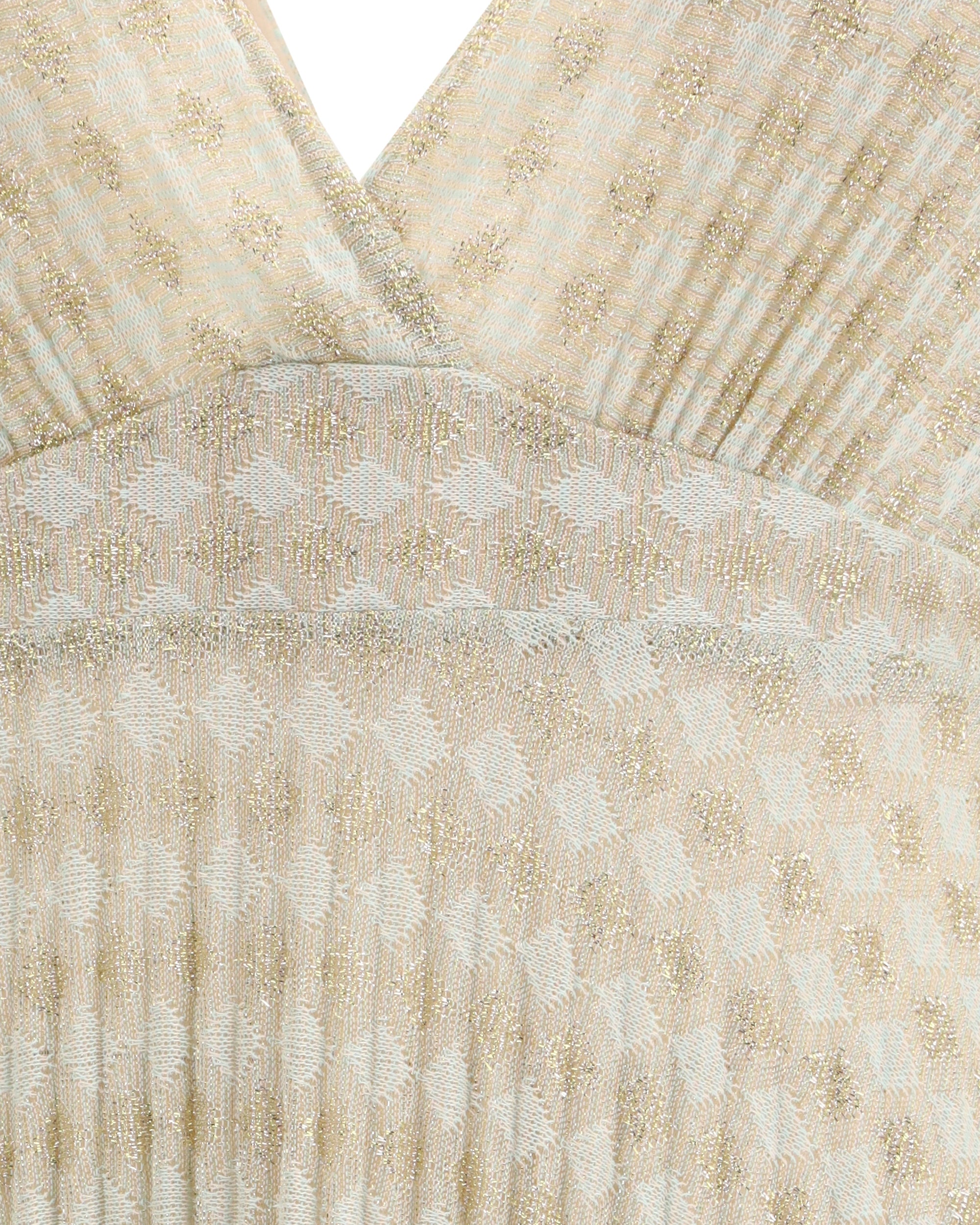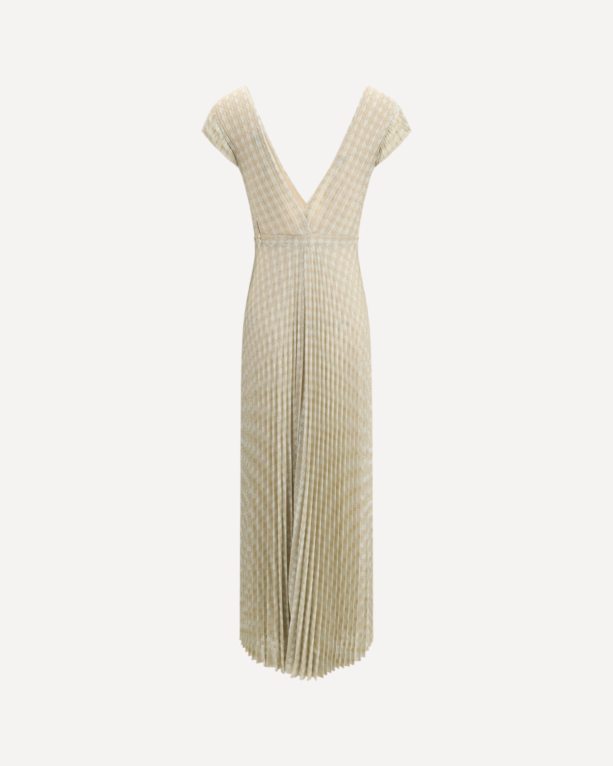 The pleated diamond jersey Dress by Forte Forte, lending the surface a light, refined texture. The feminine lines are enhanced by a skirt that opens softly into a flared hem, creating fluid movement. Naturally elegant, the long silhouette reveals the décolleté through a deep V neckline, mirrored at the back, and balanced by a basque cut that flows into the gently widening skirt. Woven with subtle lurex threads, the jersey catches the light with a softly glamorous allure.