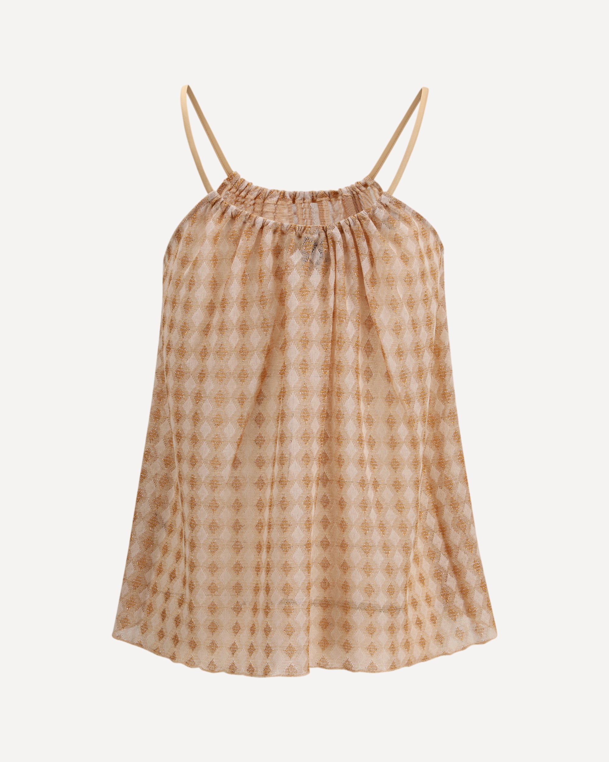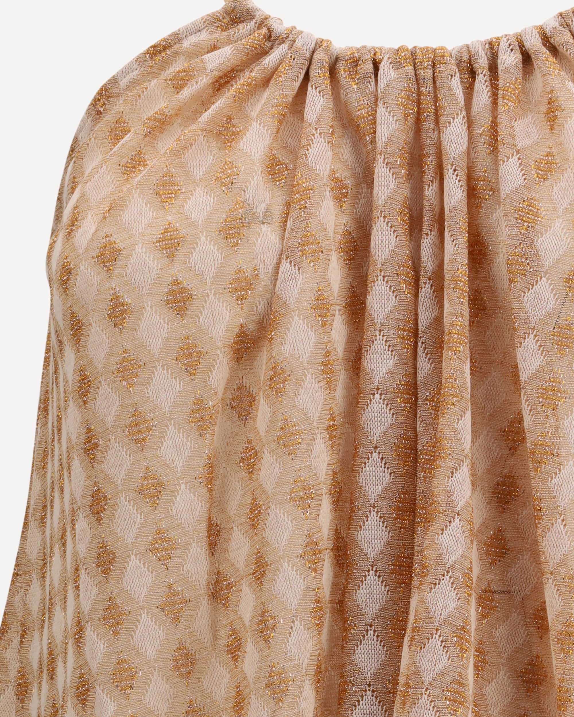 The diamond jersey Top by Forte Forte plays with minimal shapes and a subtly shimmering finish. The slender shoulder strap supports soft gathers at the neckline, creating a fluid volume over the bust, while the geometric pattern comes alive through the woven lurex thread. A refined piece that blends light, texture, and understated femininity.