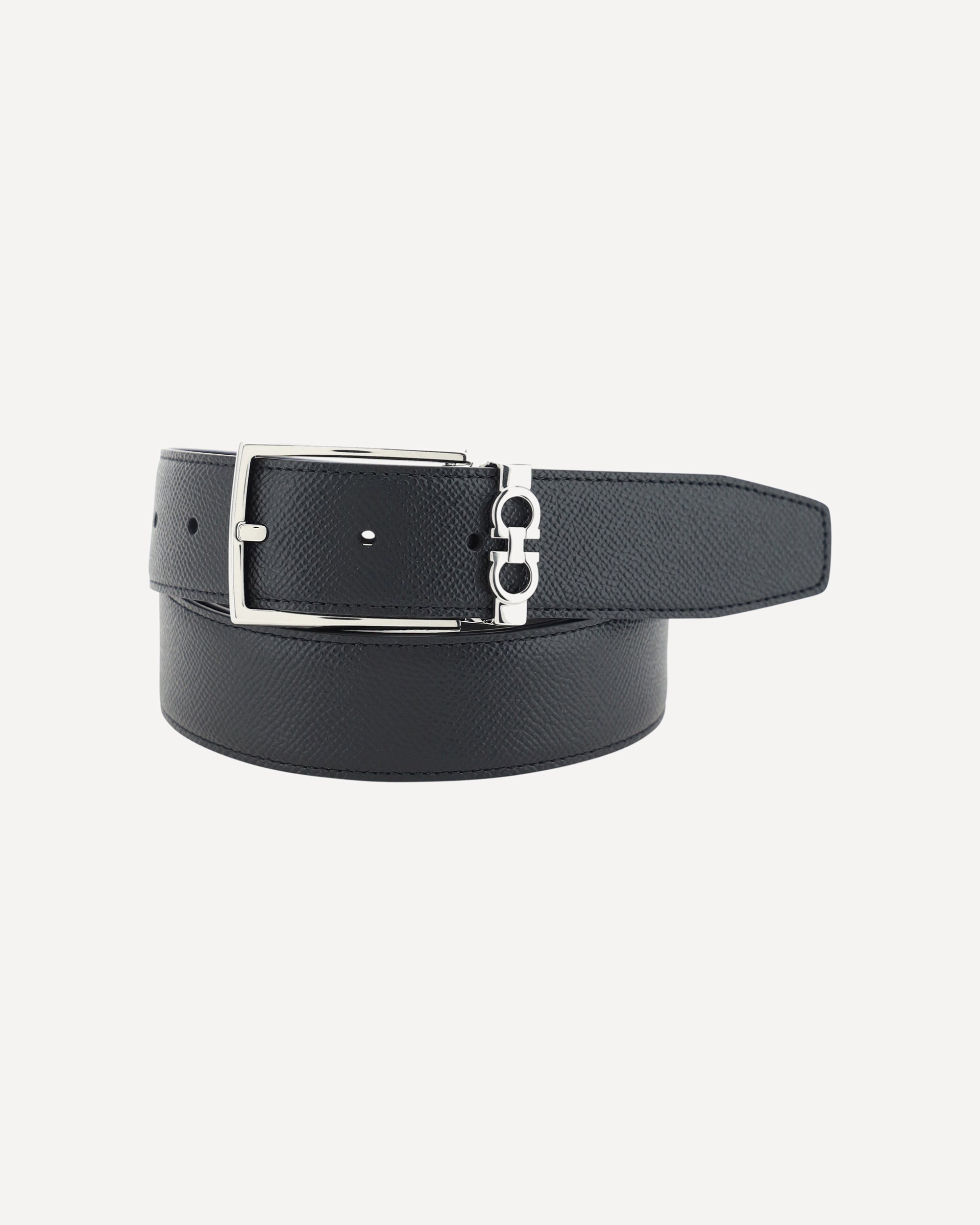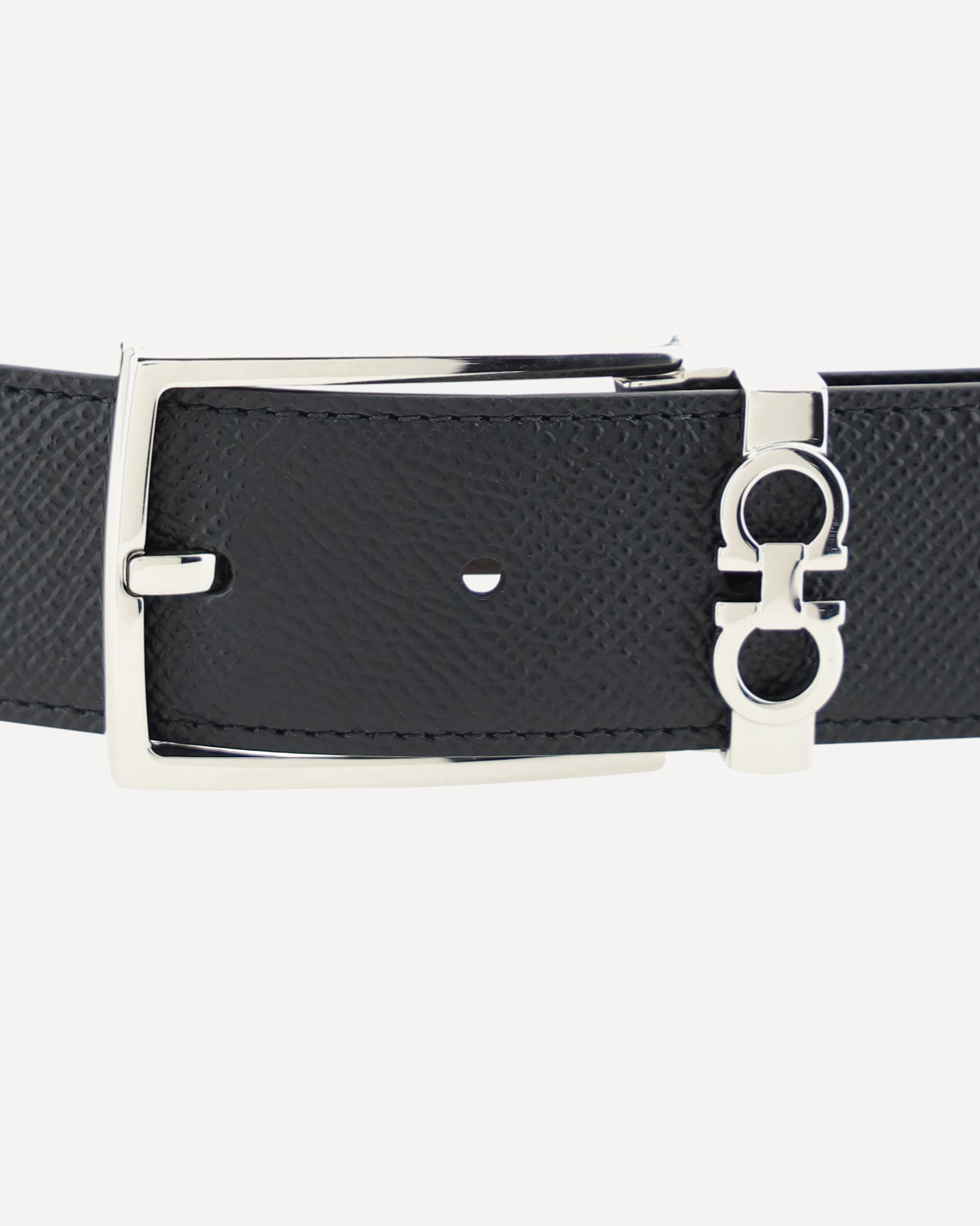 Ferragamo's reversible leather Belt is a versatile and elegant accessory designed to complete any look with style. Made of high-quality grained leather, it features a monochrome double-face design that allows you to choose between two different finishes. The metal buckle is embellished with the iconic Gancini logo, the distinctive symbol of the maison.