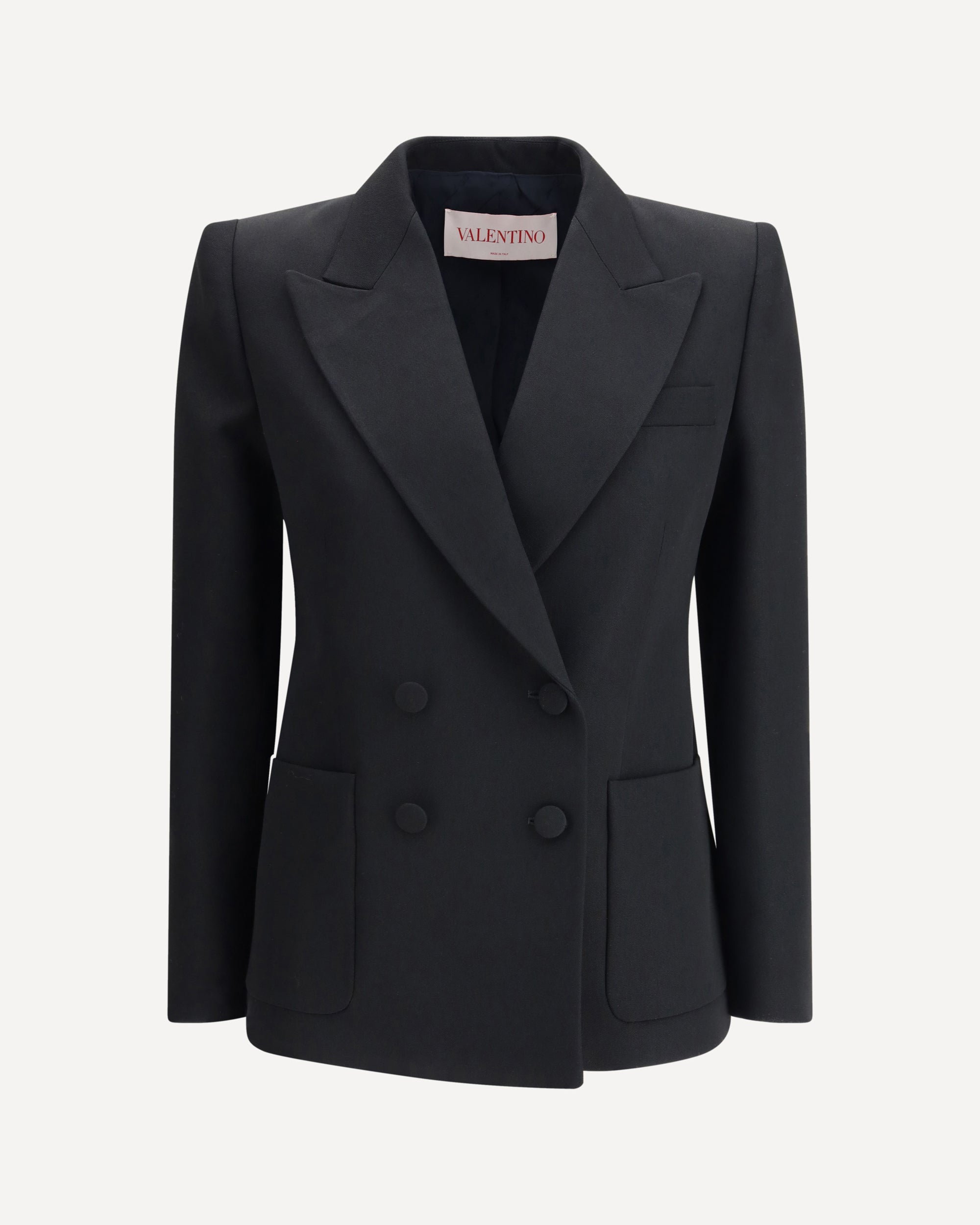 Valentino's double-breasted blazer is a highly elegant piece that combines tradition and modernity. The wide peak lapels and front button closure give it a bold, refined look, while the two patch pockets on the front add functionality with a stylish touch. The back vent provides greater freedom of movement and a distinctive detail, making the blazer not only elegant but also comfortable. Perfect for those seeking a sophisticated, timeless look, this blazer is ideal for formal occasions or to add a touch of class to an everyday outfit.
