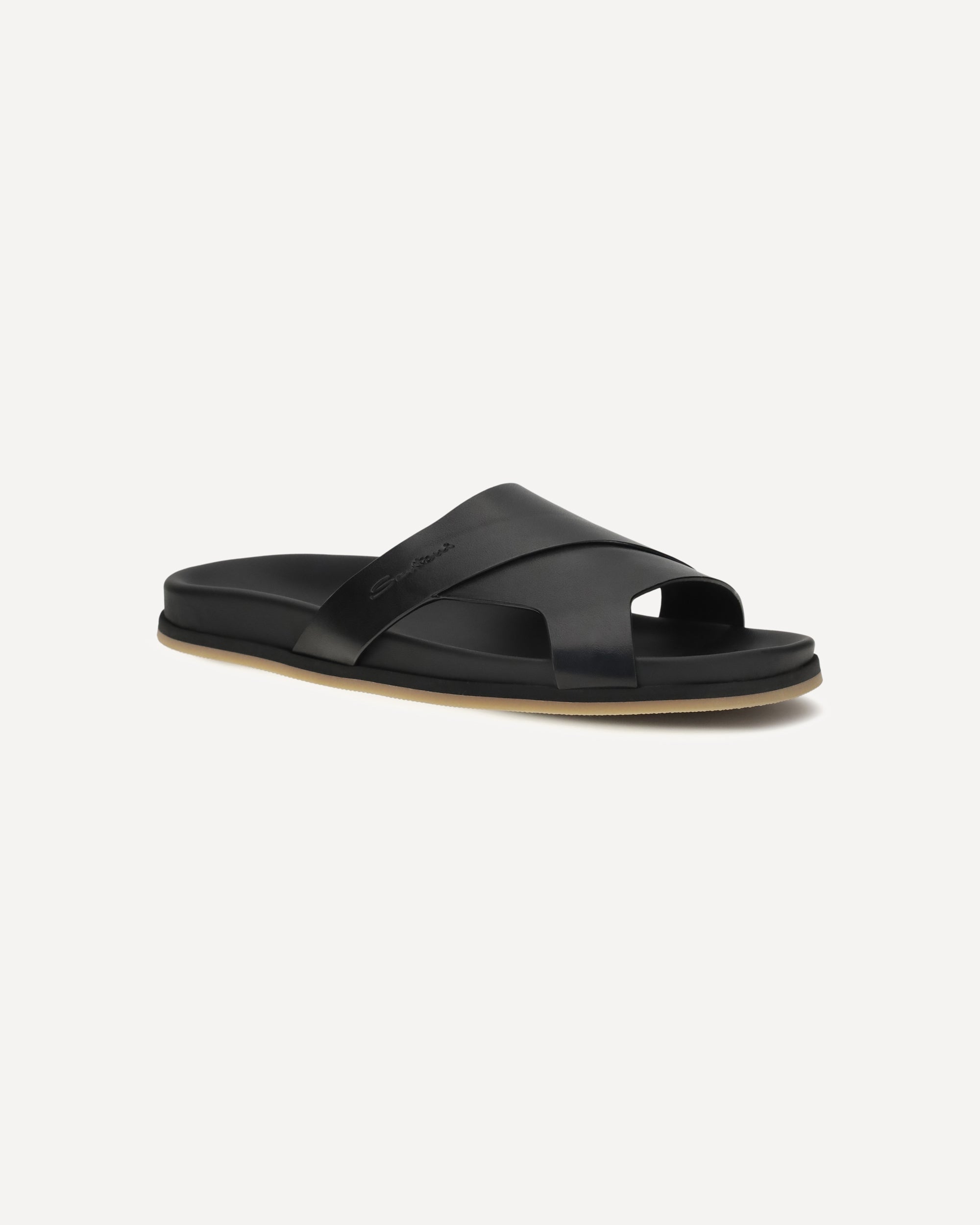 The leather Slippers by Santoni stand out for their clean and sophisticated design, created to deliver comfort and elegance with a contemporary touch. Crafted from premium calfskin leather, they feature an open-toe silhouette that adds lightness and practicality to the style. Their refined craftsmanship and streamlined lines enhance the shoe’s minimalist aesthetic, making them ideal for completing men’s summer looks with relaxed sophistication.