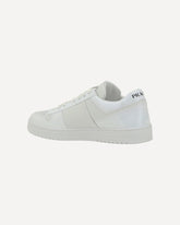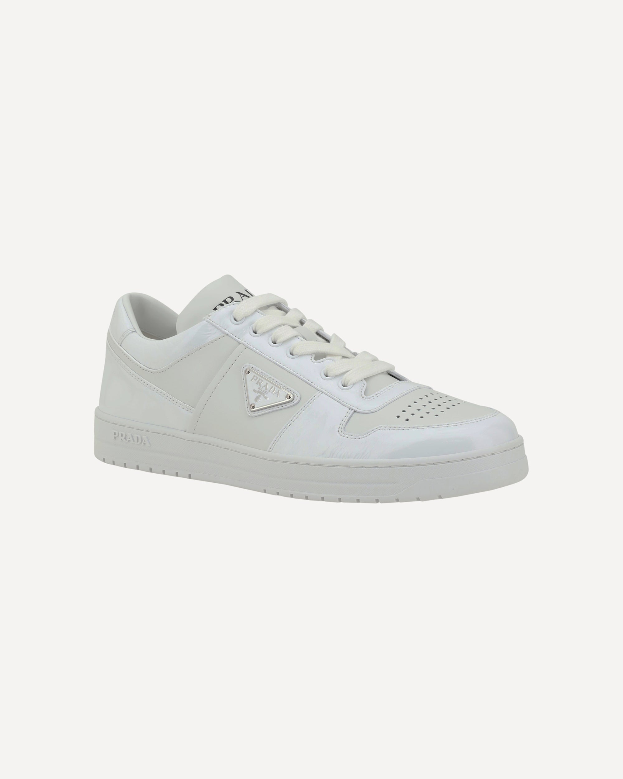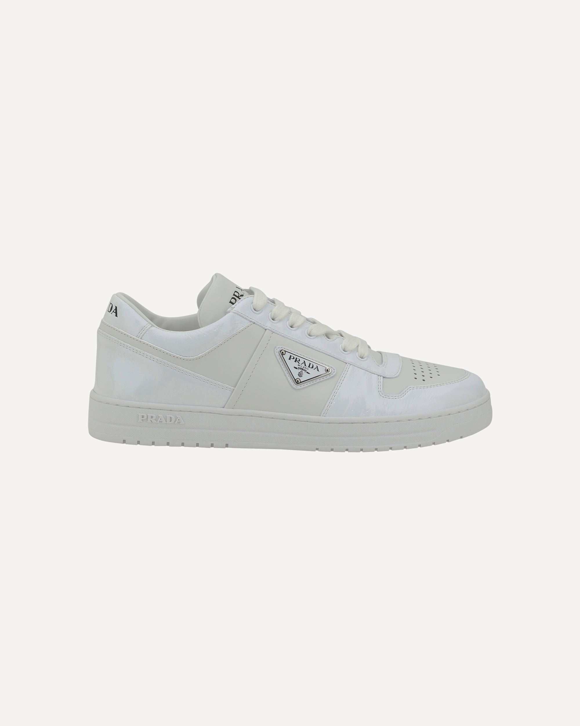 Prada's Downtown leather Sneakers feature a front lace-up closure, while the brand's iconic triangular enameled signature plaque is applied to the side panel. The round, perforated toe ensures a comfortable and breathable fit, while the contrasting logo on the heel adds a distinctive touch. A model that combines elegance and practicality, perfect for a casual yet sophisticated look.