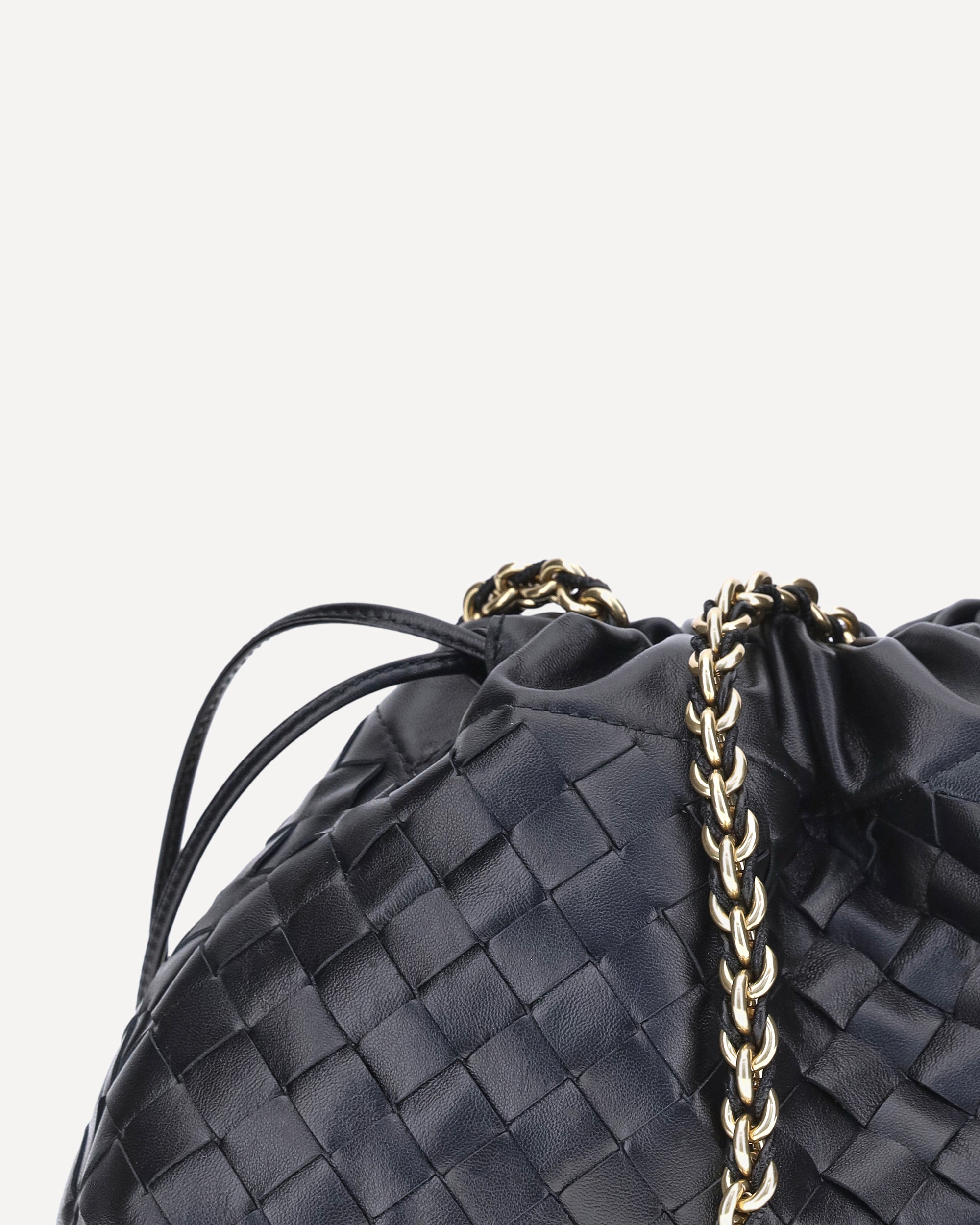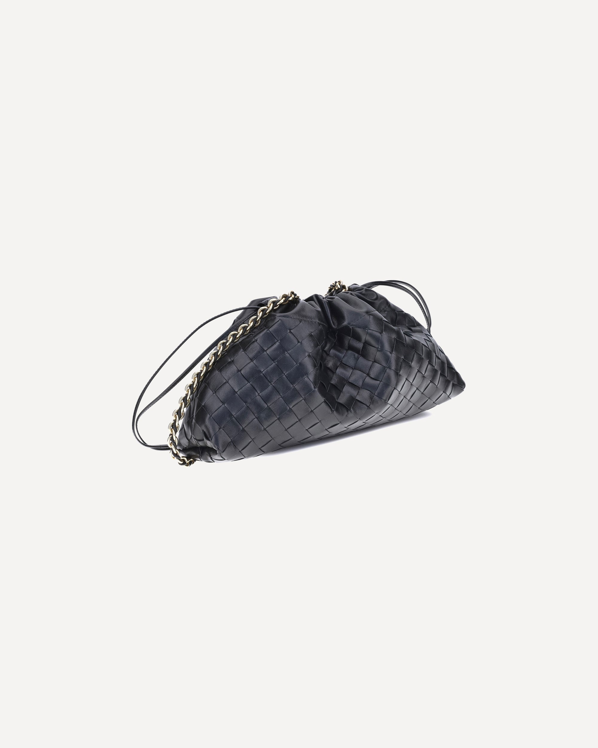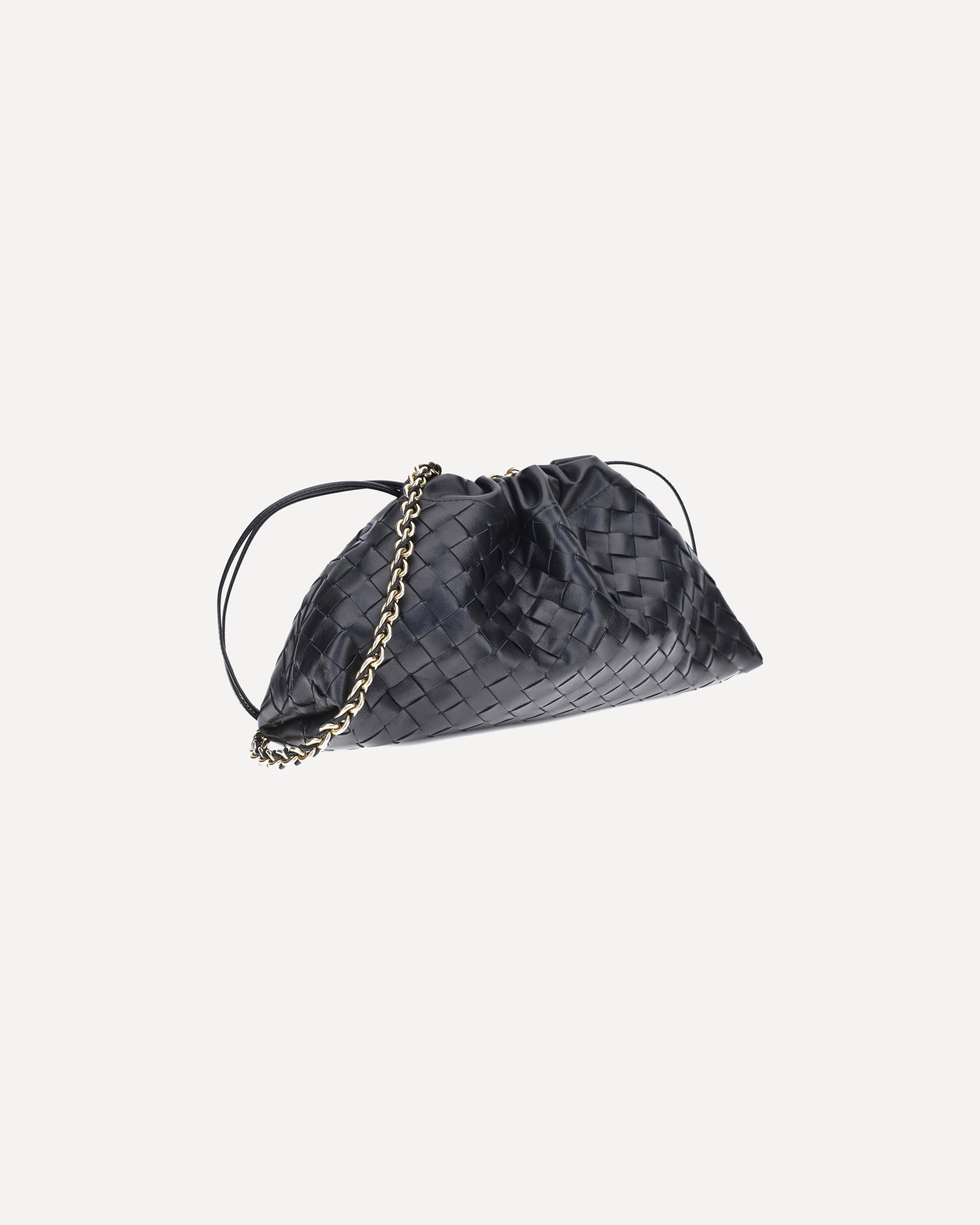 Bottega Veneta's leather Drawstring Pouch combines elegance and craftsmanship. Made of soft leather with the emblematic woven work, it features a curly drawstring closure and removable chain strap with leather woven details. The interior, with a single compartment, is perfect for essentials. Compact and versatile, it is the ideal accessory to complete any look in style.