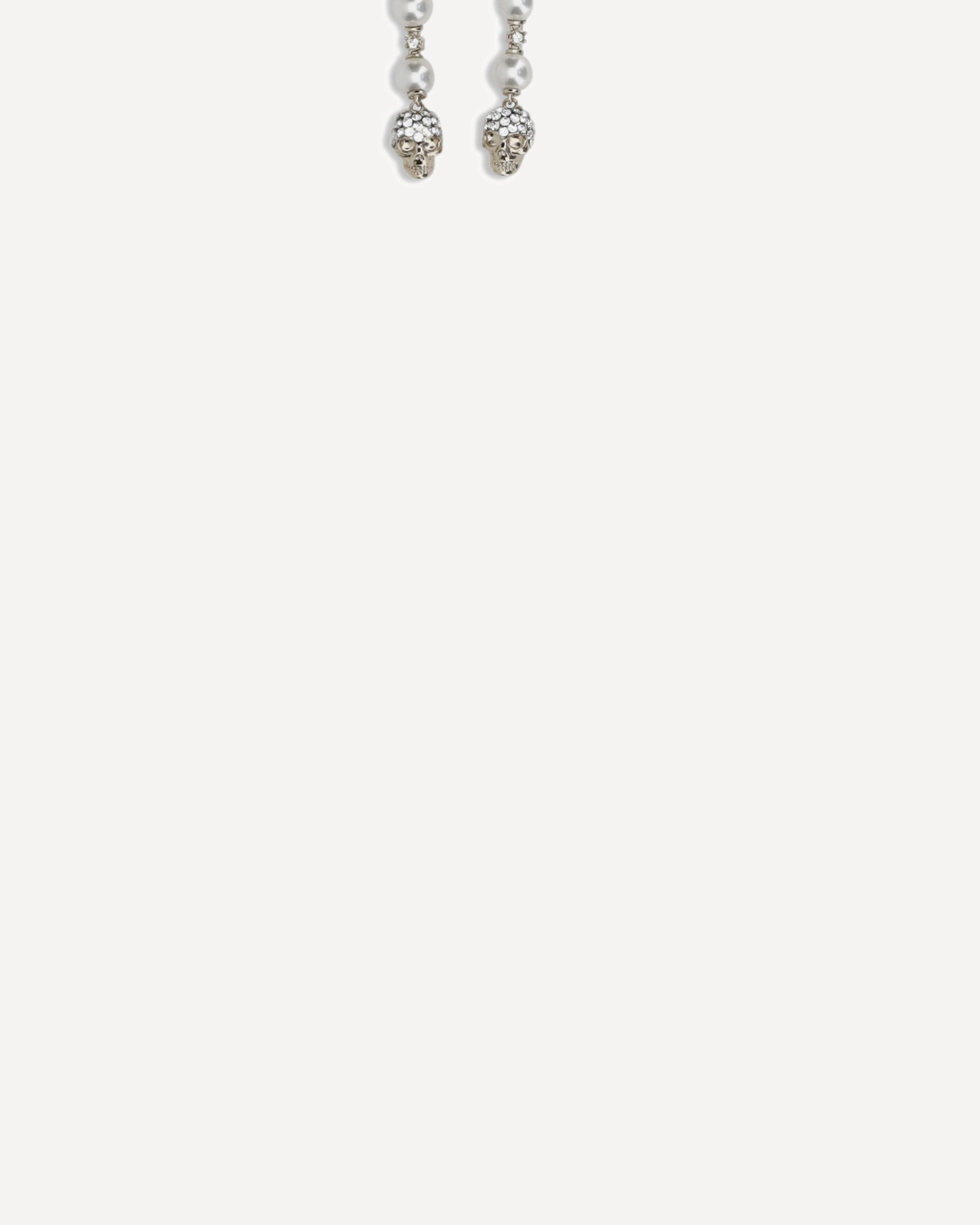 The Alexander McQueen pendant Earrings feature a light gold finish and a sophisticated design that combines elegance and character. The pendant features synthetic pearls paired with a skull detail decorated with crystals. Brass metal hardware and a butterfly clasp complete this distinctive and refined jewelry.