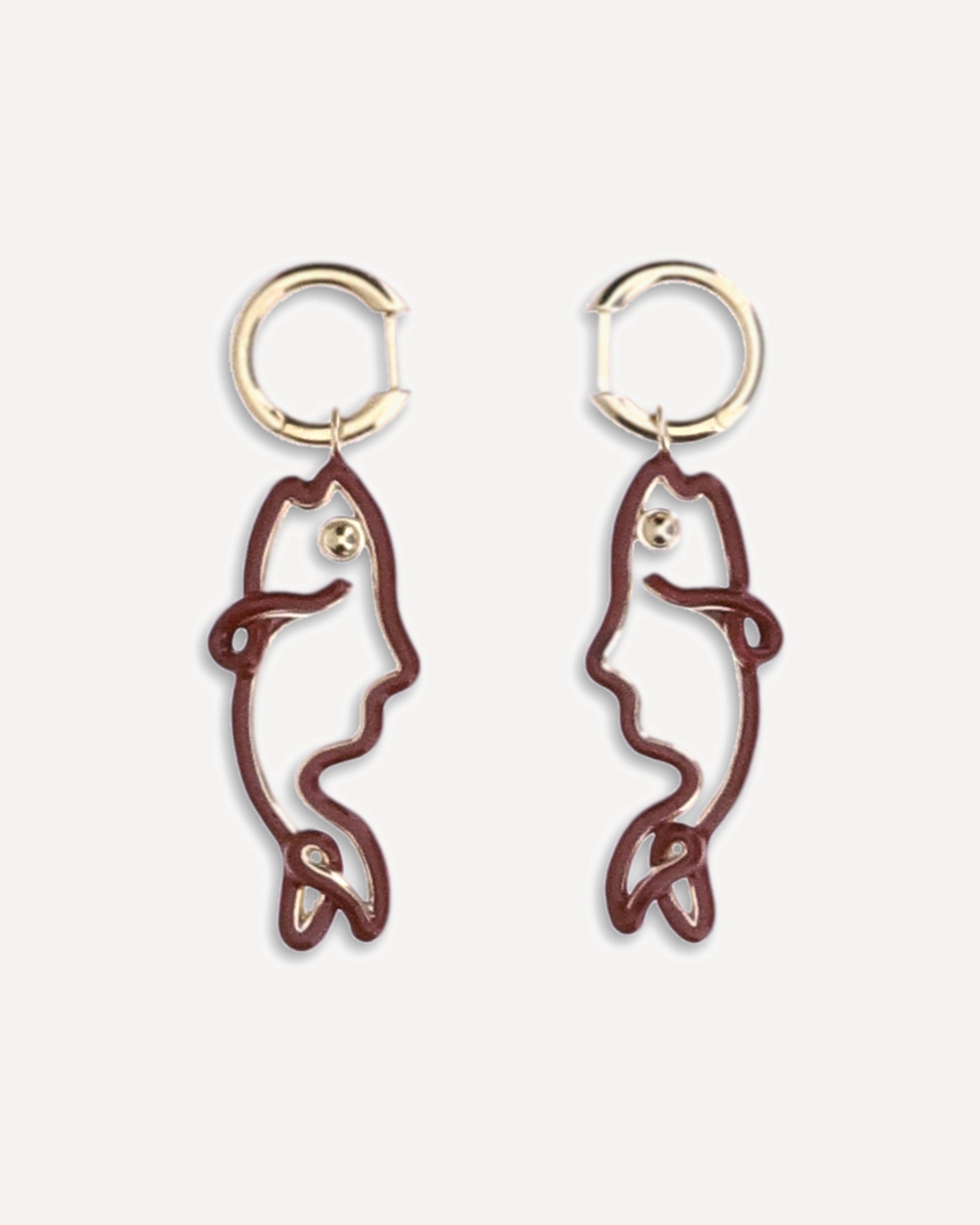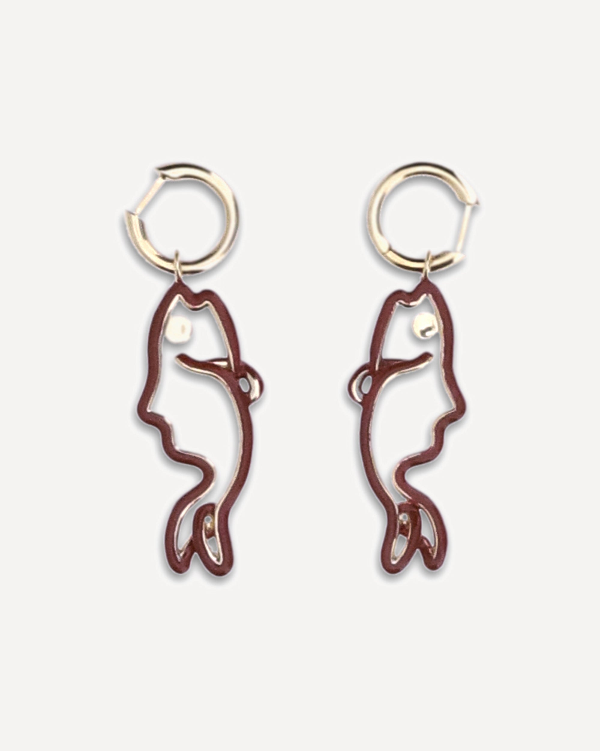 The drop Earrings by Bottega Veneta feature a refined design with a ring from which hangs an enameled fish charm. An original and delicate accessory, perfect for adding a touch of contemporary elegance and personality to your look.