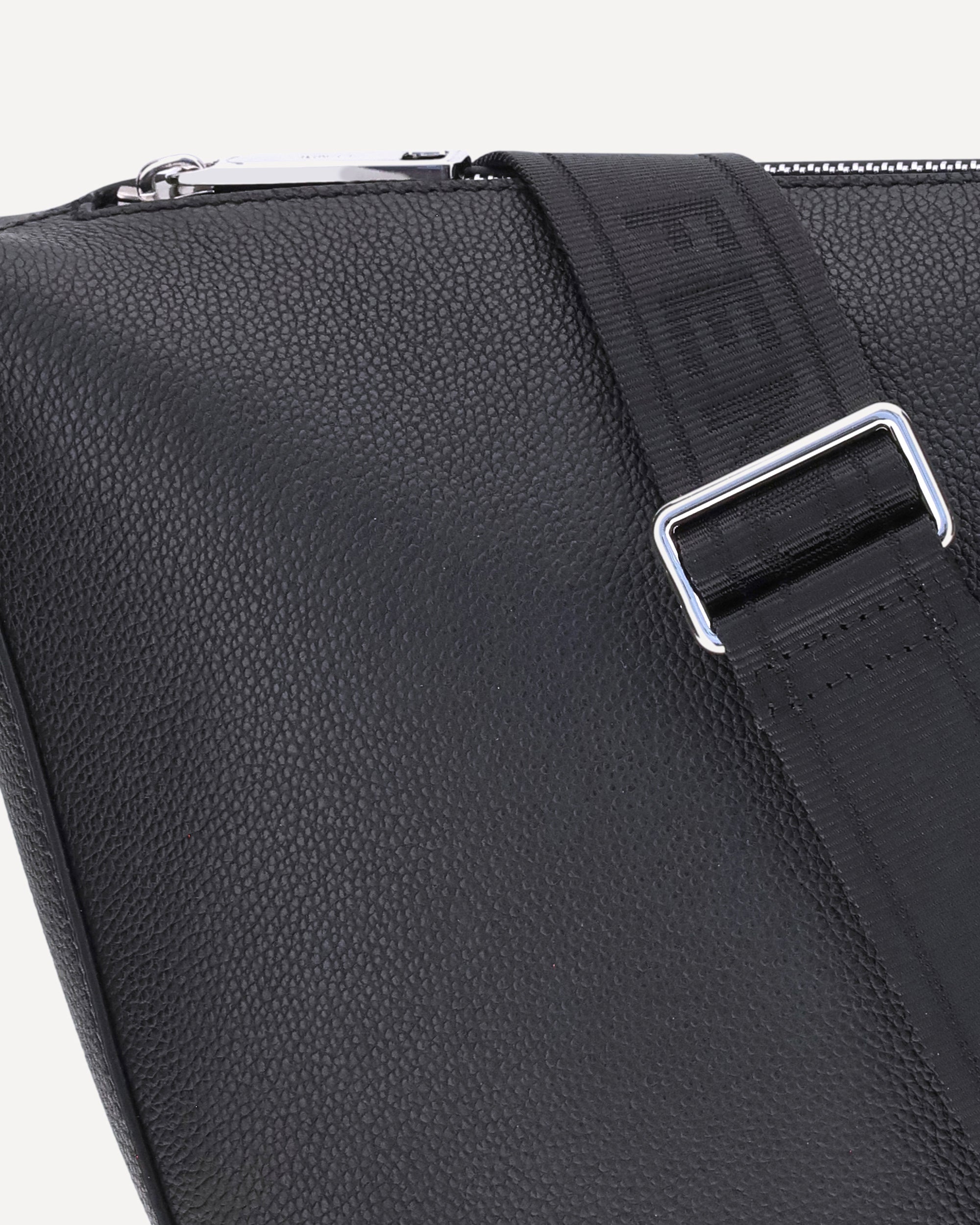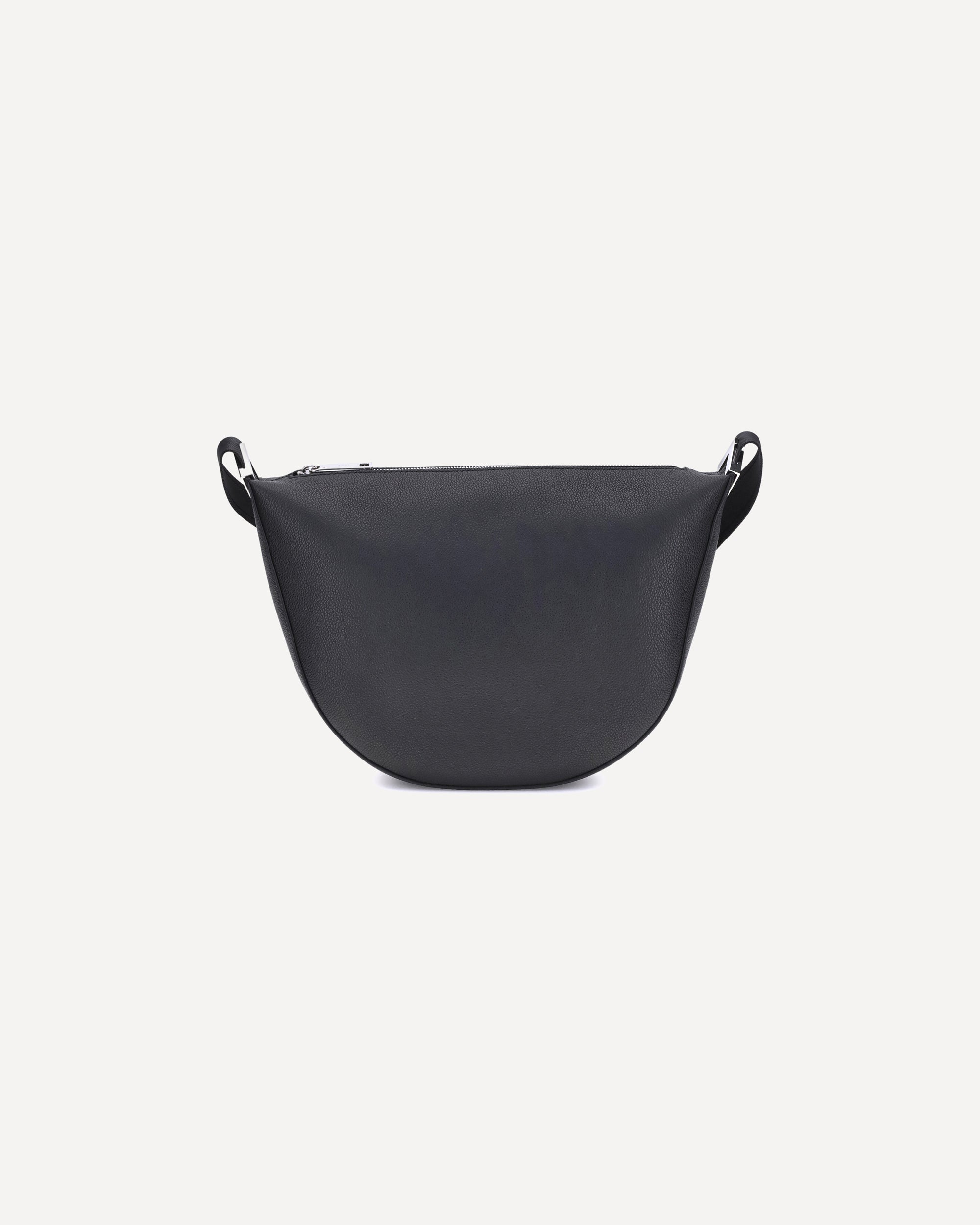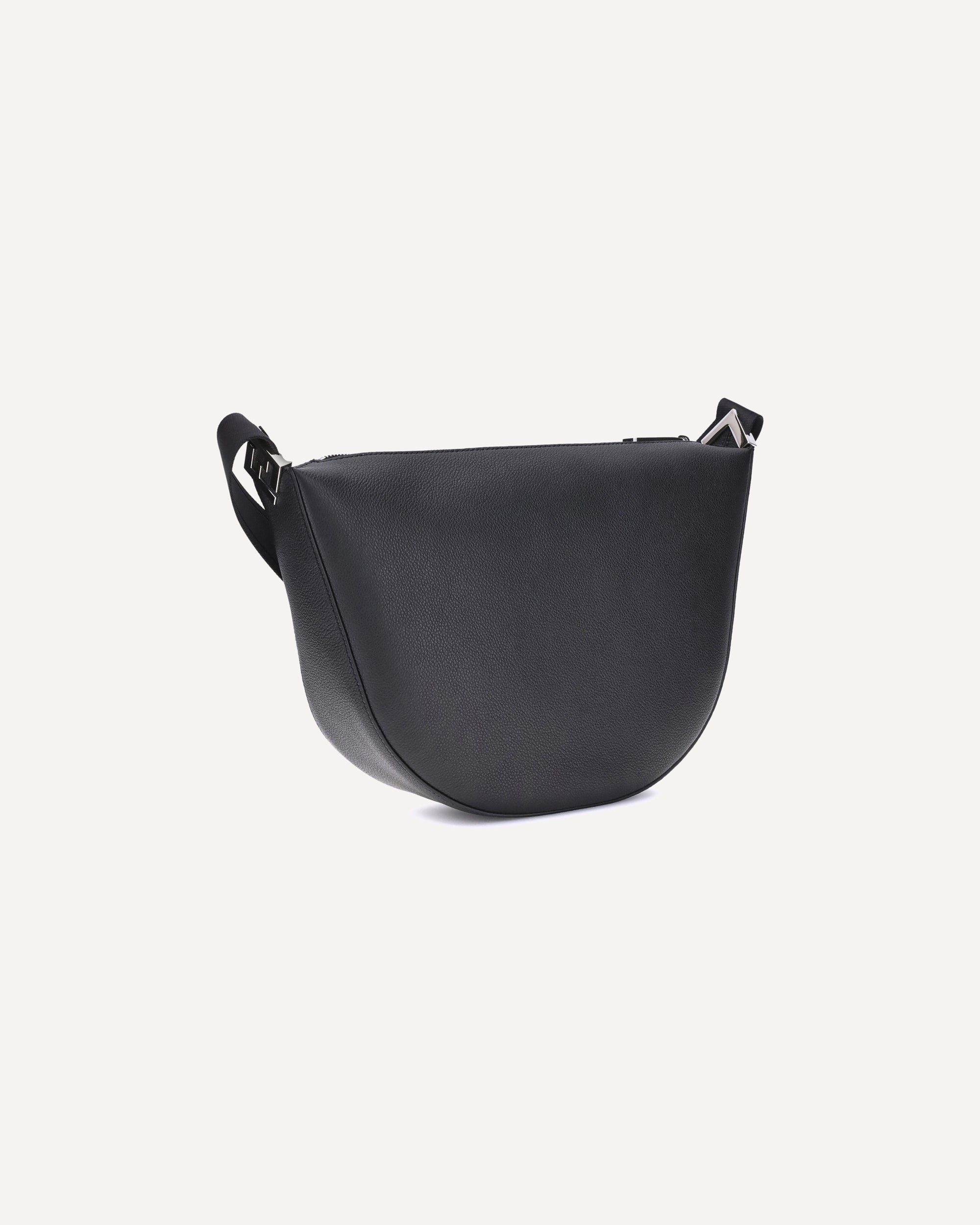 The Fendi Melon Shoulder Bag, in the medium size, stands out for its elegant half-moon shape. Crafted from black grained leather, it is embellished with metal FF appliques on the corners and palladium-finish accessories. The zip closure ensures practicality, while the adjustable crossbody strap in technical fabric, finished with FENDI lettering, adds a sporty and contemporary touch to the sophisticated design.