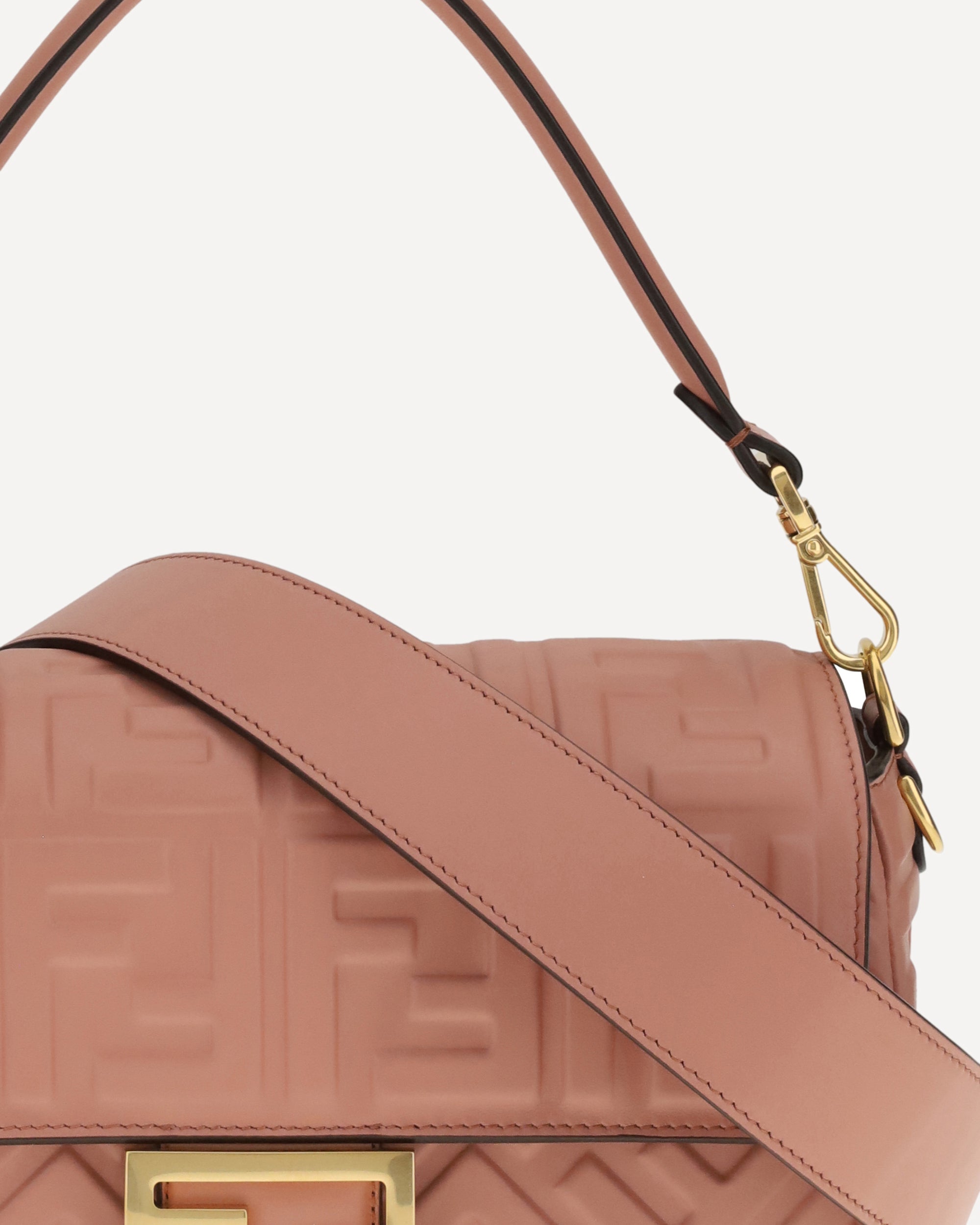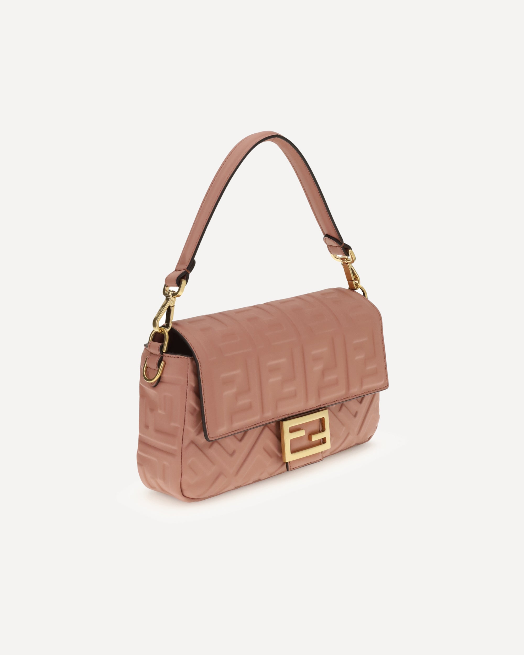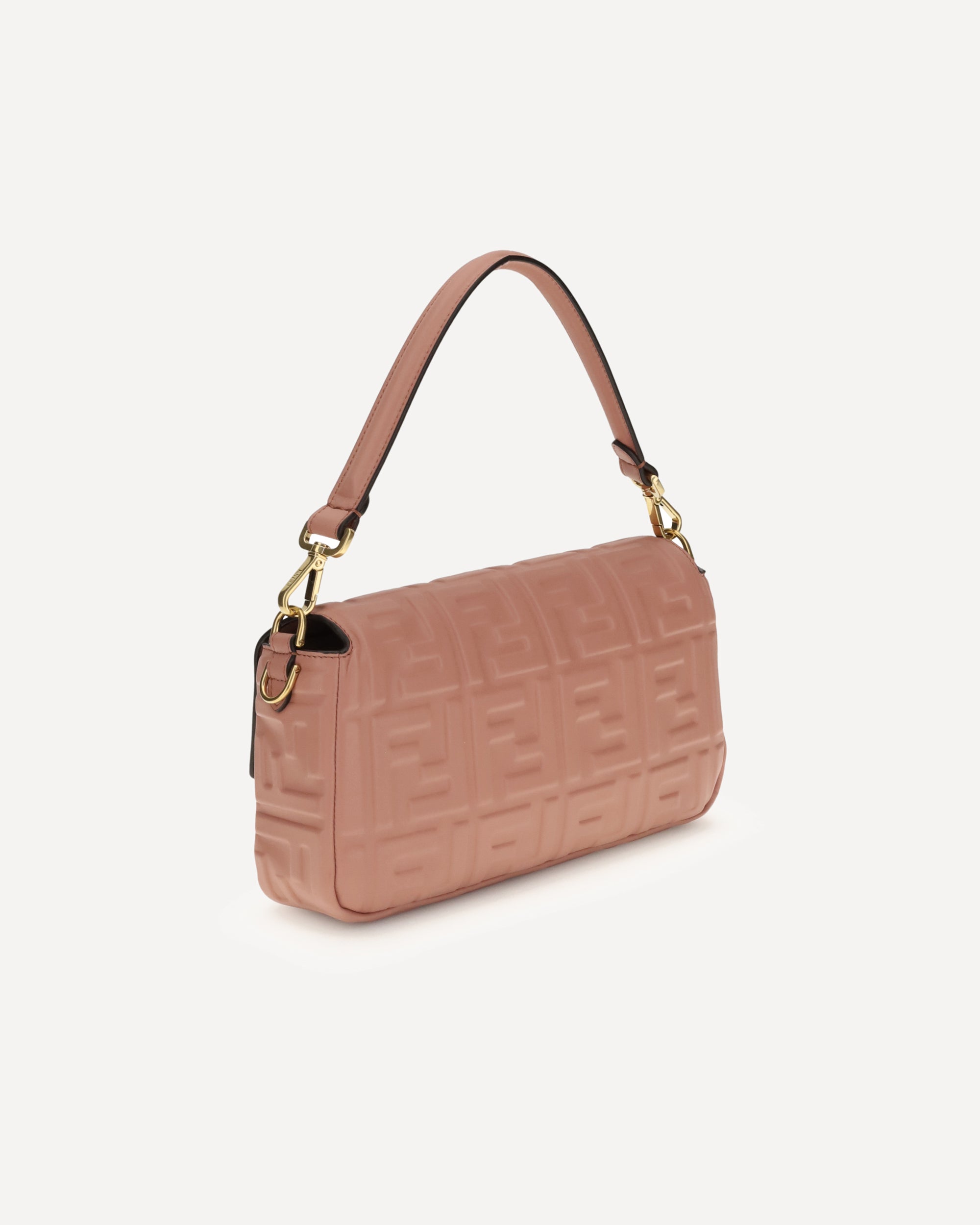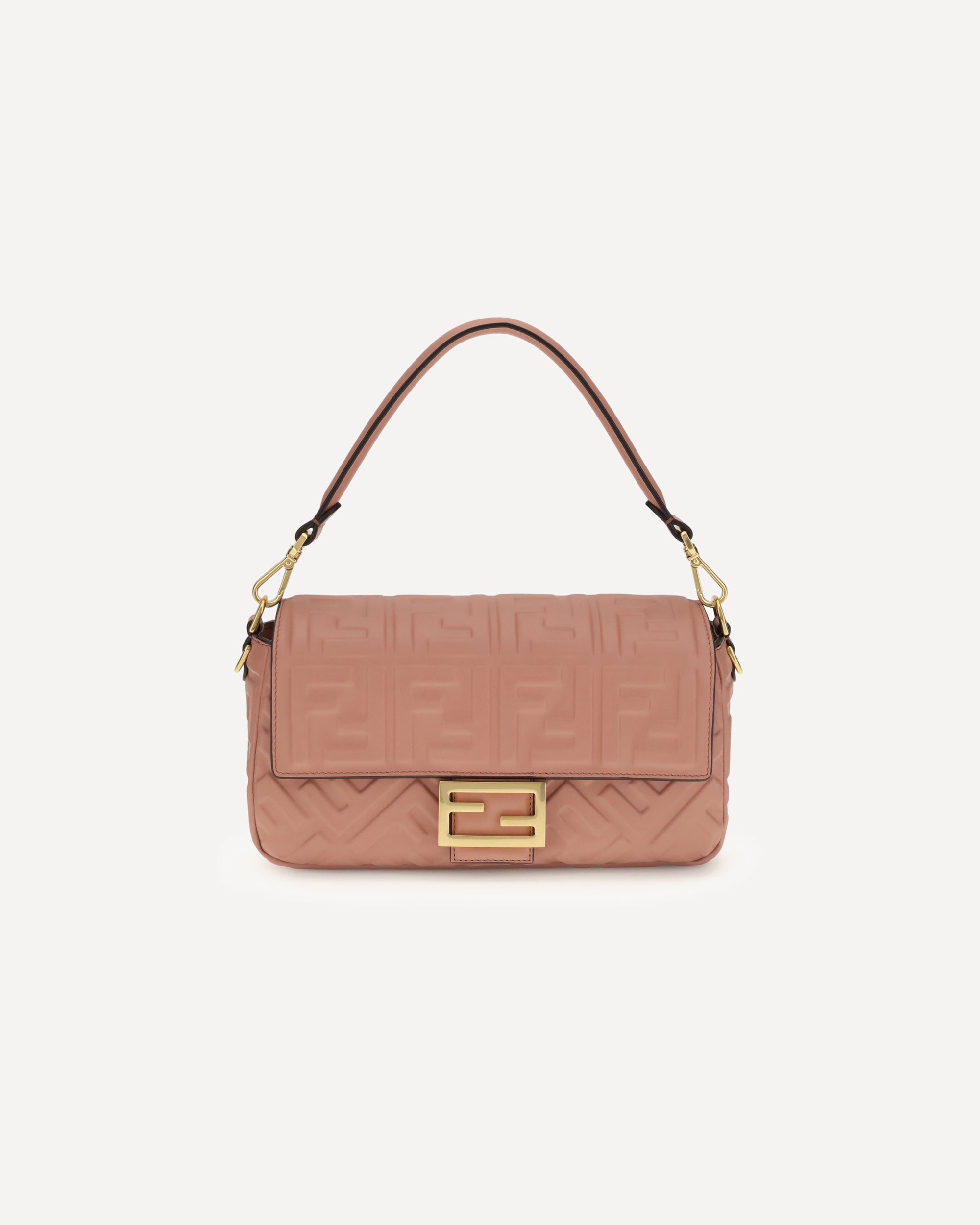The Baguette Shoulder Bag by Fendi is made of pink calfskin leather with embossed FF pattern. It features magnetic flap closure with FF logo, tone-on-tone nappa leather interior with zipper pocket, and vintage gold-tone metal hardware. A versatile and timeless model to carry under the arm.