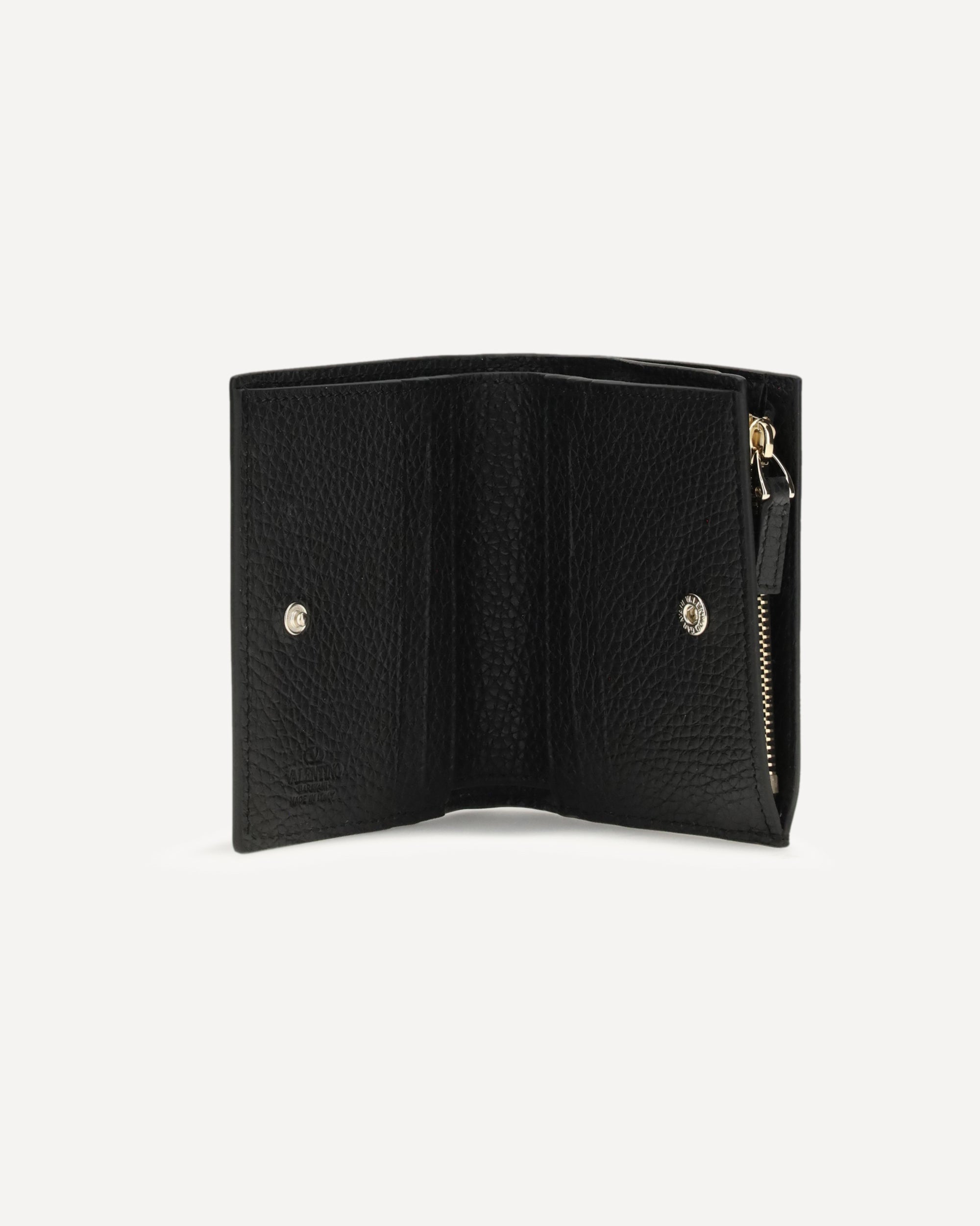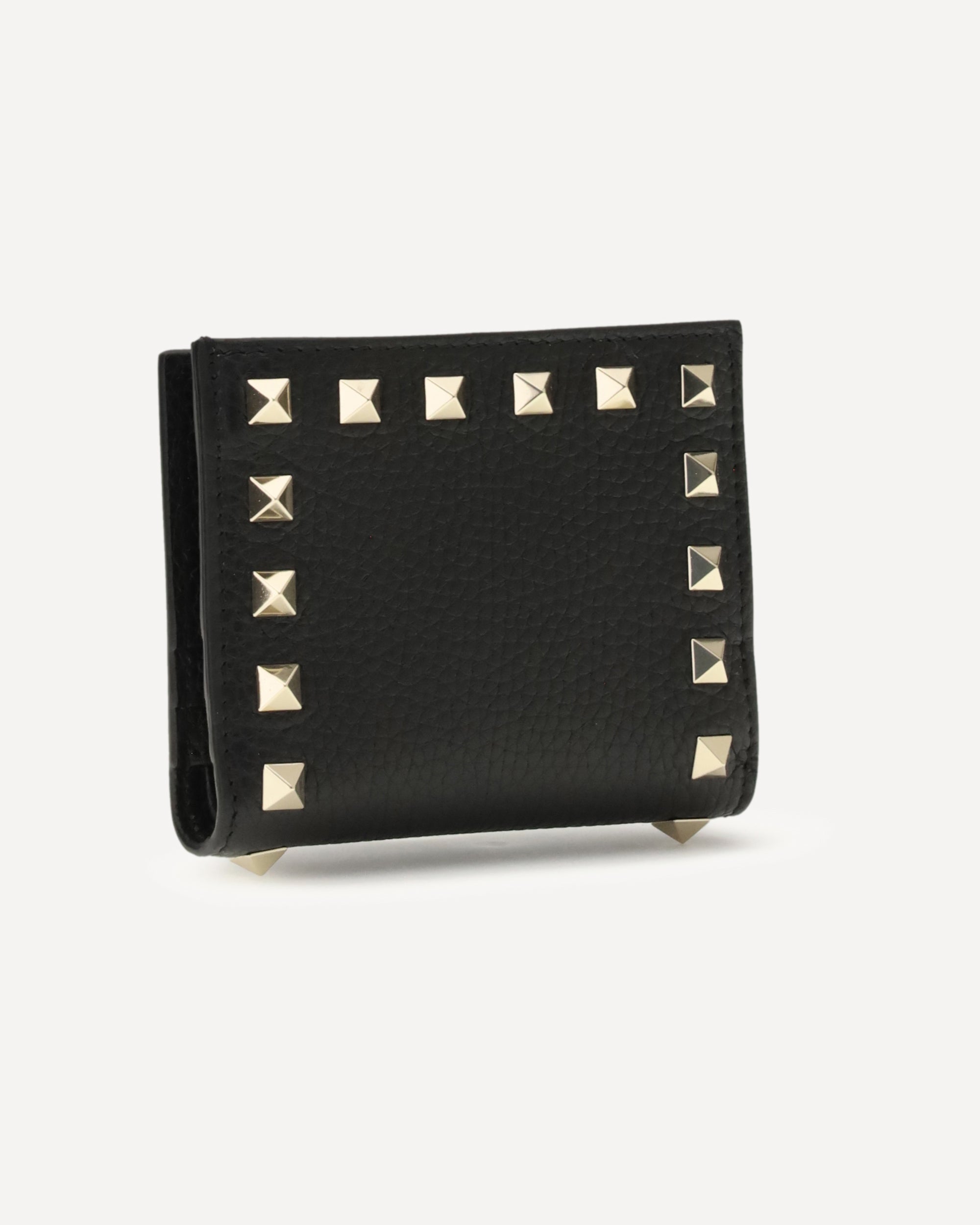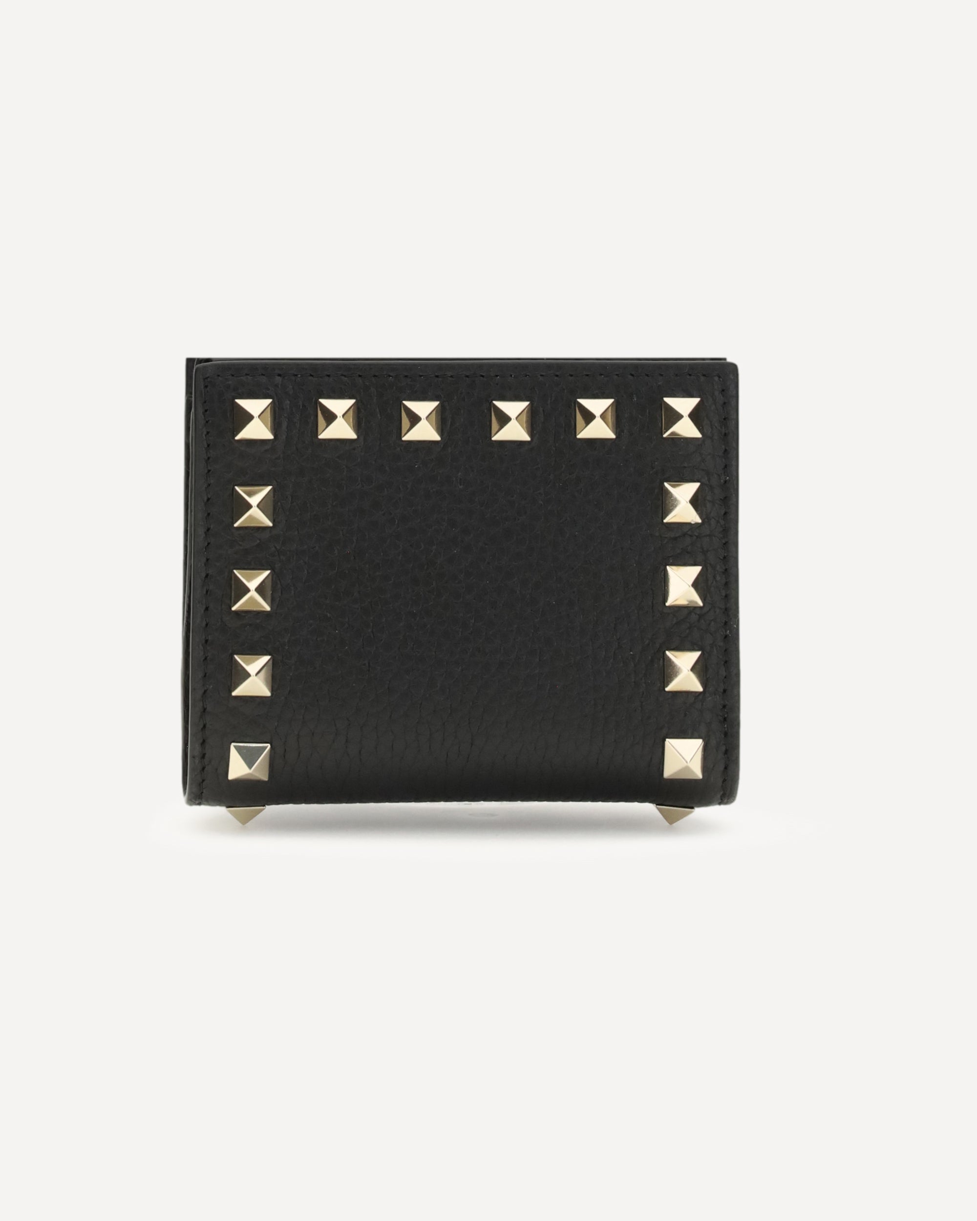 The Rockstud Wallet by Valentino Garavani in grained leather blends character and practicality. Iconic studs outline the silhouette, while the well-structured interior features six card slots, a zipped pocket, and a horizontal bill compartment. A laminated logo adds a refined signature finish.