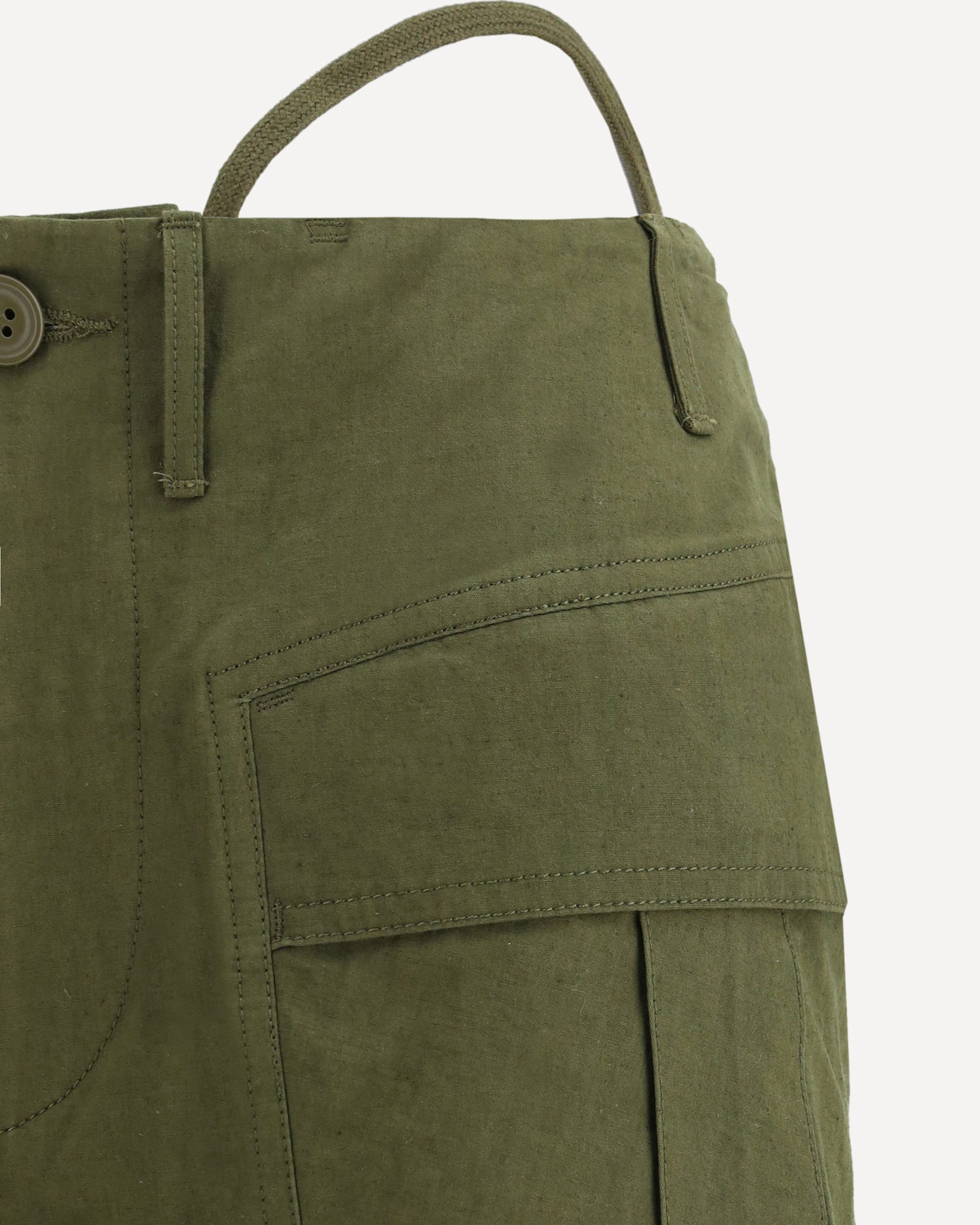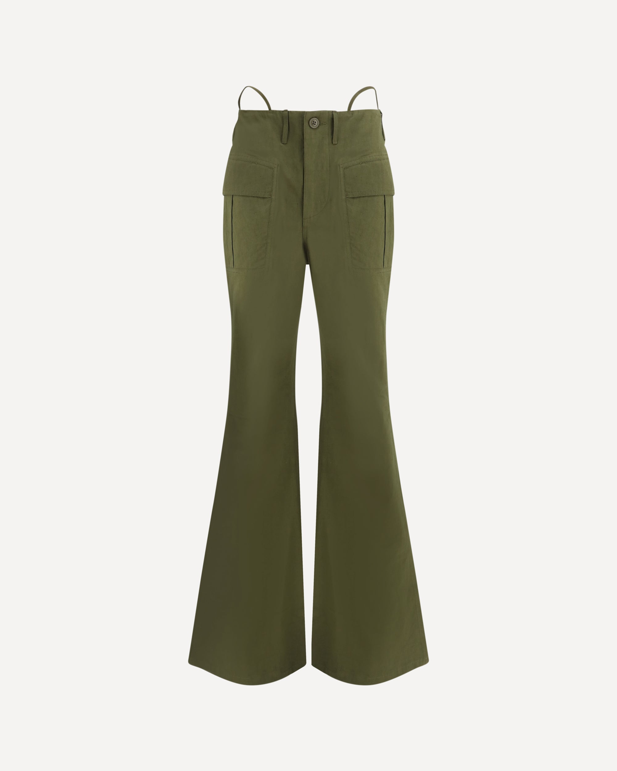 R13's cotton Pants have a flared pattern and a button and zipper closure. They feature two maxi cargo patch pockets on the front and belt loops on the waistband, offering a casual and functional look with a touch of style.