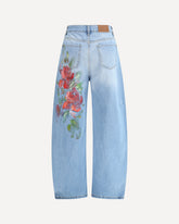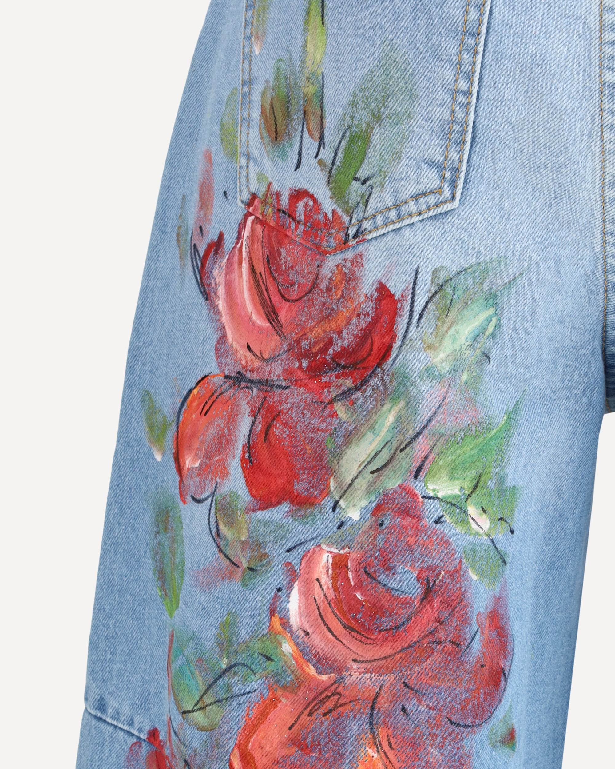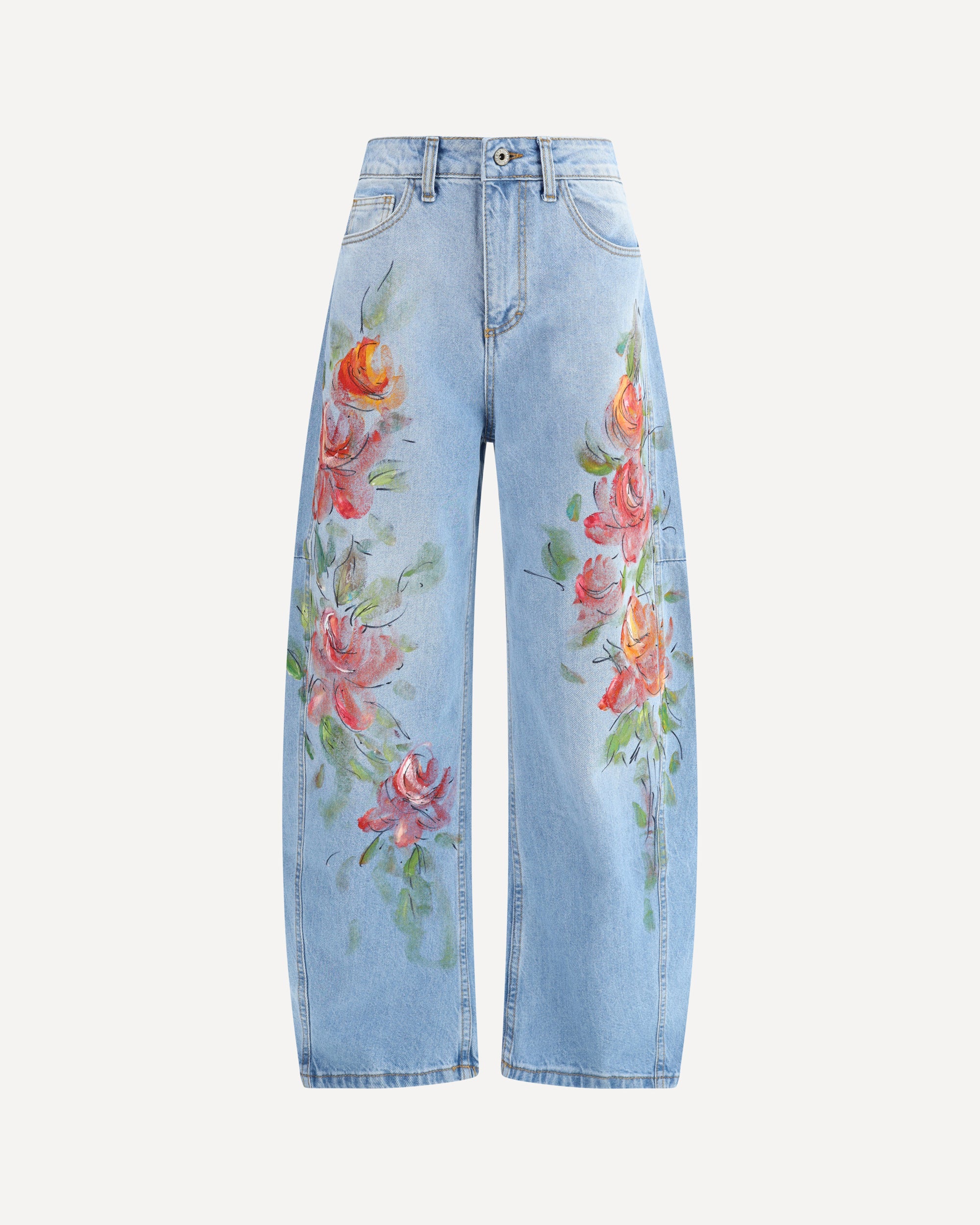 Ella's floral-print jeans are a unique and creative piece with a five-pocket balloon pattern that offers a modern and comfortable silhouette. The front zipper-and-button closure ensures practicality, while belt loops at the waistband allow you to customize the fit. Painted flowers on the front give an artistic and fresh touch, making these jeans ideal for those looking for an original and stylish look.