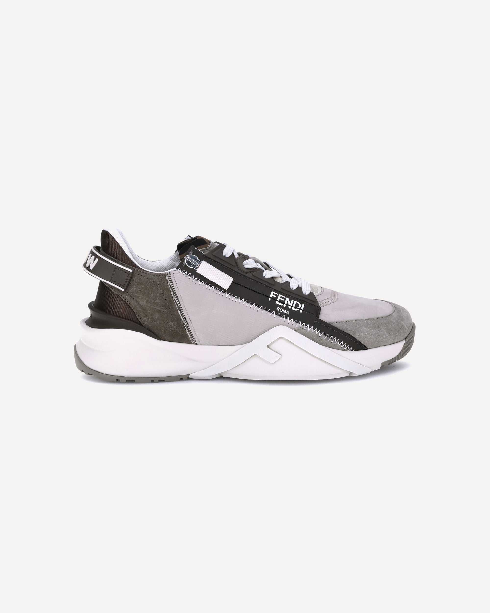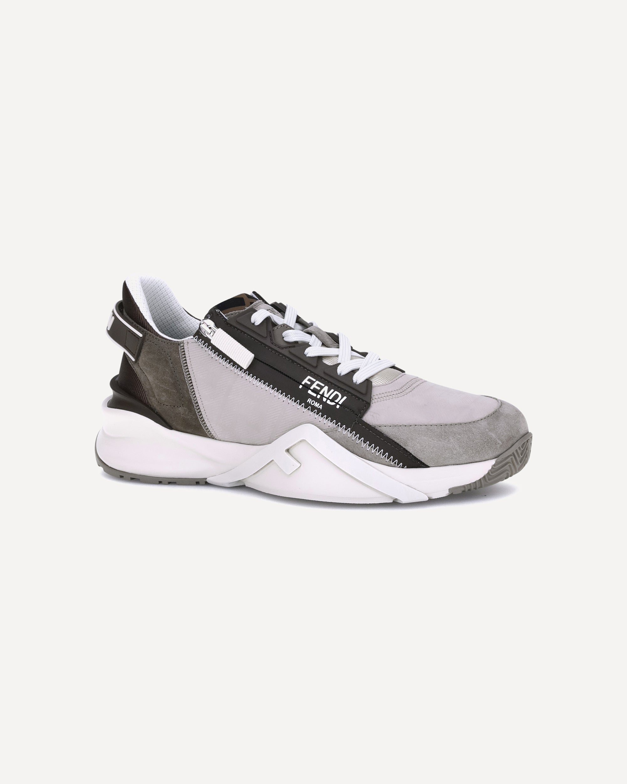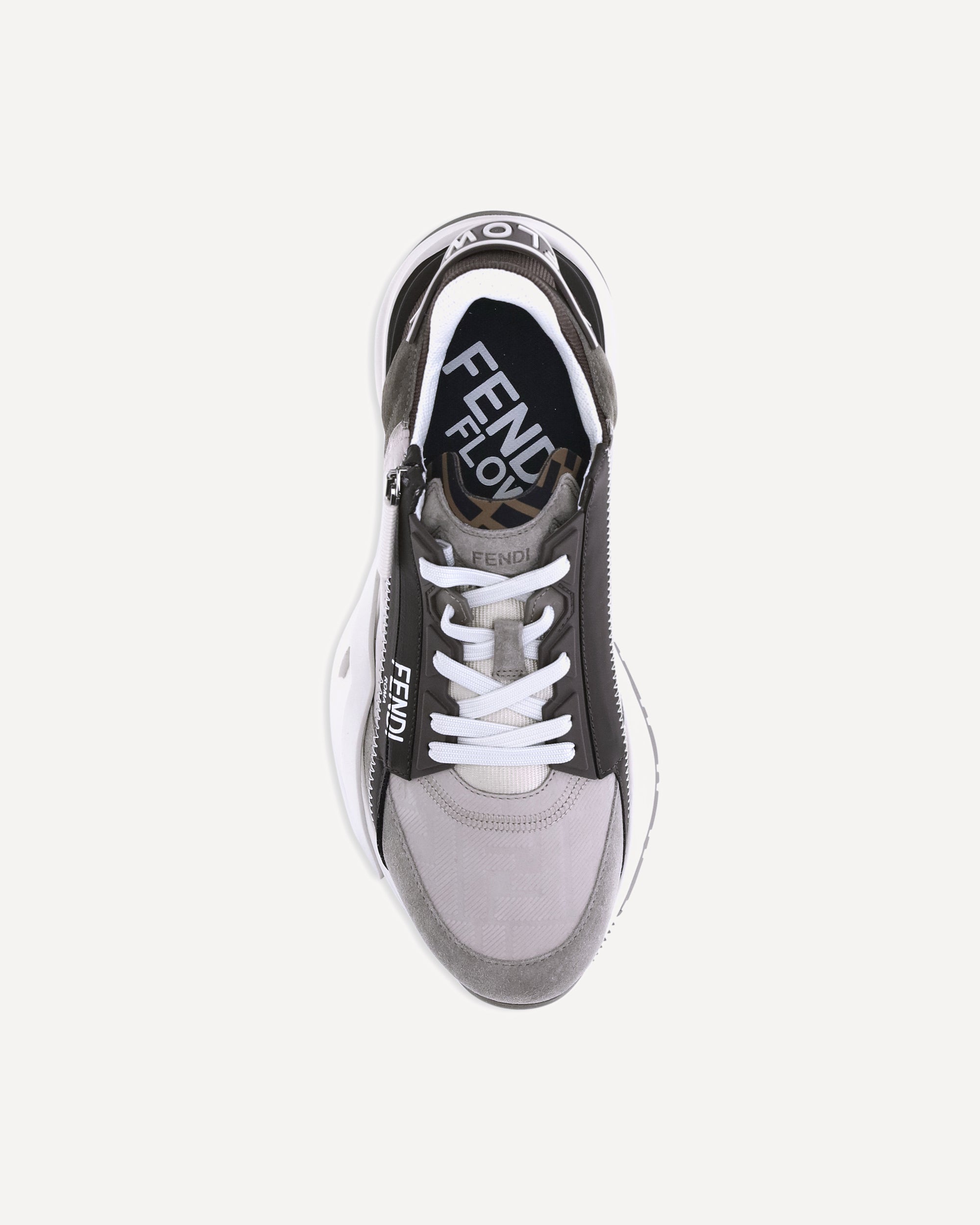 The Fendi Flow leather Sneakers are a bold and contemporary model that combines comfort and luxury. With a structured sole, these sneakers offer excellent grip and stability. The elongated toe gives a slender look, while the side panels, decorated with the brand's embossed FF print, emphasize the Fendi identity in an elegant way. The contrasting panel design creates a dynamic look, while the logo press-stud label on the tongue and the zip applied on the instep offer practicality and an additional stylistic detail. The front lace-up closure ensures a comfortable and secure fit, completing the sophisticated design of these sneakers.