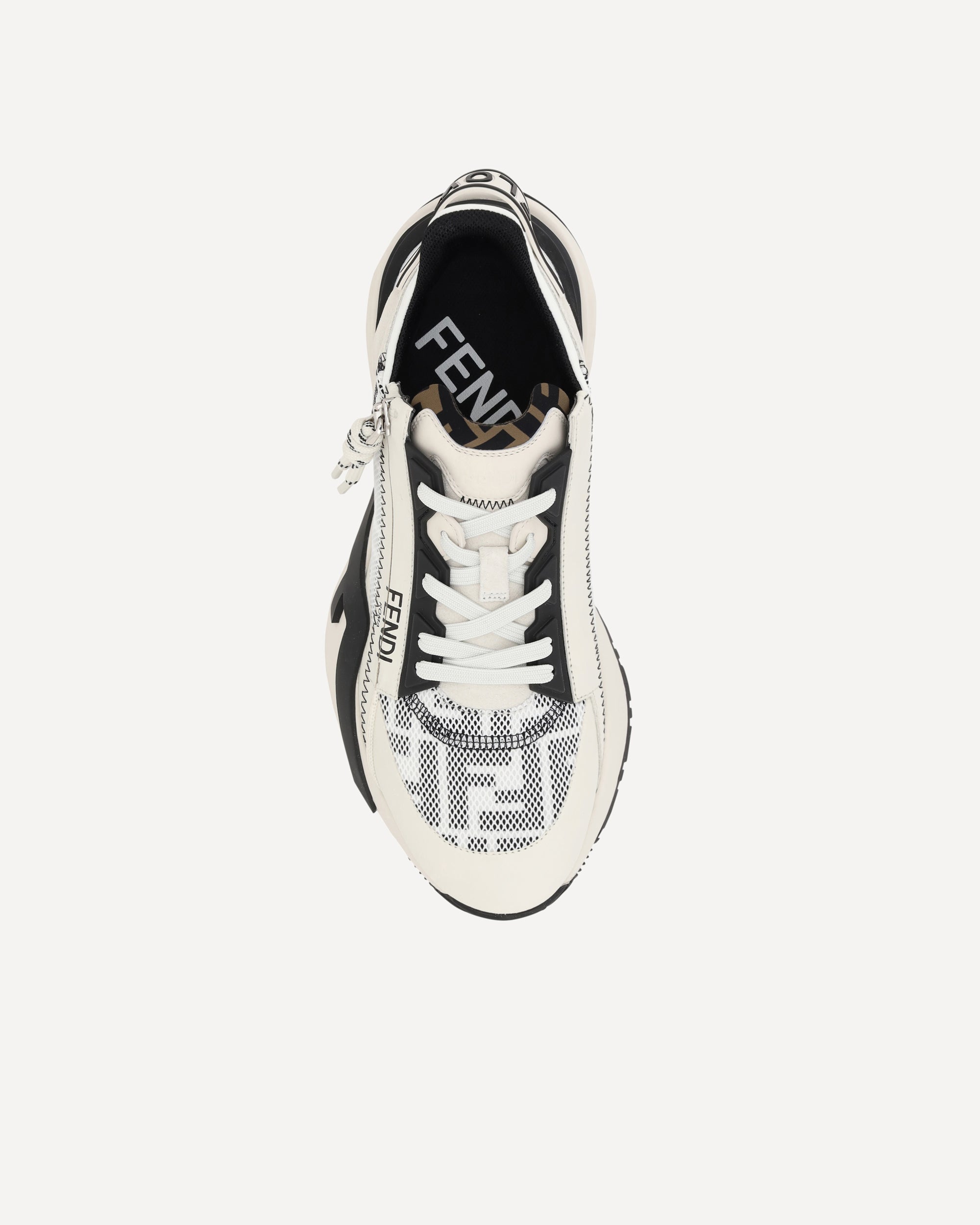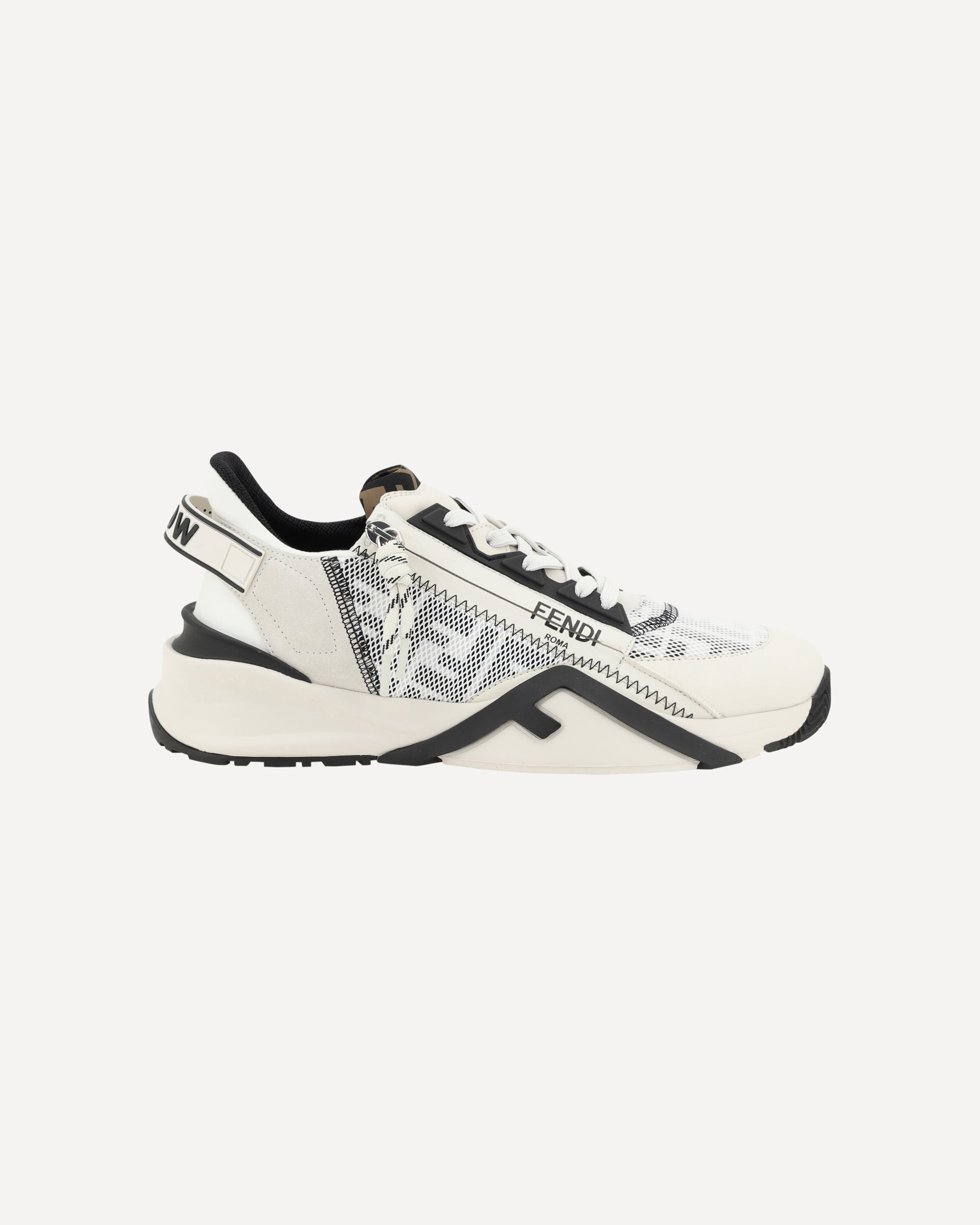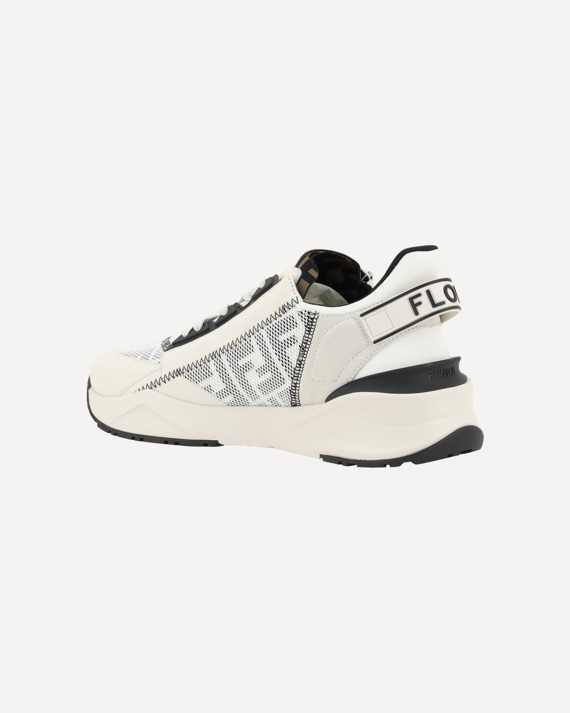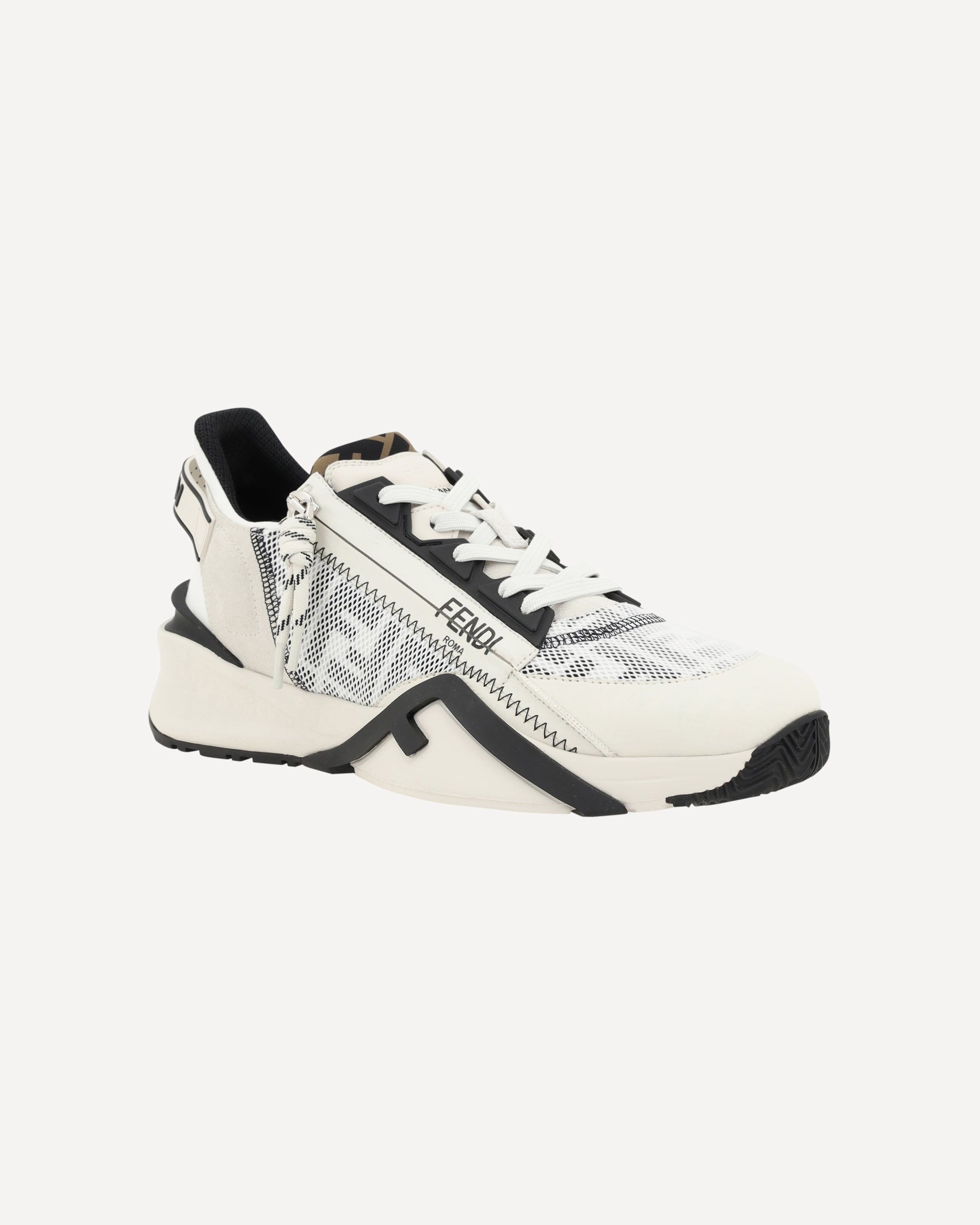 Fendi's Flow leather Sneakers are a bold and contemporary design that combines comfort and luxury. With a textured sole, these sneakers offer excellent grip and stability. The elongated toe gives a sleek look, while the side panels, decorated with the brand's embossed FF print, emphasize Fendi's identity in an elegant way. The contrasting panel design creates a dynamic look, while the logo-embossed press-stud label on the tongue and the zipper appliqué on the back of the foot offer practicality and an additional stylistic detail. The front lace-up closure ensures a comfortable and secure fit, complementing the sophisticated design of these sneakers.