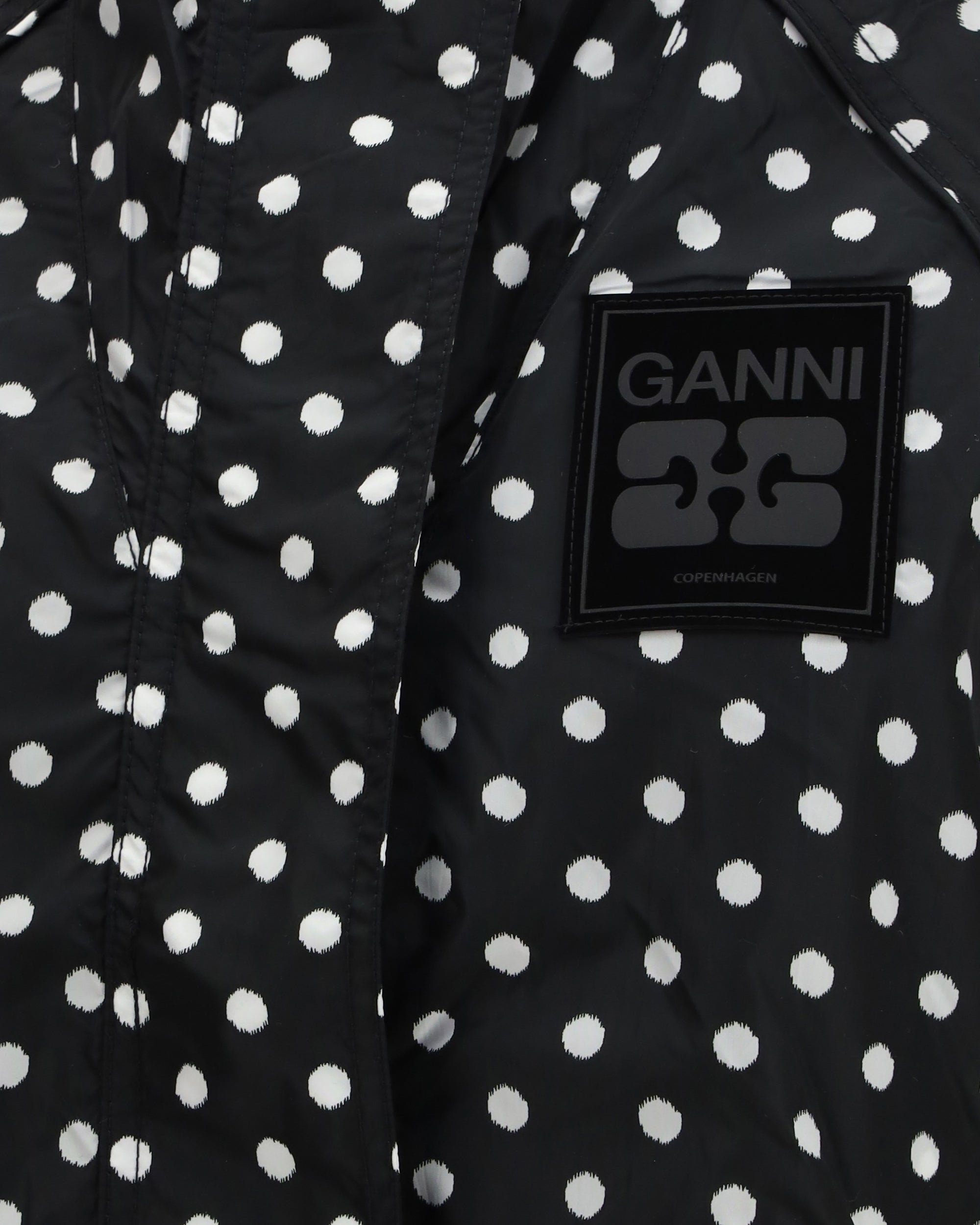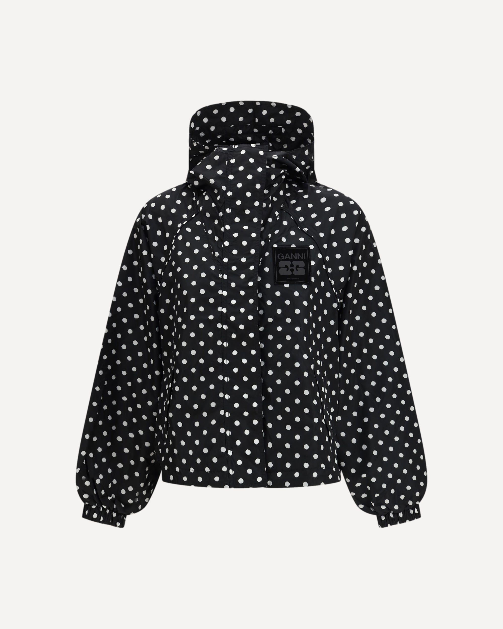 The Printed Nylon Jacket by GANNI captures the brand’s playful yet modern urban spirit. Crafted from lightweight nylon with a polka-dot print, it features a relaxed silhouette enhanced by wide, loose sleeves that create effortless movement. The hood and front zip closure emphasize its functional appeal, while zipped side pockets add everyday practicality. A GANNI logo patch on the chest provides a distinctive graphic signature. A versatile outerwear piece designed to elevate contemporary looks with ease and character.