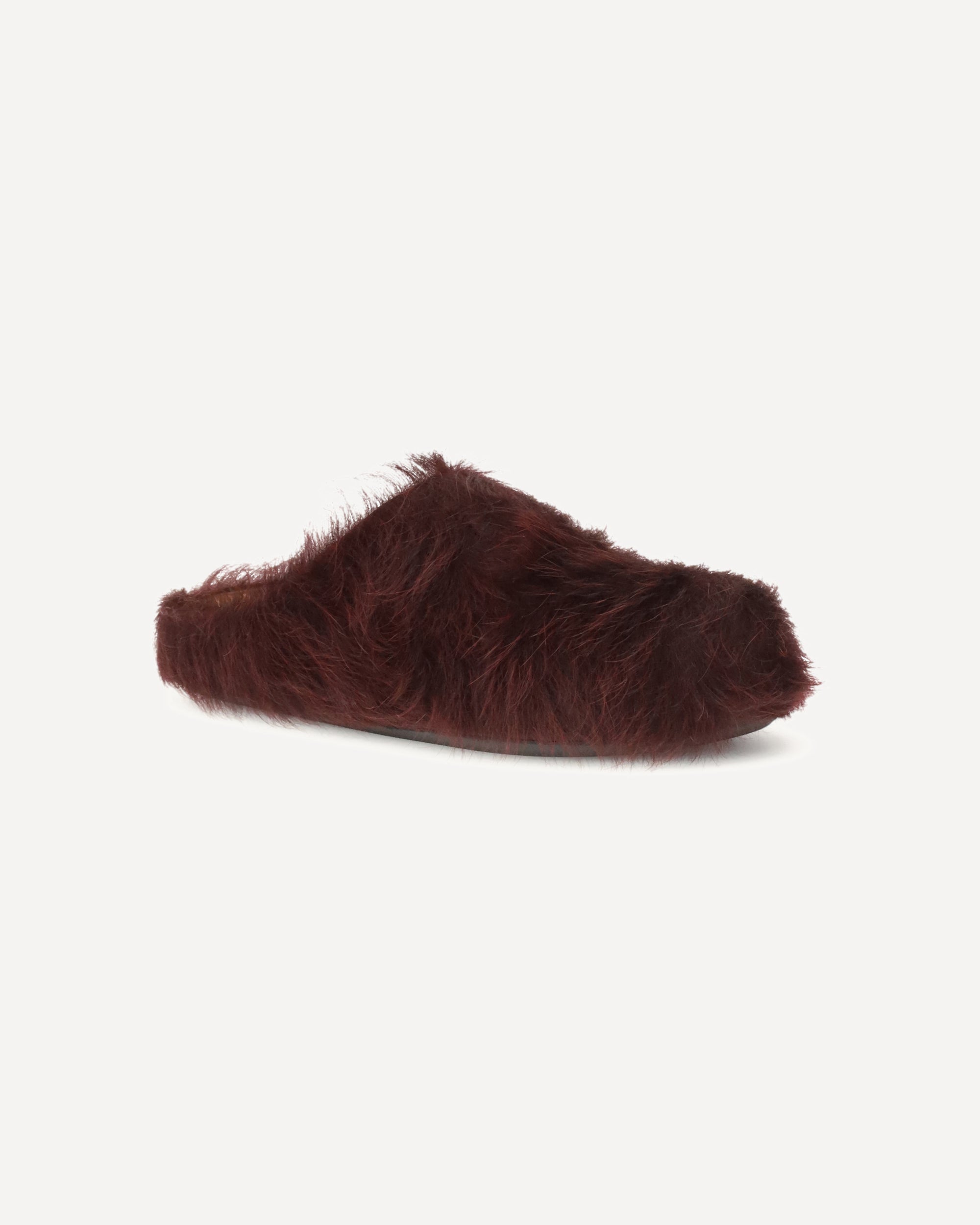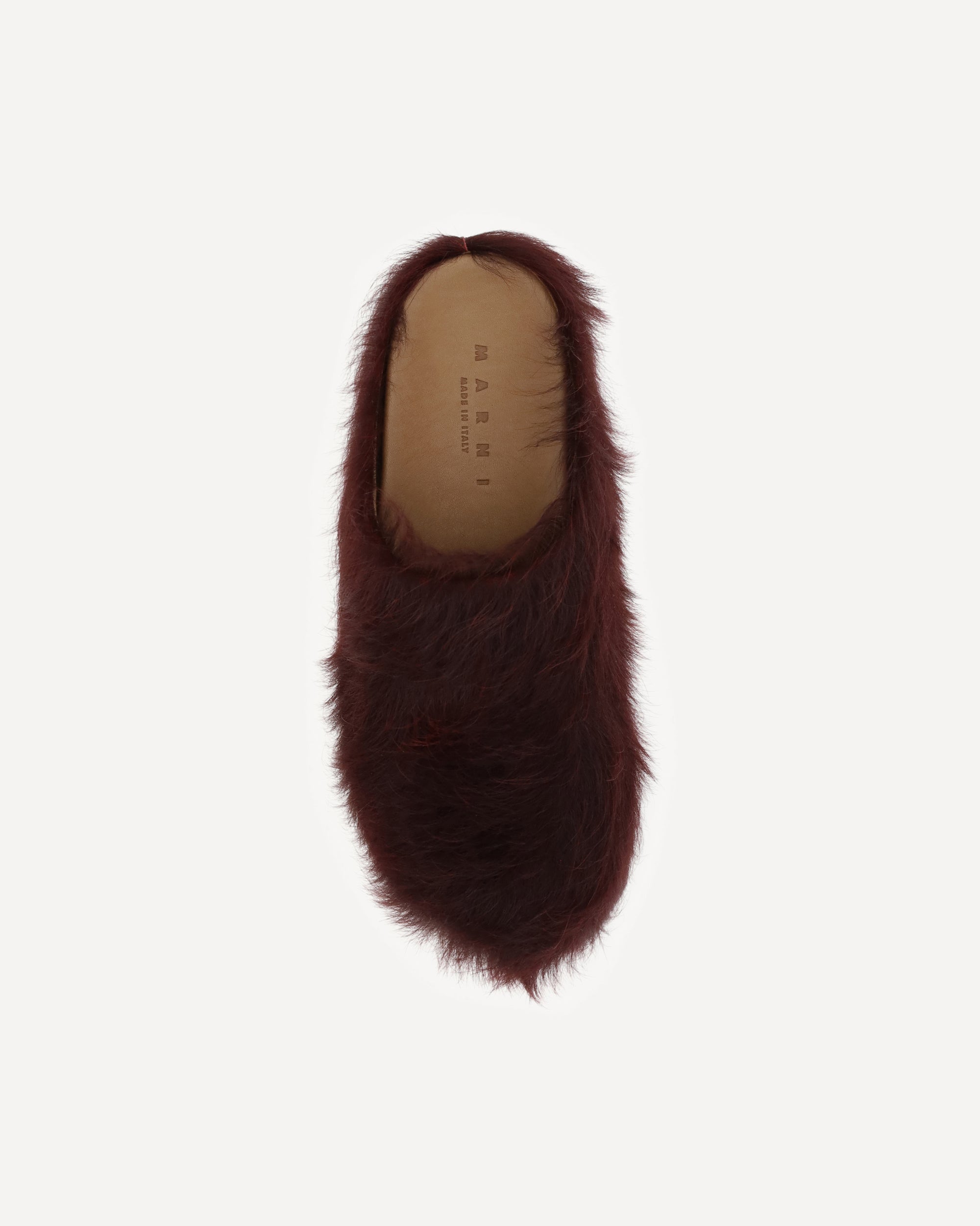 Marni's Fussbett Mules reinterpret an icon of the brand with a bold, textured twist. Made of long-haired calfskin, they stand out for their original and refined aesthetic. The anatomical leather insole ensures all-day comfort, while the knurled rubber sole provides stability and grip. A model with character, perfect for those who love Marni's unconventional style.