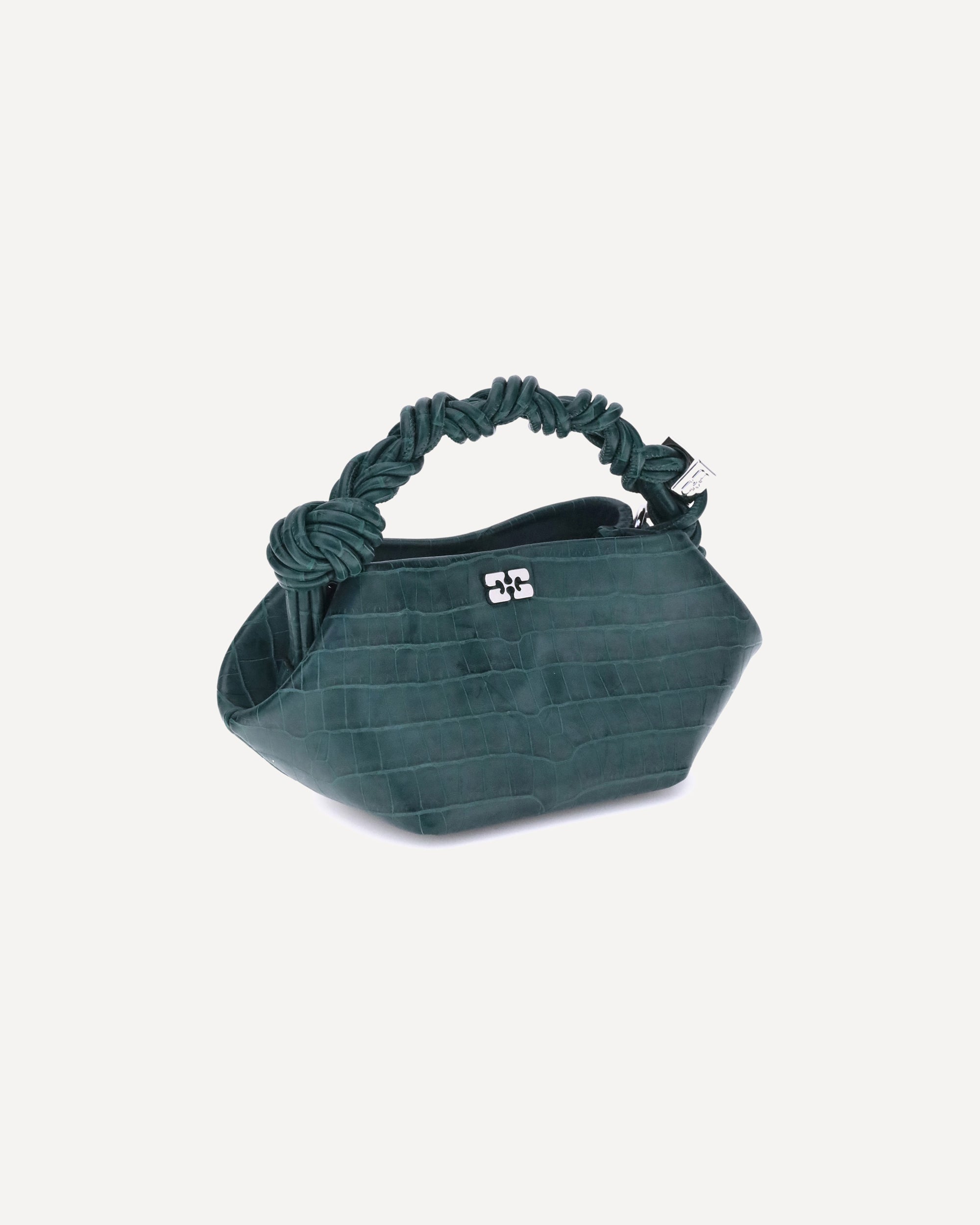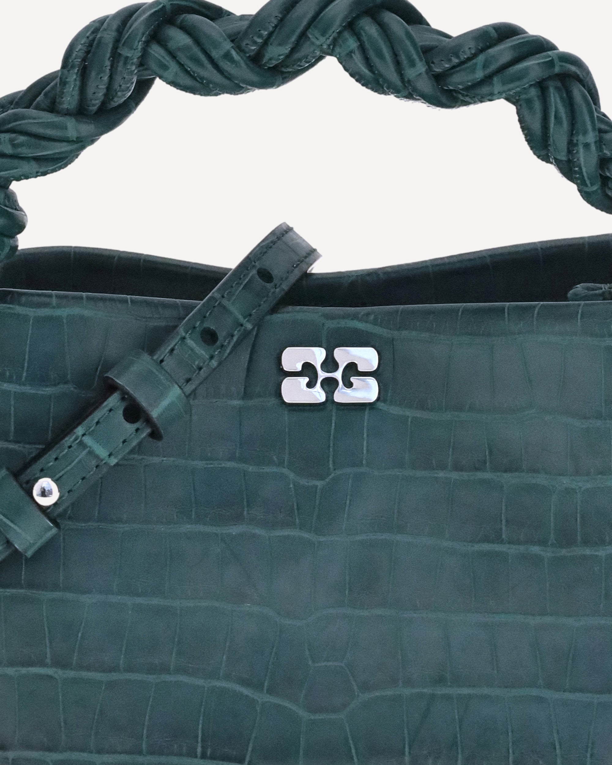 Bou mini crocodile patent leather Handbag by Ganni, This bag features a metallic silver-tone GANNI butterfly logo, a twisted handle with braided knot, and a metallic silver-tone nut with engraved GANNI butterfly logo. The bag has an interior magnetic closure, a flat credit card pocket, and an adjustable and removable shoulder strap for wearing over the shoulder.