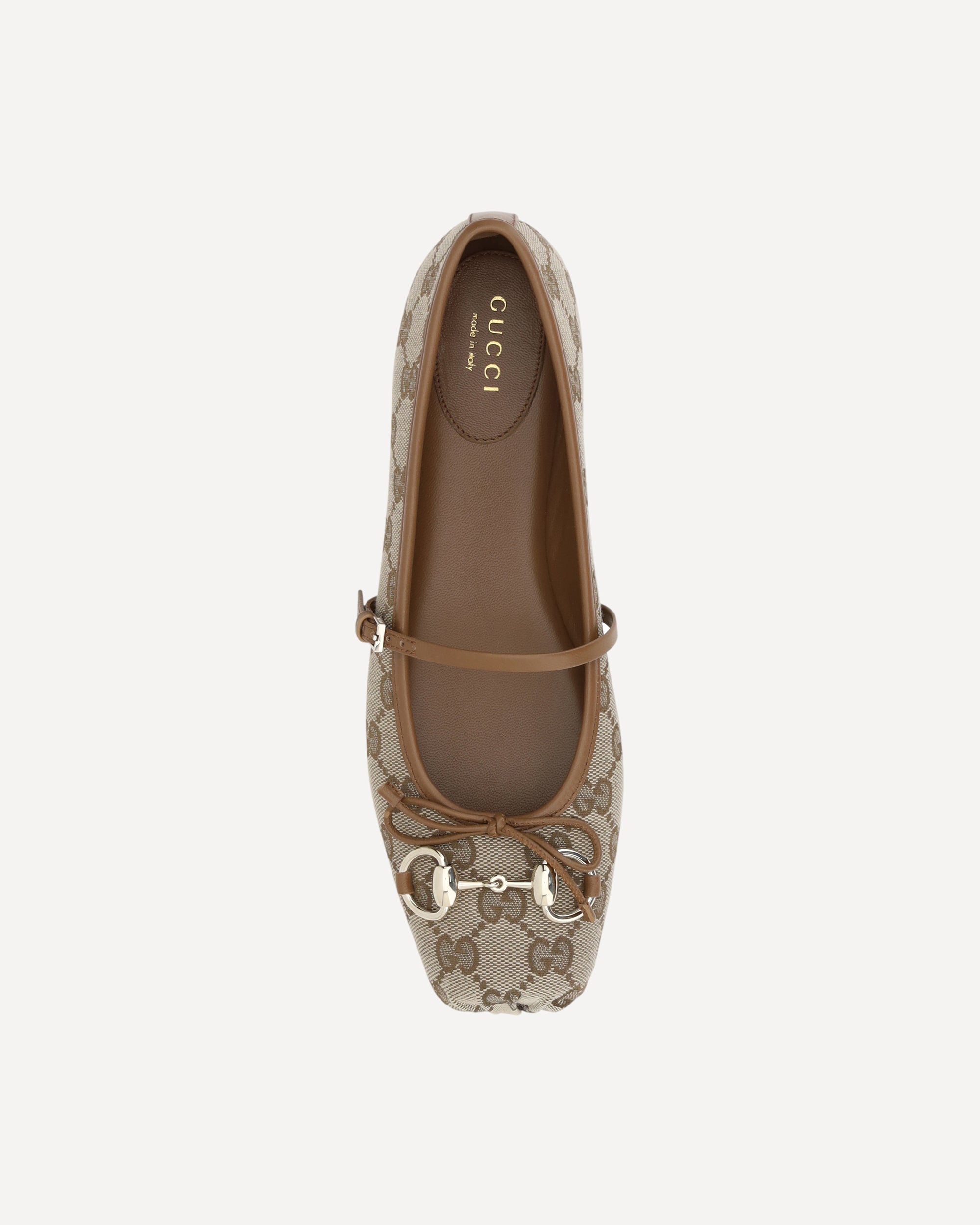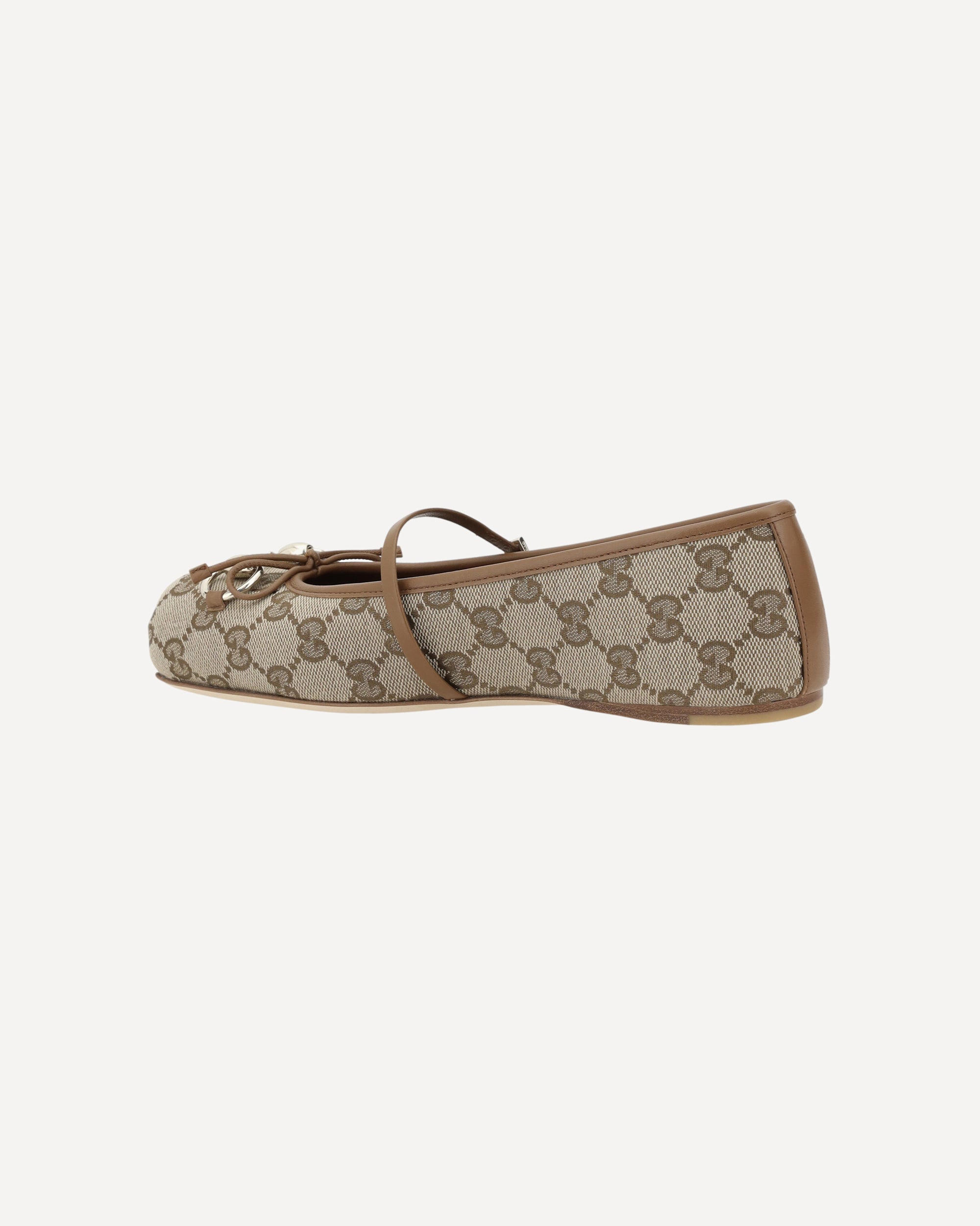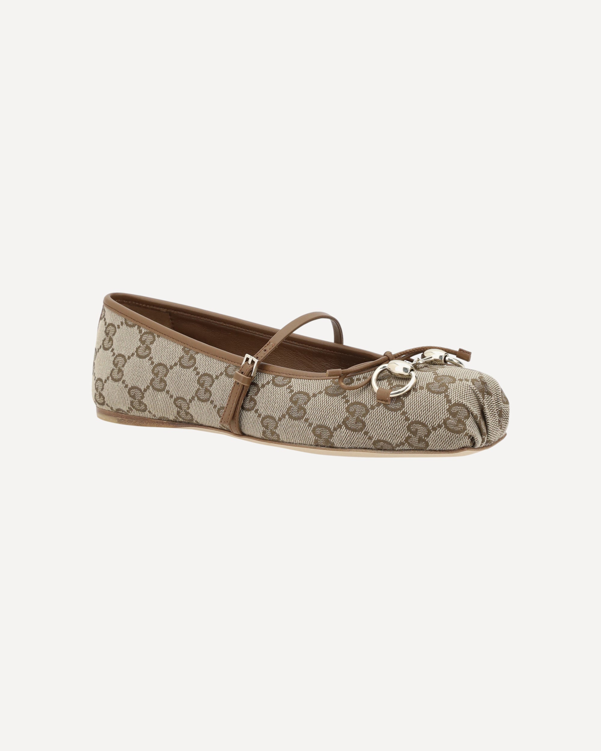 Gucci's canvas Ballerinas with all-over repeated iconic GG detail feature a square toe that lends a touch of modern elegance. The delicate bow detail adds a feminine and sophisticated element. The front closure features a buckle strap, lending a distinctive touch to the design. The padded, logo-embossed insole ensures comfort, complementing these ballet flats with an accent of luxury and unique style.