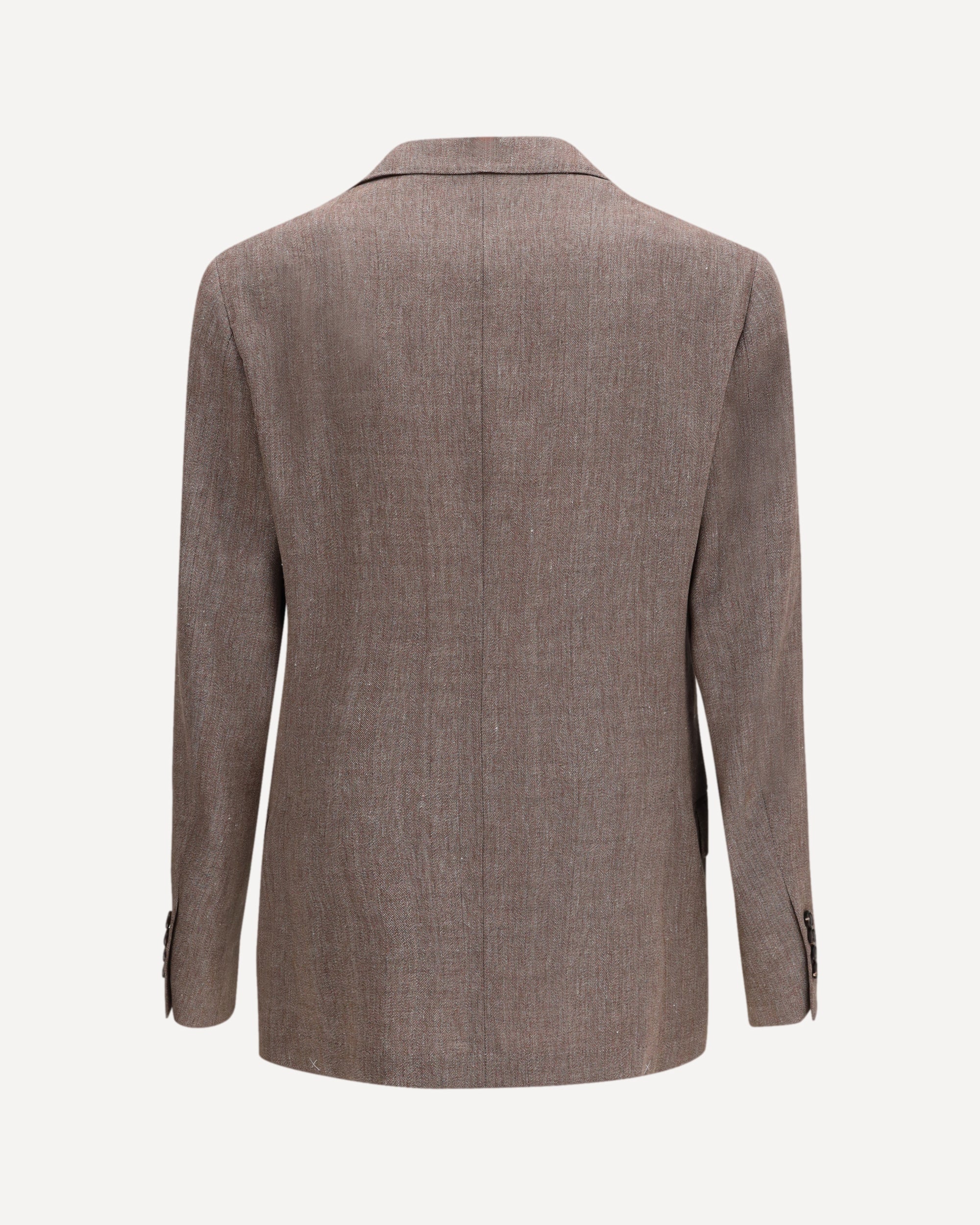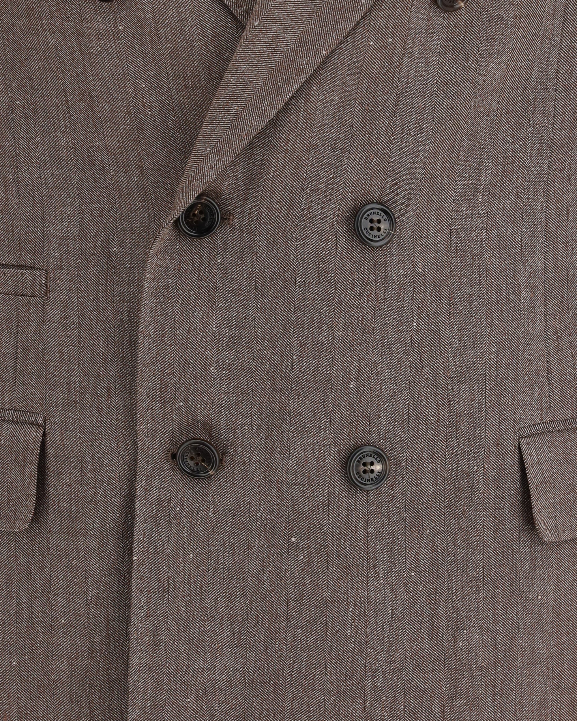 The double-breasted tailored Jacket by Brunello Cucinelli embodies refined elegance through premium materials and meticulous attention to detail. Crafted from a linen and wool blend with a sophisticated natural texture, it features a six-button double-breasted closure and peak lapels that enhance its formal appeal. A welt chest pocket and two front flap pockets complete the design, while long sleeves with four buttons at the cuffs and a central back vent ensure comfort and fit. The burgundy-toned internal lining and precise tailoring underline the garment’s artisanal excellence. Regular fit.