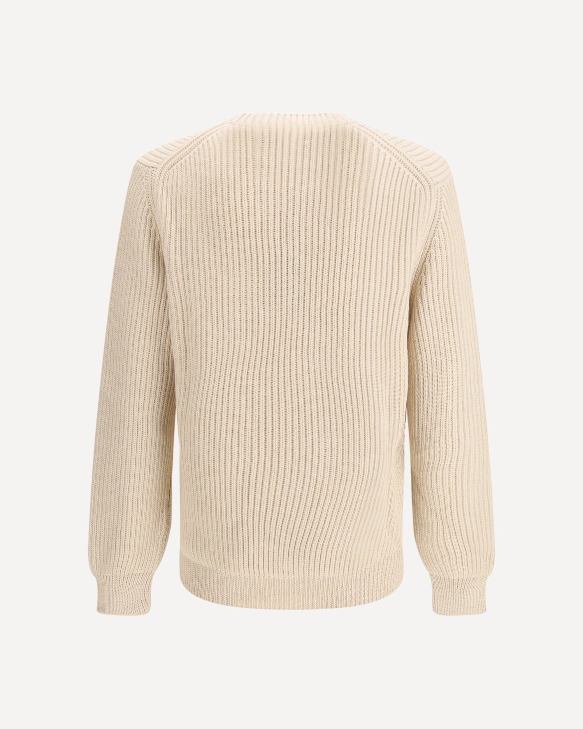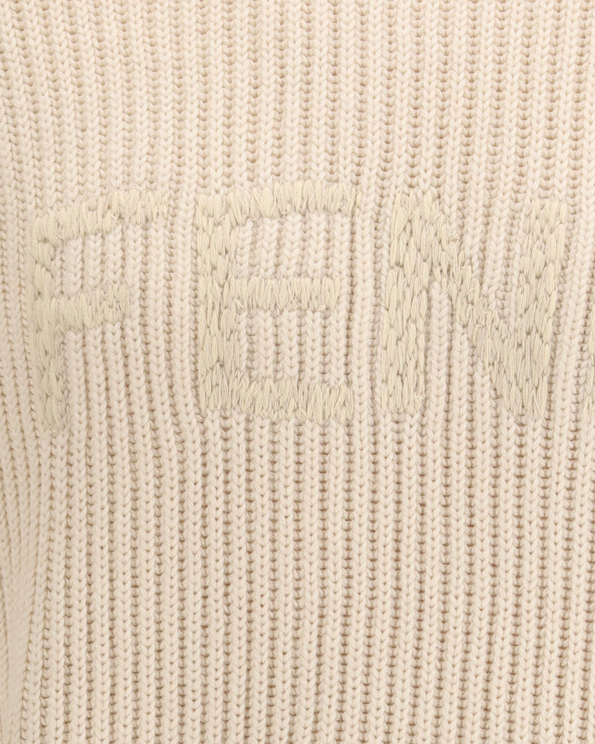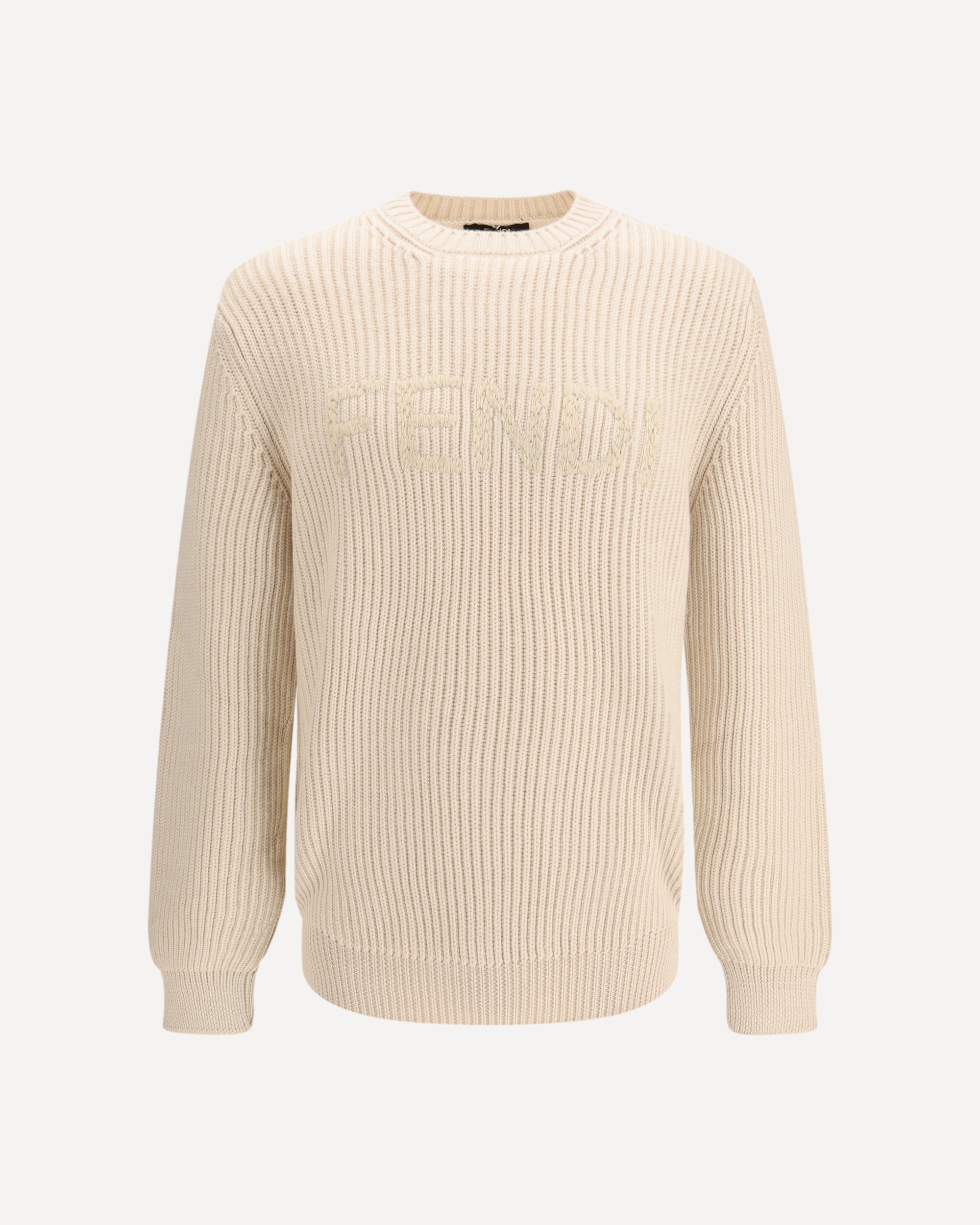 The pullover by Fendi is a regular-fit crew-neck Knit crafted from soft light grey wool yarn, finished in an English rib texture for a refined and structured look. The front is embellished with an oversized Fendi lettering embroidery in a tonal thread, giving the piece a distinctive and modern character.