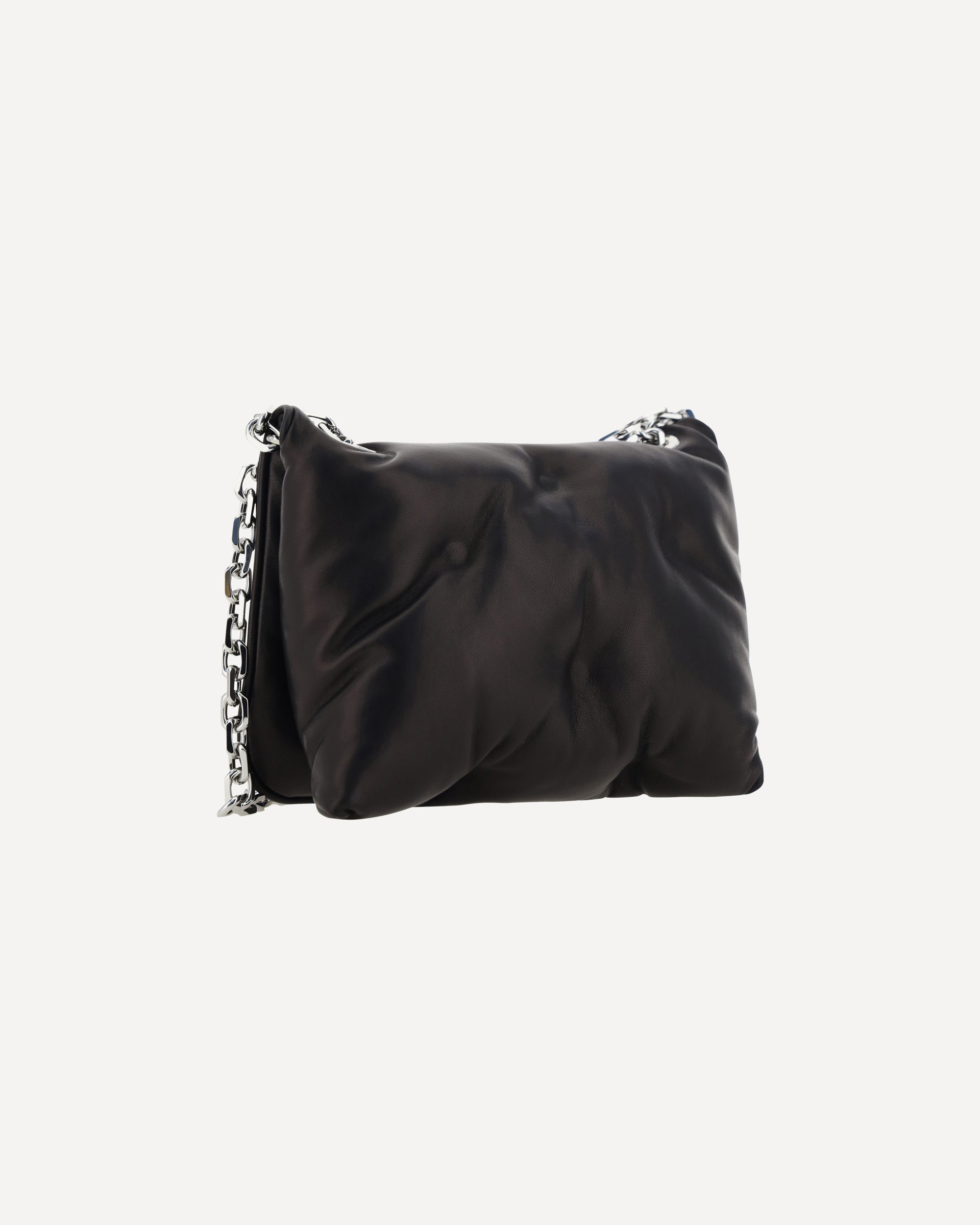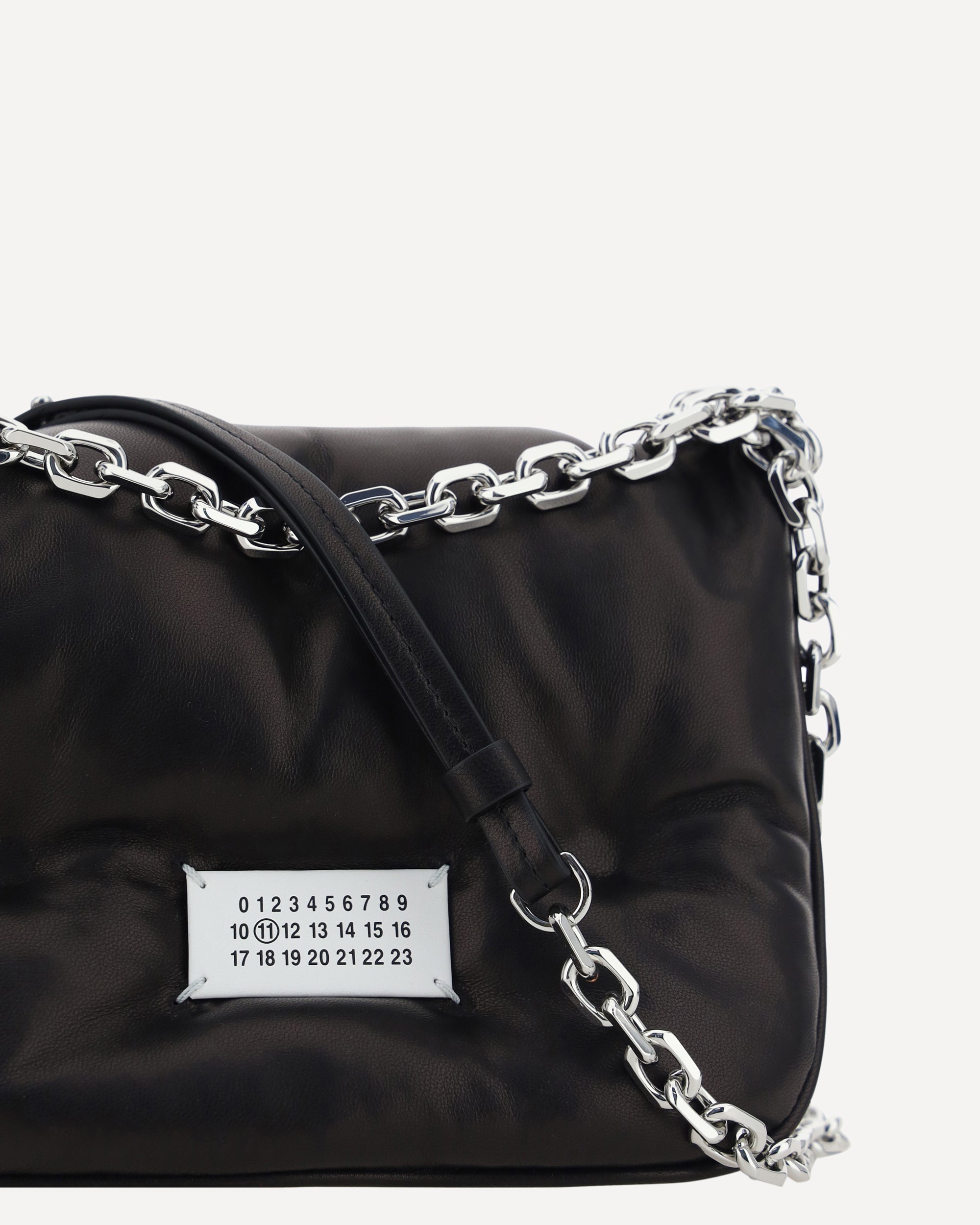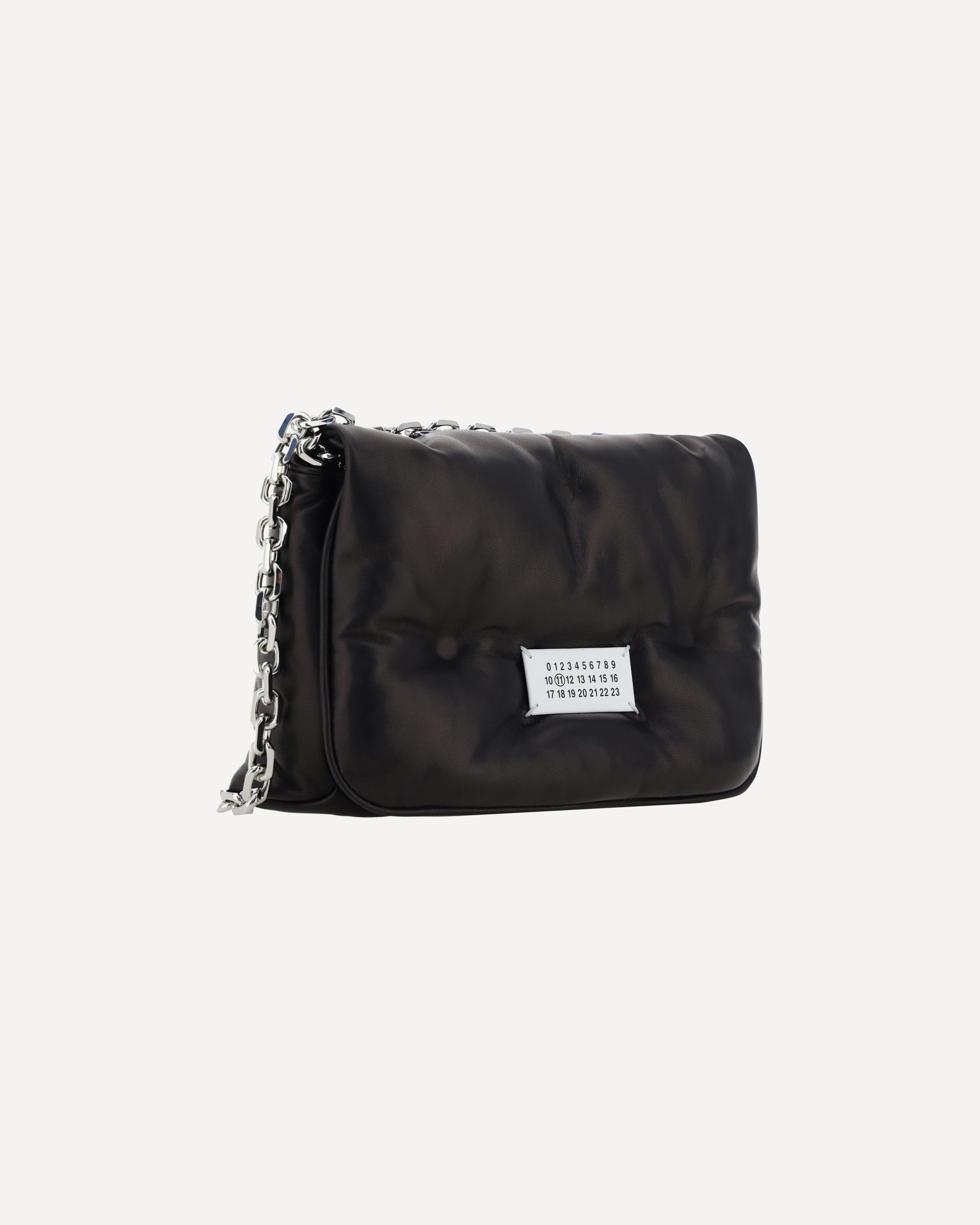 Calfskin Glam Slam Flap Shoulder Bag by Margiela, padded and quilted design, chain shoulder strap with sliding leather details, magnetic front closure, iconic fabric patch with contrasting embroidered brand signature on front, interior welt pocket.