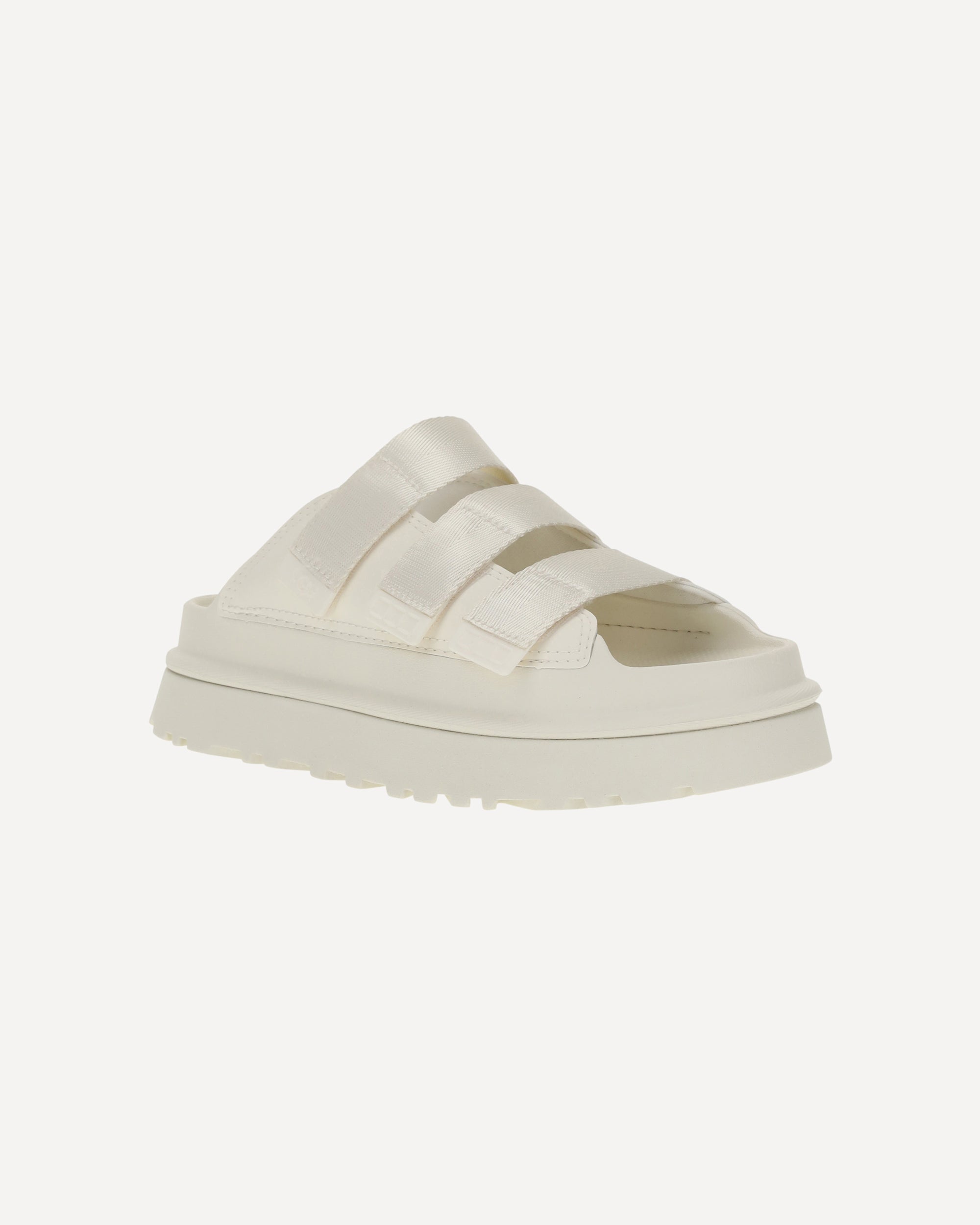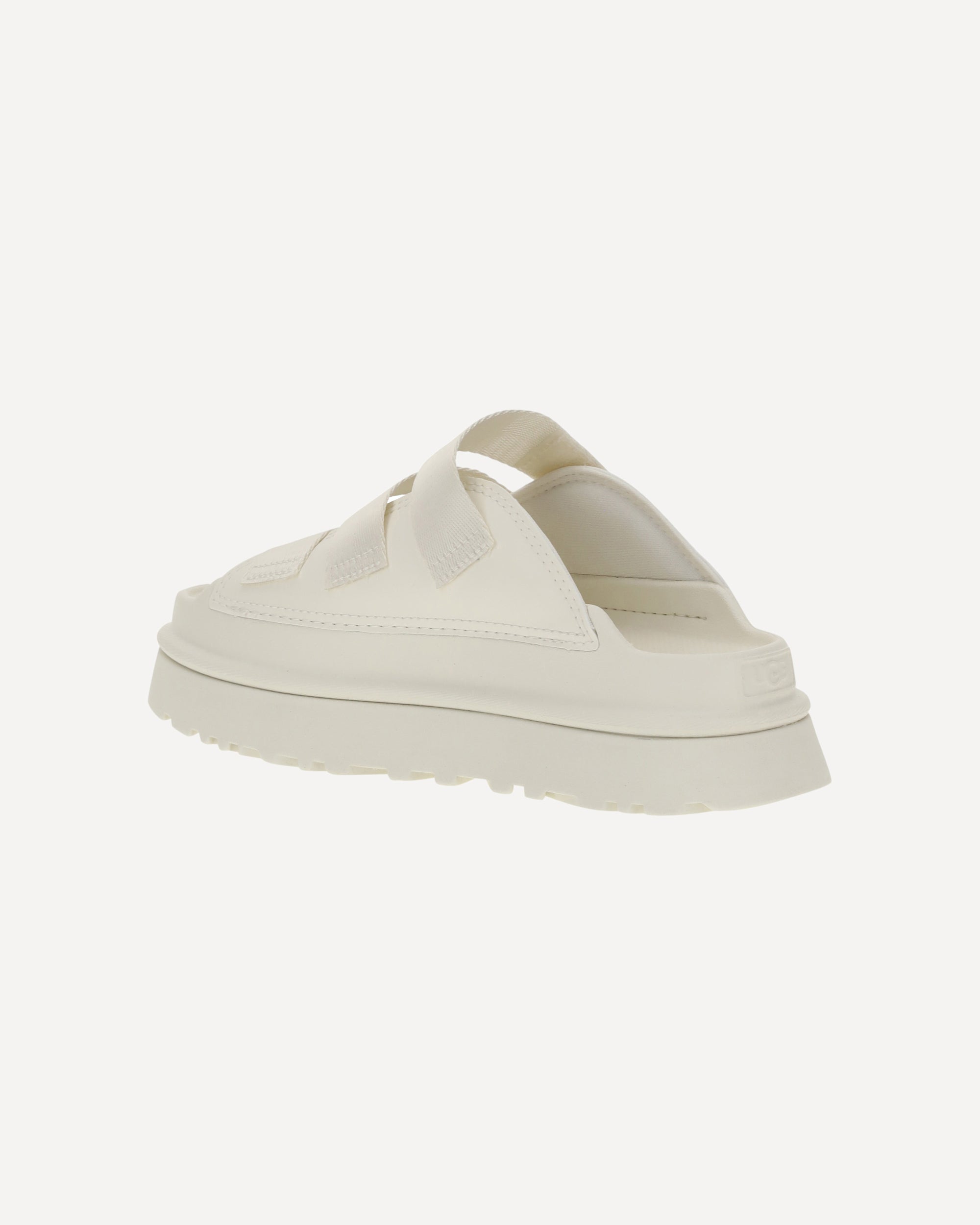 UGG's Goldenglow Sandals combine comfort and style in a modern, casual design. Featuring a round toe and a practical Velcro strap closure, they ensure an adjustable and stable fit. The platform sole gives height without sacrificing comfort, while the branded insole completes the model with an iconic touch.