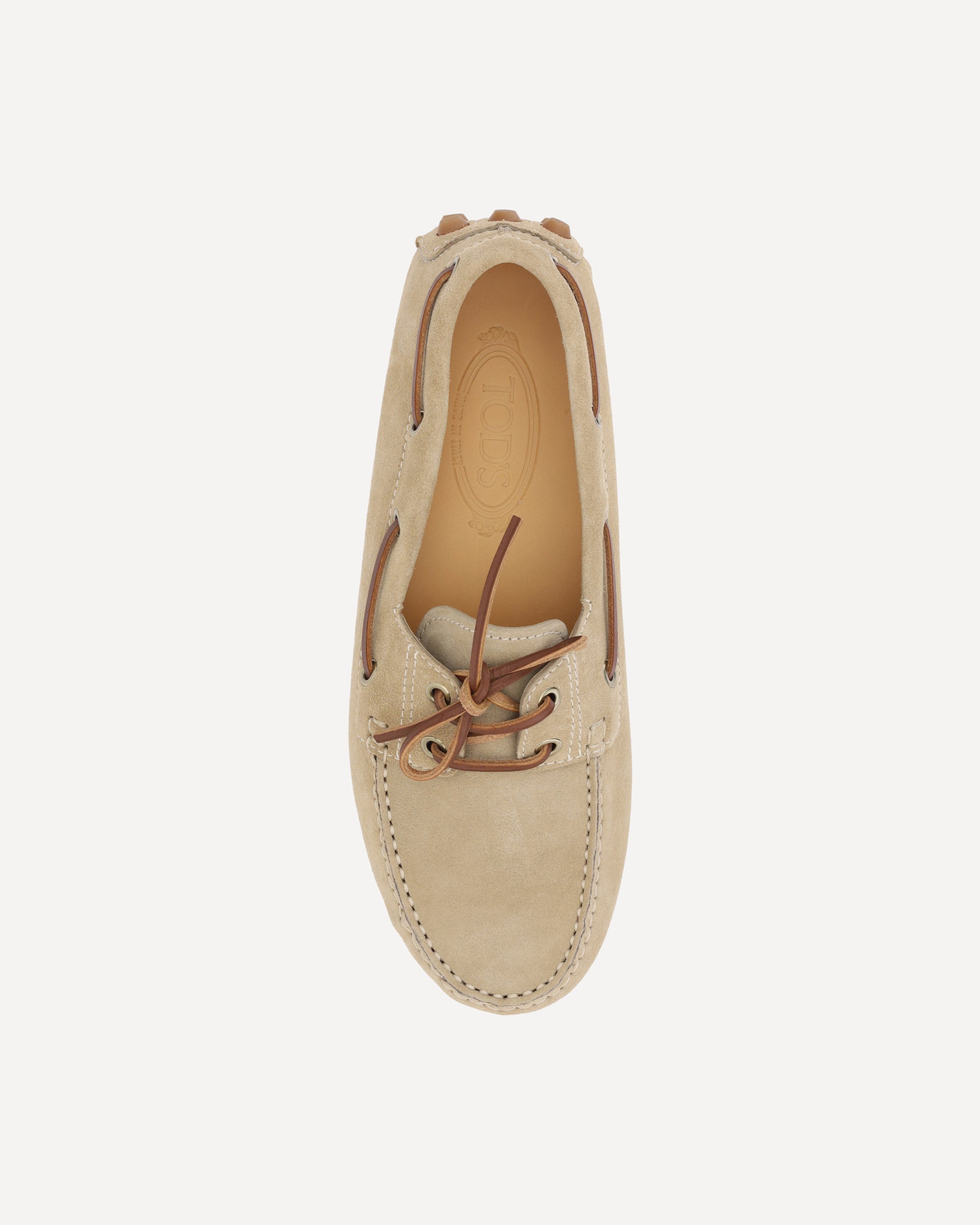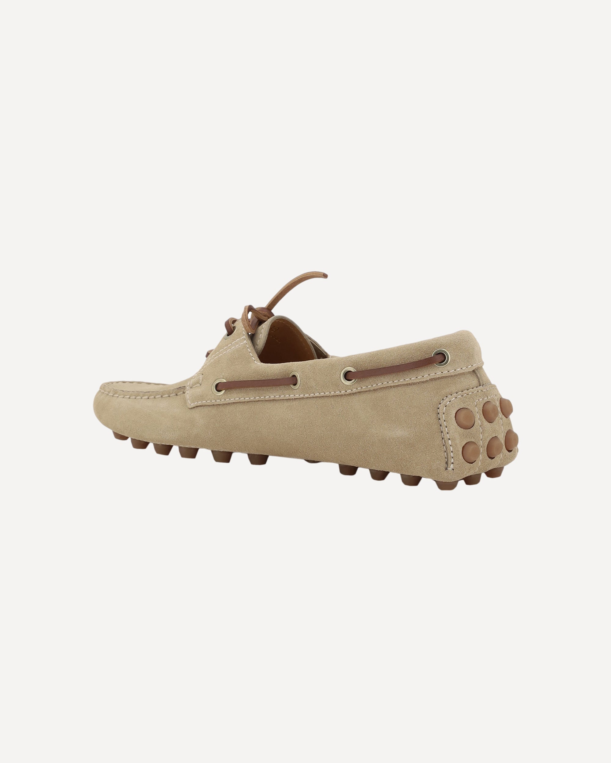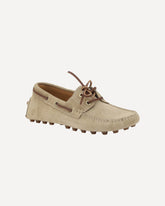 Tod's Gommino Loafers in suede are a perfect combination of refinement and comfort. The soft, high-quality suede gives the model an elegant texture and a luxurious feel to the touch. The design is enriched by the lace-up, which adds a touch of style and character, while the round toe provides extra comfort, adapting perfectly to the shape of the foot. Inside, the embossed logo testifies to the authenticity of the brand and its craftsmanship. The Gommini sole, distinctive of Tod's, offers extraordinary grip, ensuring stability and a pleasant walk. These loafers are ideal for a sophisticated yet informal look, perfect for those seeking elegance and functionality in a single accessory.
