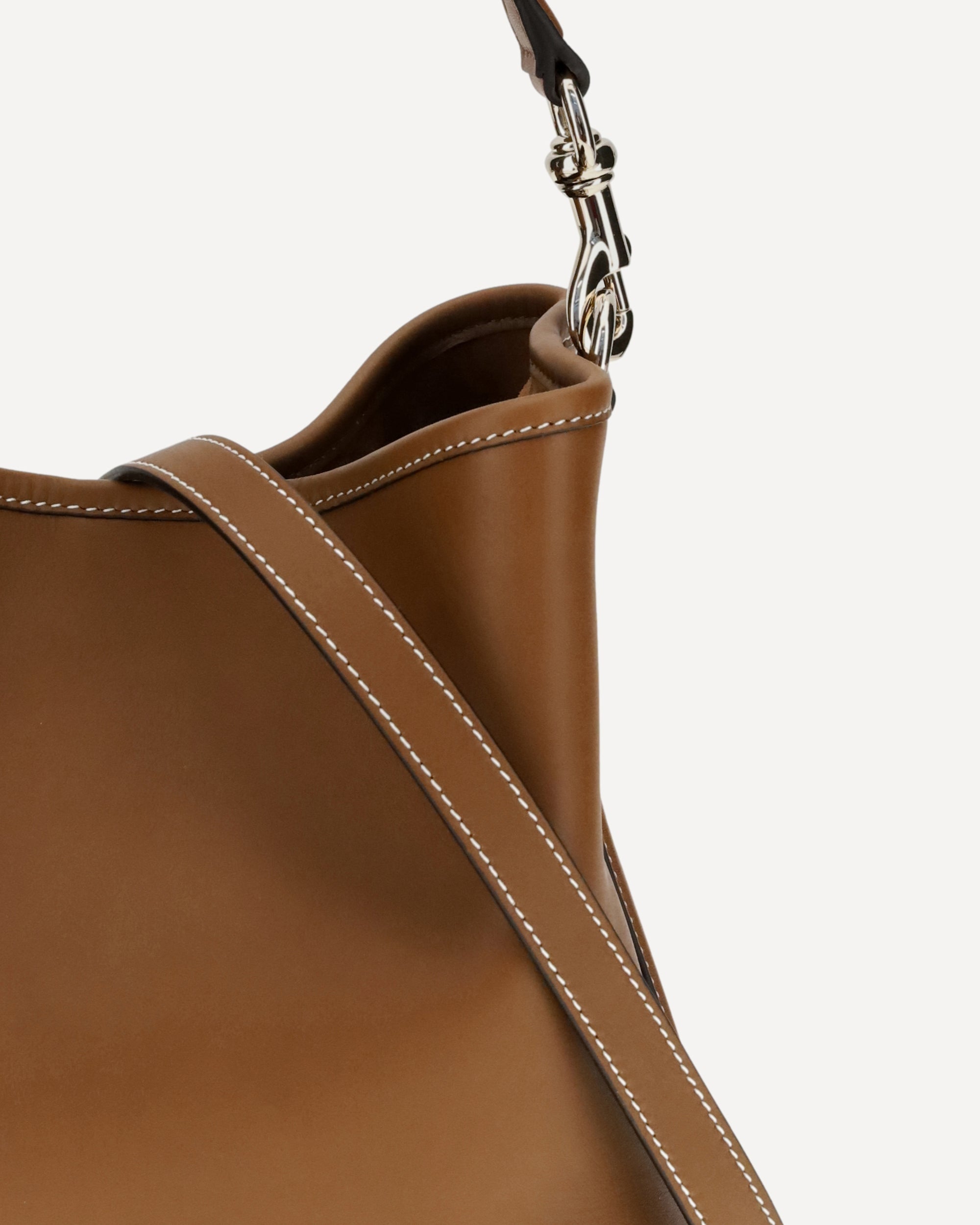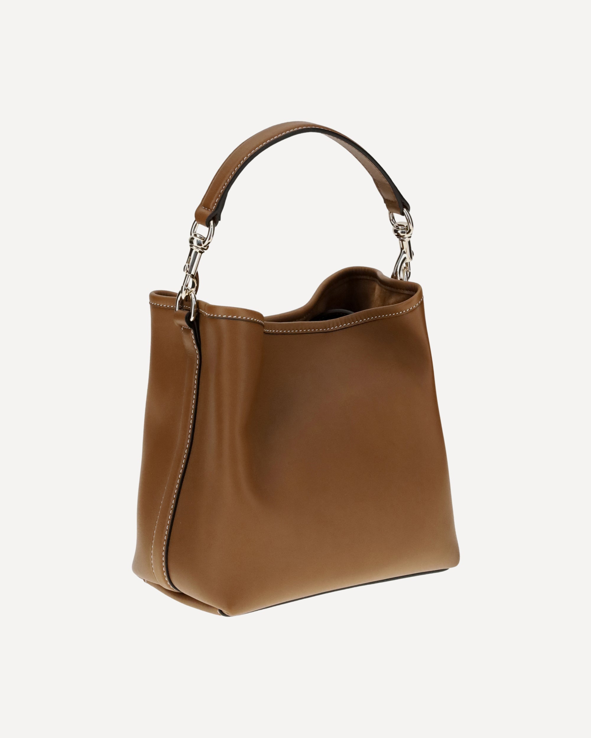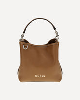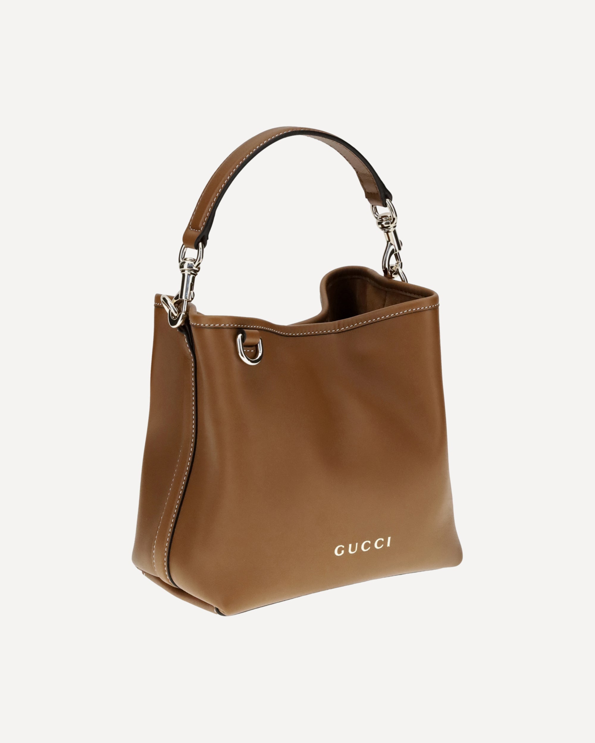 Gucci's GG Emblem Leather Bucket Bag combines functionality and sophistication in a compact yet roomy design. Made of smooth leather, it features a removable flat leather handle with hook closure and an additional D-ring for detachable accessories. The interior is organized into two side compartments and a center compartment with snap closure, offering practicality and order. A detachable and adjustable leather shoulder strap and an automatic magnetic closure complete the design. A stylish and versatile model, perfect for everyday use.