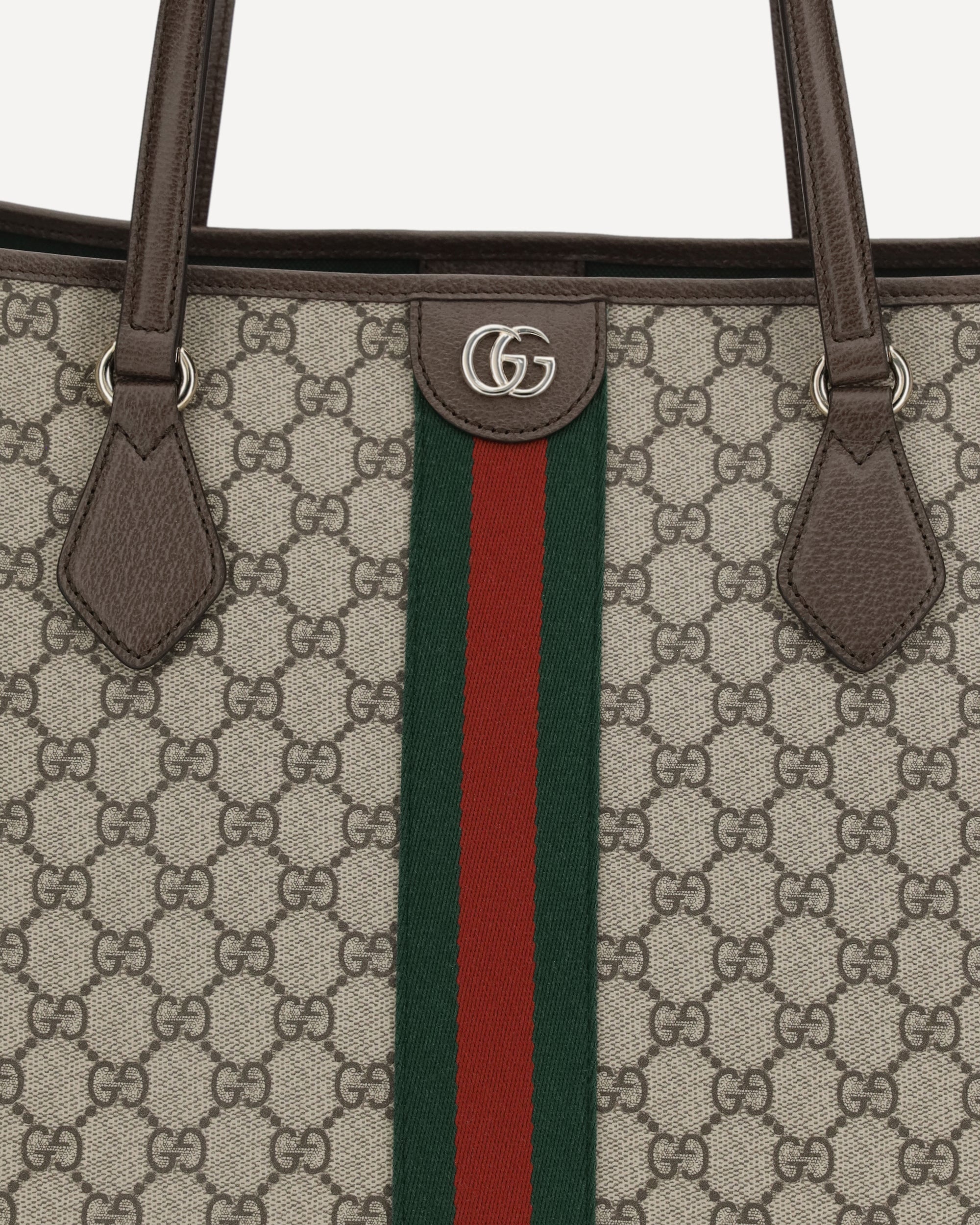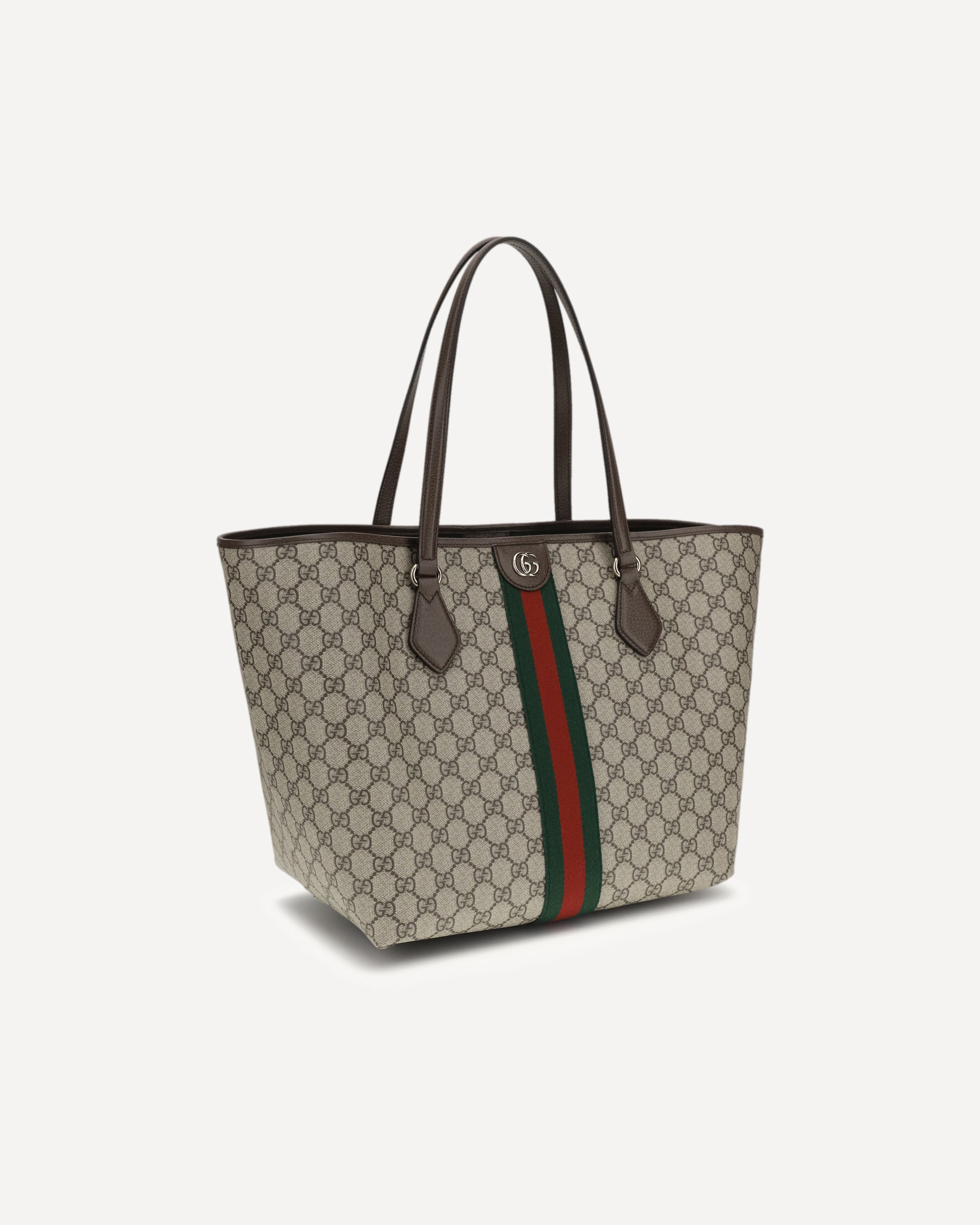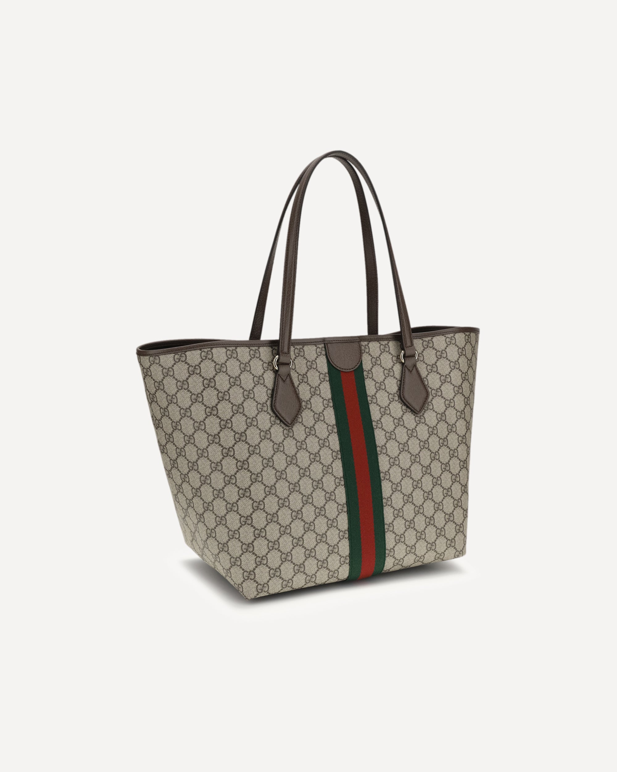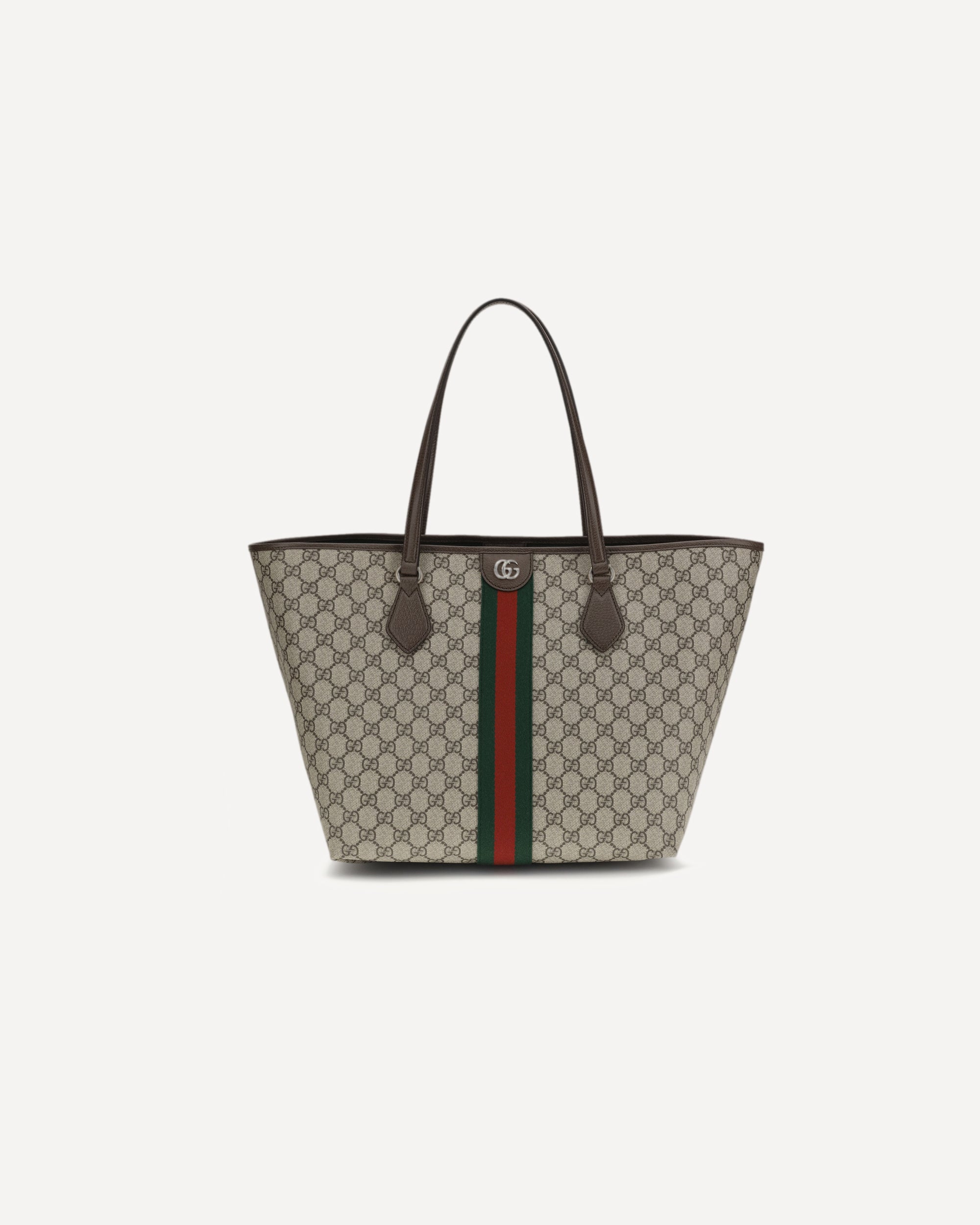 The Ophidia Tote Bag by Gucci is a symbol of timeless elegance, perfect for those looking for a versatile and refined accessory. Made from fabric covered with the famous GG monogram, it features leather trims and light gold-tone metal details that enhance its quality. The cotton lining ensures comfort and durability, while the double G and Web ribbon, hallmarks of the brand, complete the iconic design. Inside, the open pocket offers practicality for organizing essential items. An elegant and functional accessory, ideal for any occasion.