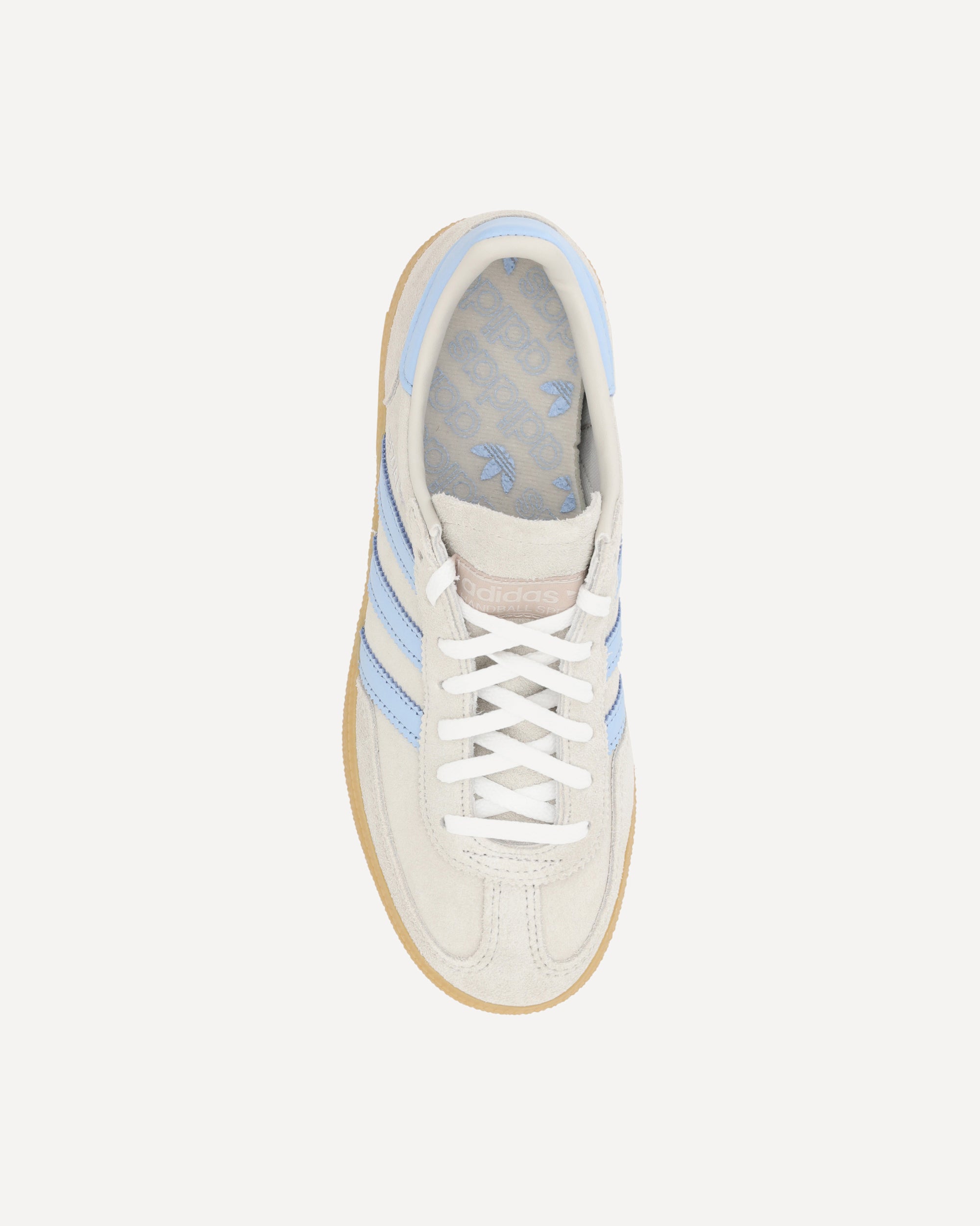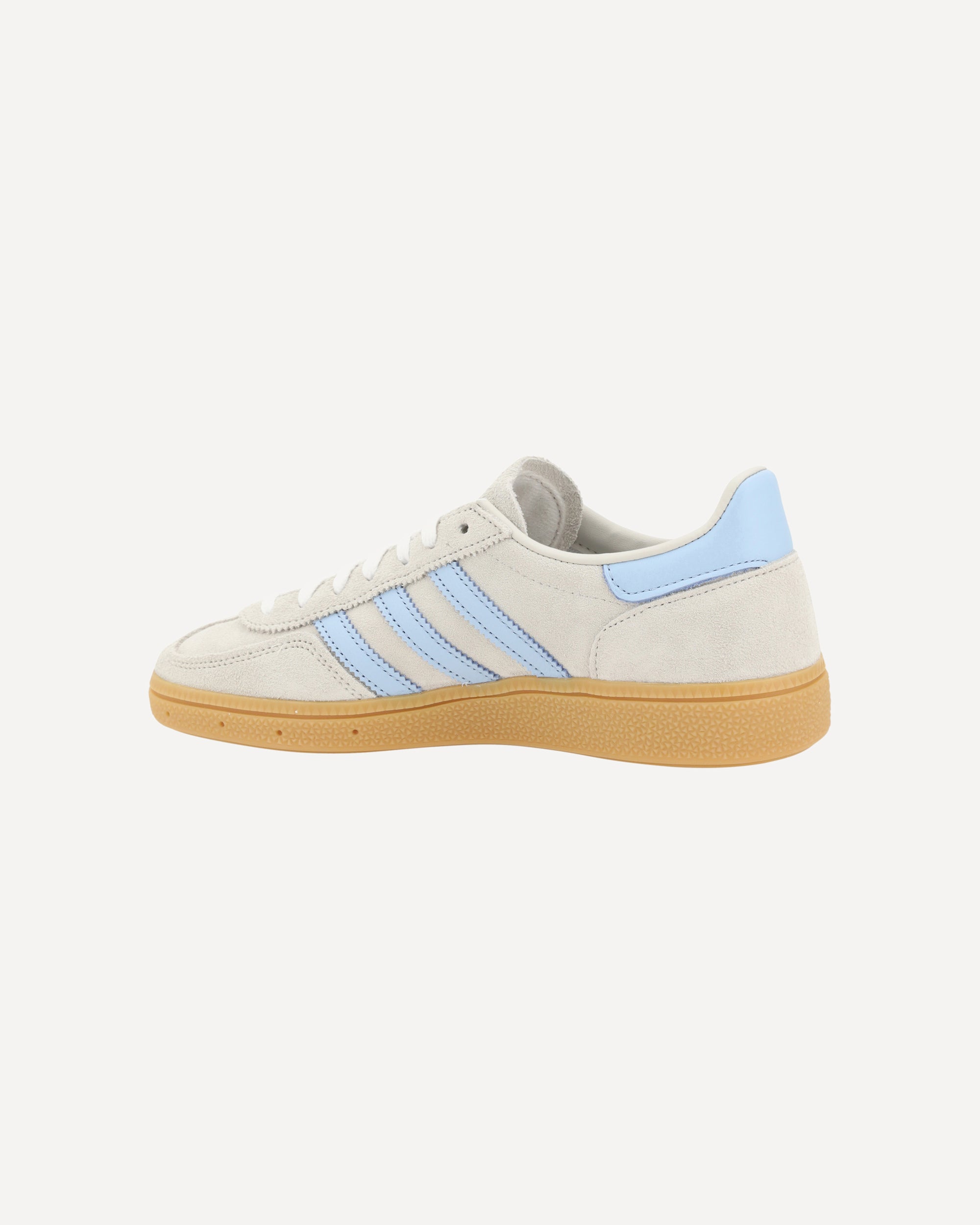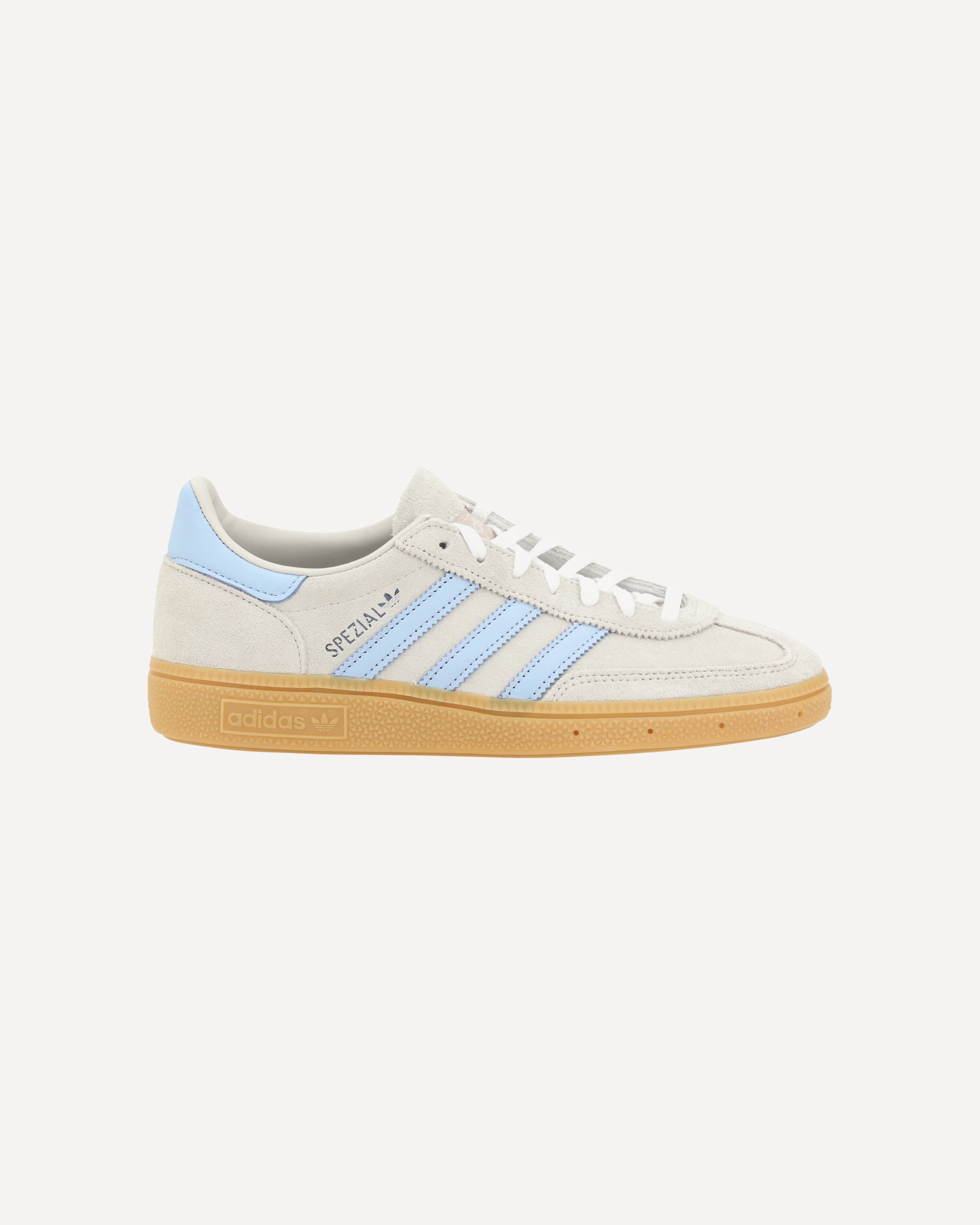 Leather Handball Spezial Sneakers by Adidas featuring an elongated toe, a lace-up front closure, a suede leather design, the brand's iconic oblique bands applied in contrast on the side panels, a press-stamped sneaker pattern on the outer panel, a logo-embroidered label on the front tab, and a flat sole.
