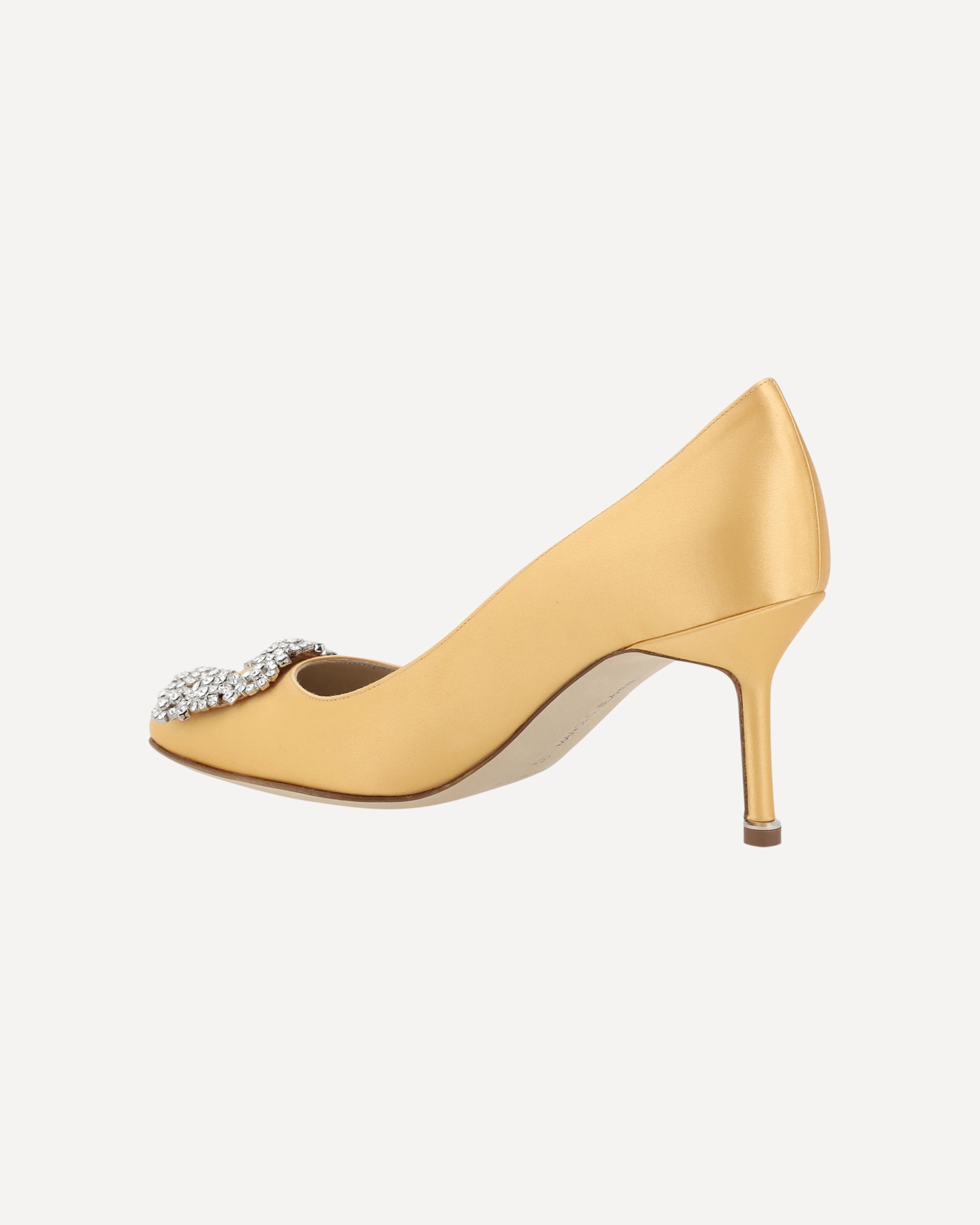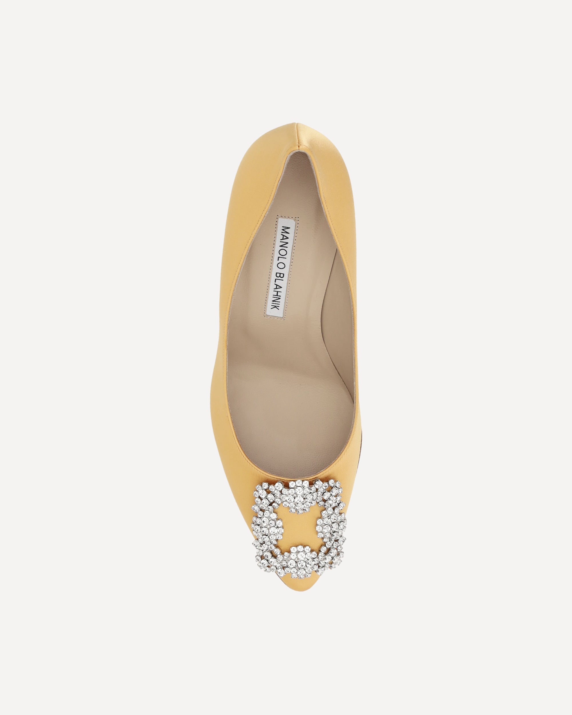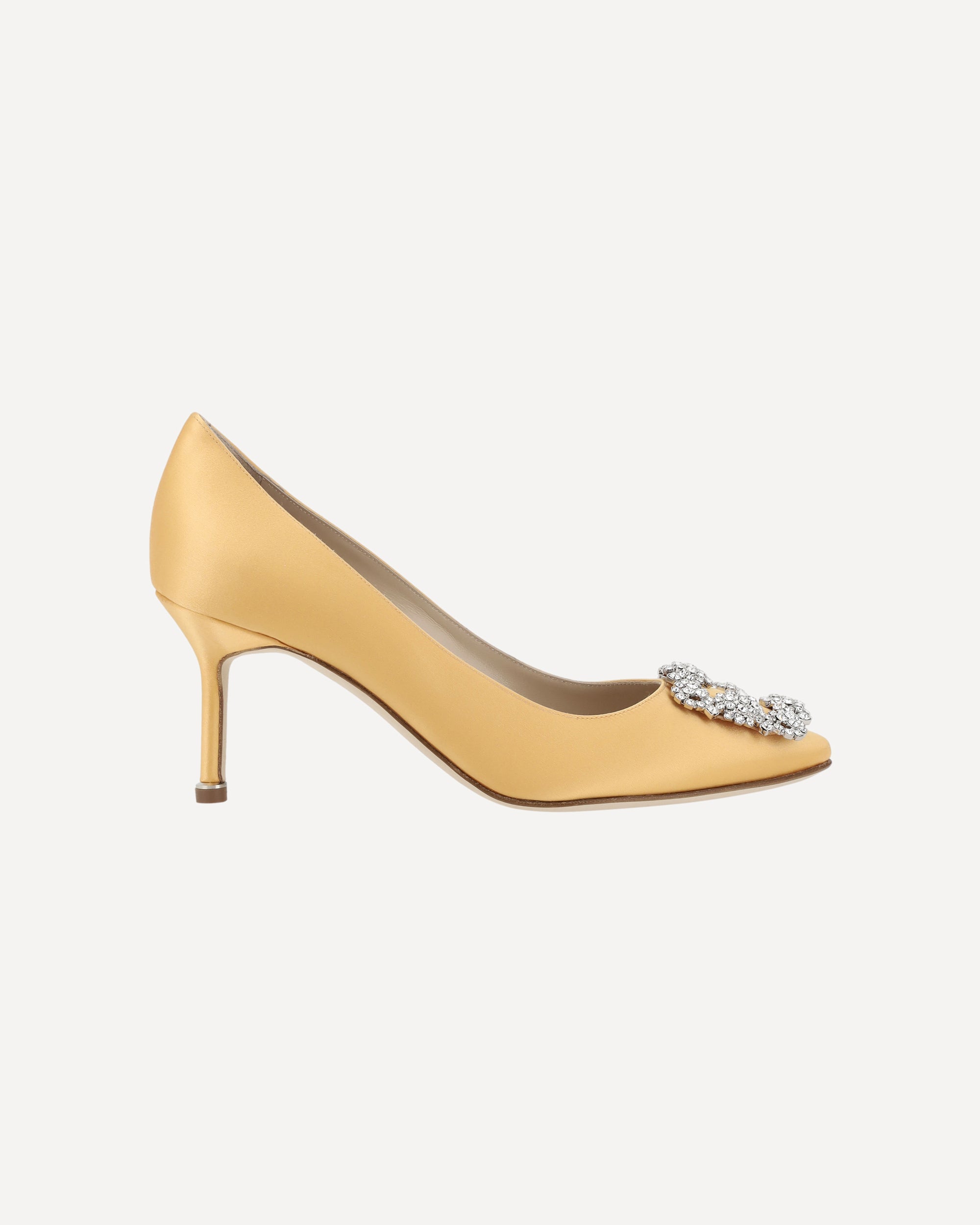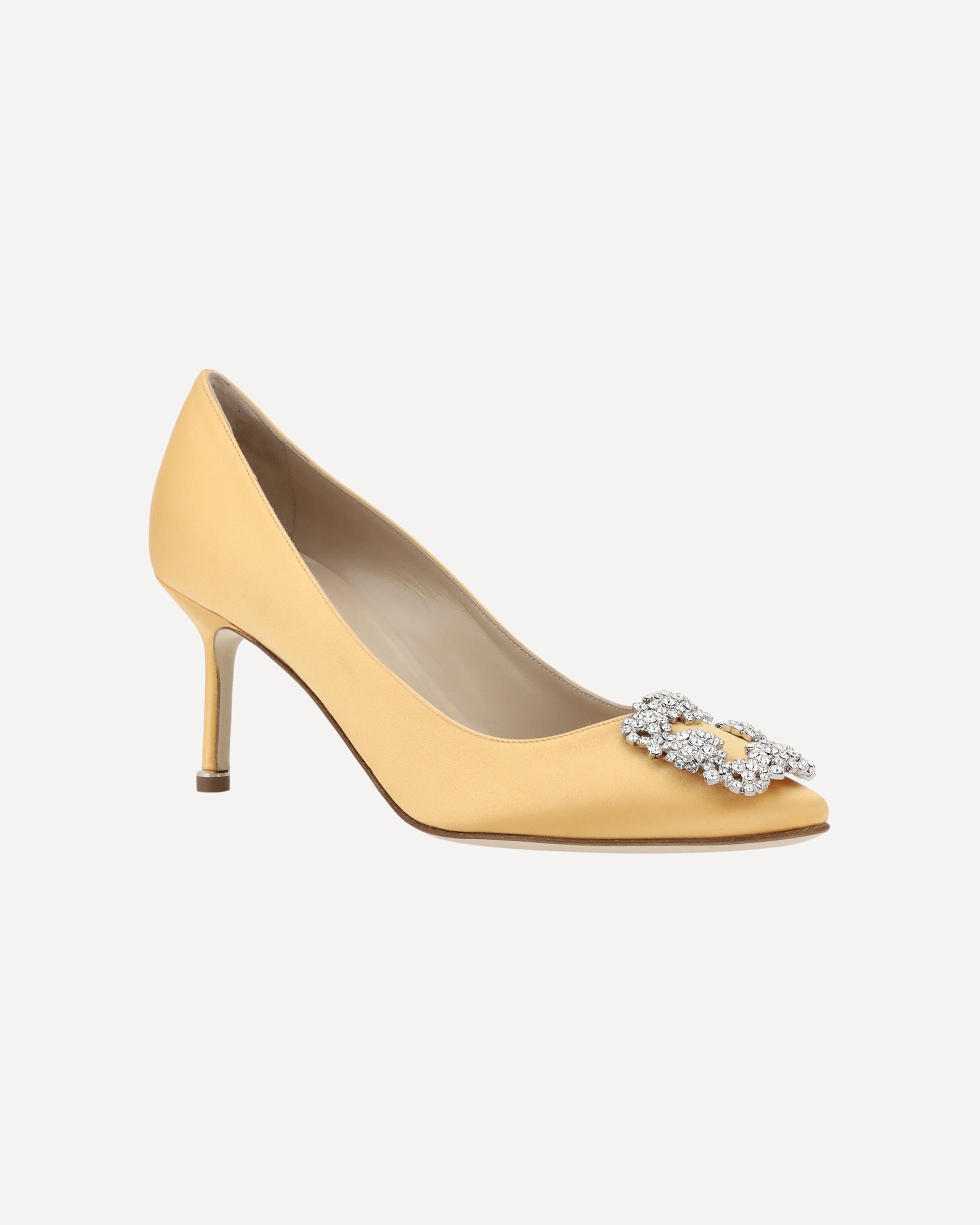 Silk Satin Hangisi Pumps by Manolo Blahnik, almond toe, iconic Swarovski crystal buckle appliqué on front, leather stiletto heel, logo-embossed insole.