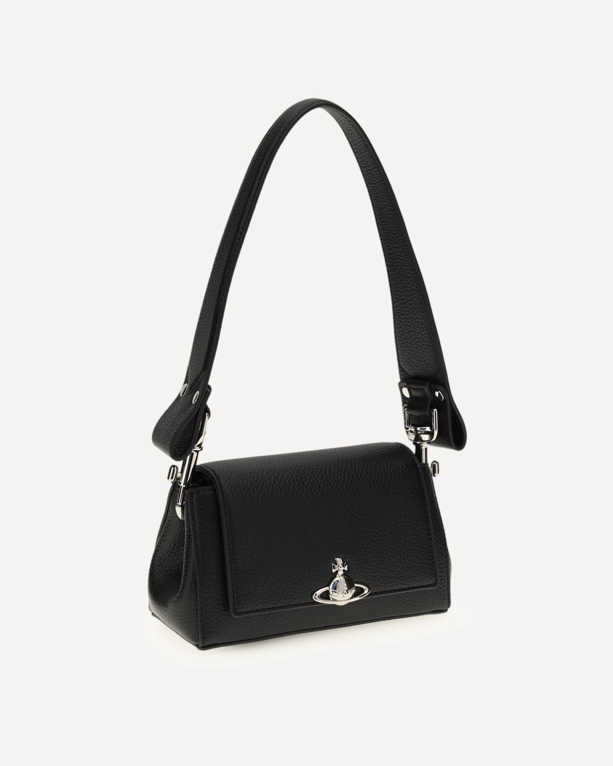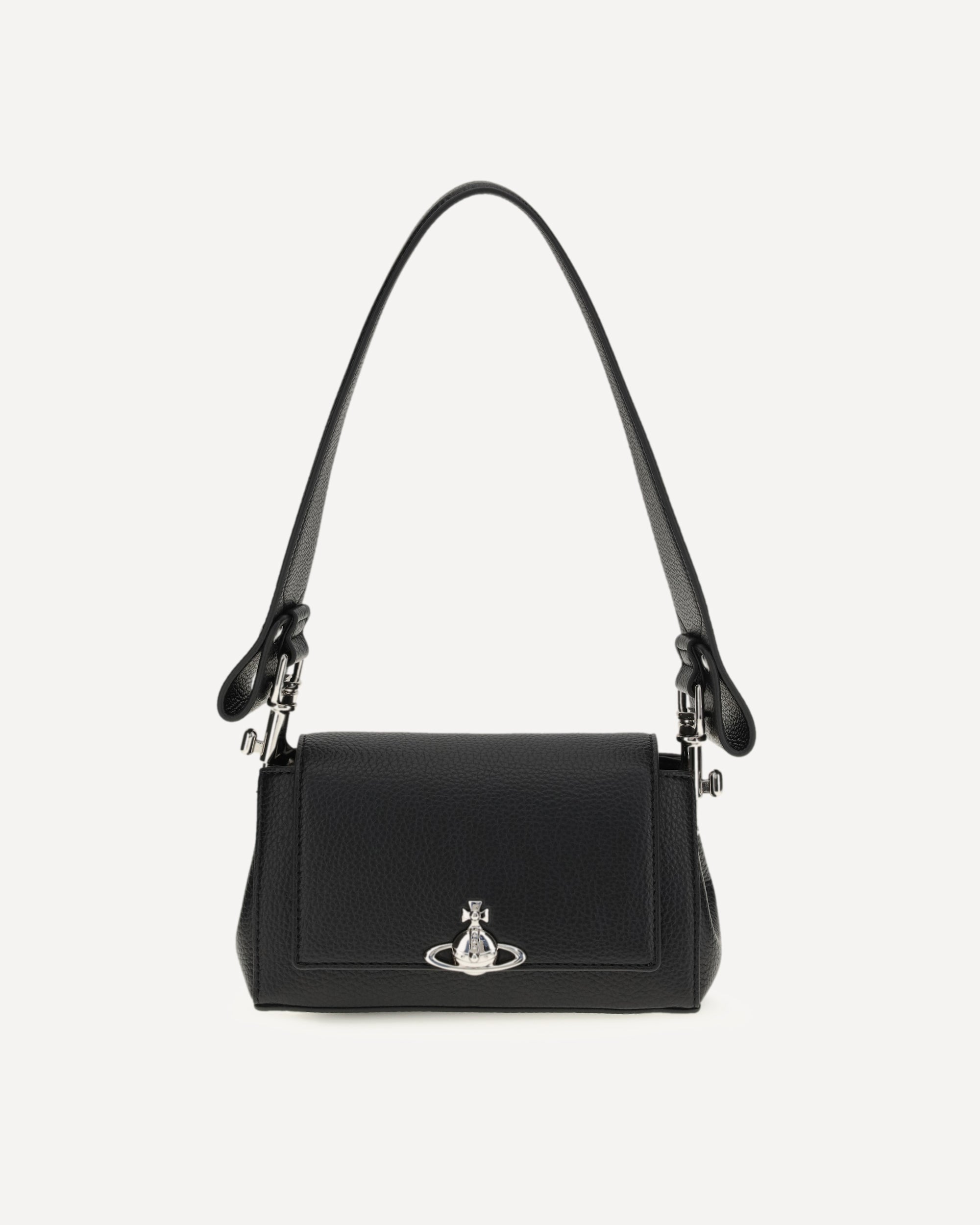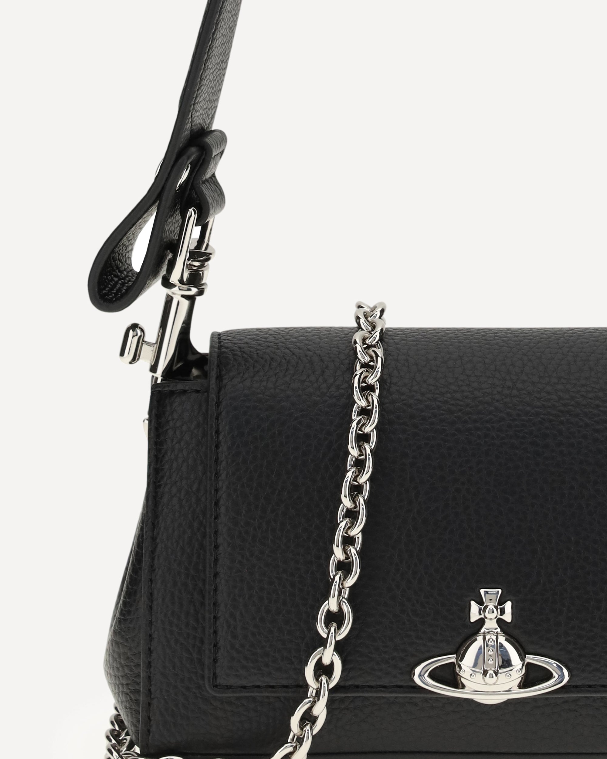 The Orb Shoulder Bag by Vivienne Westwood combines style and versatility in a unique design. Crafted from textured leather, it is embellished with silver-colored hardware and the Orb logo on the flap closure. Featuring a leather handle and a removable chain strap, it can be worn over the shoulder, by hand, or crossbody, adapting to any occasion with elegance.